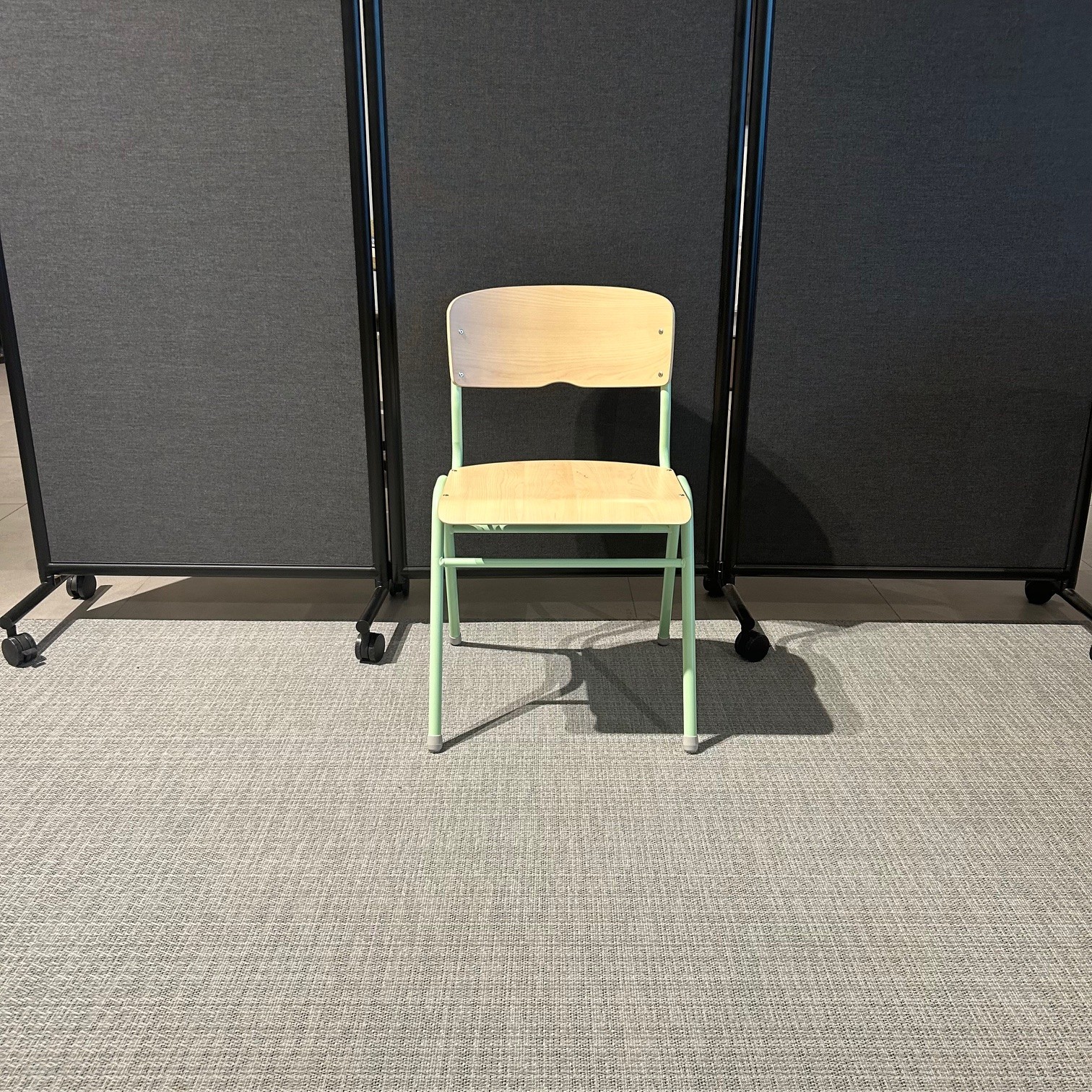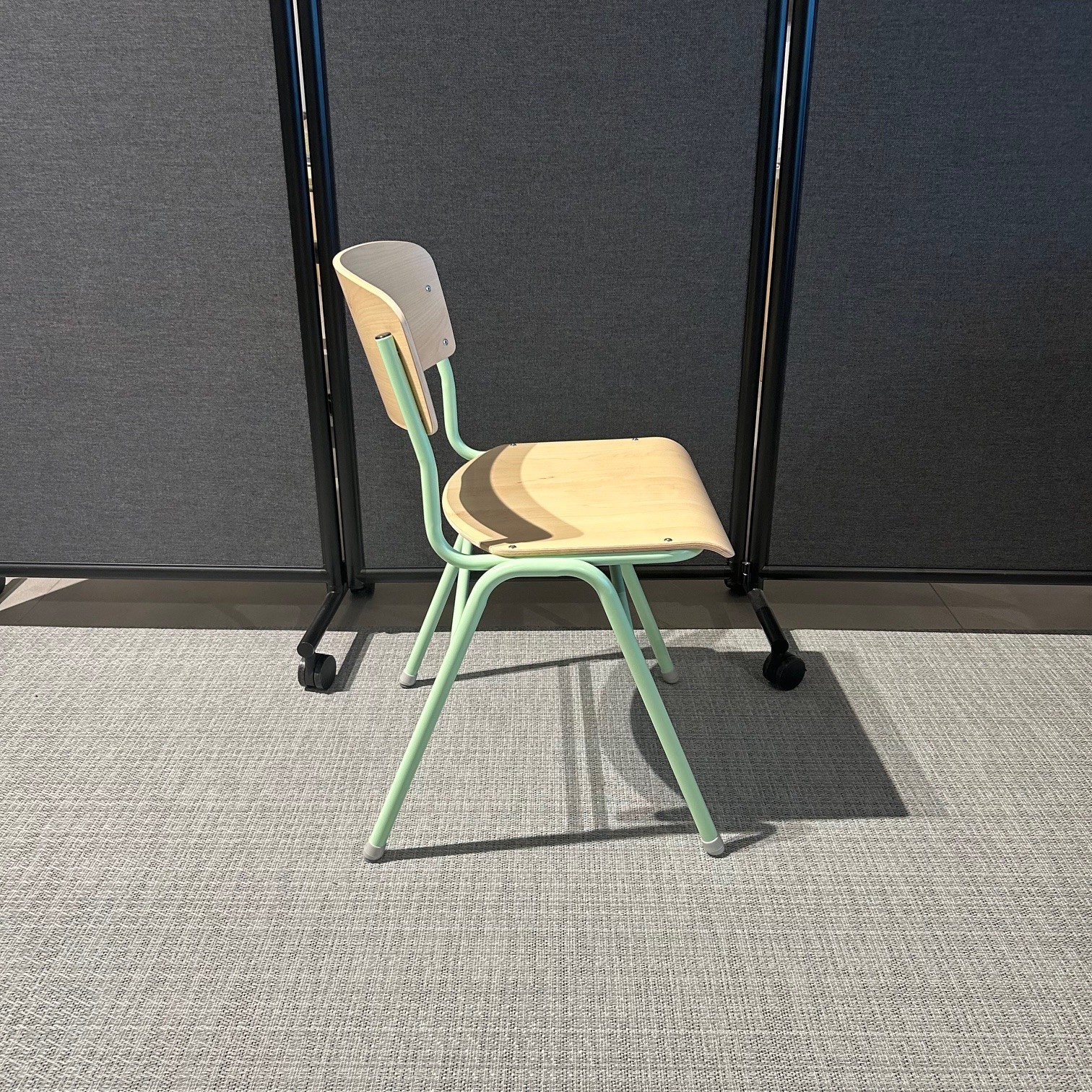 Seat and backrest in laminat (birch). Legs in metal (green).