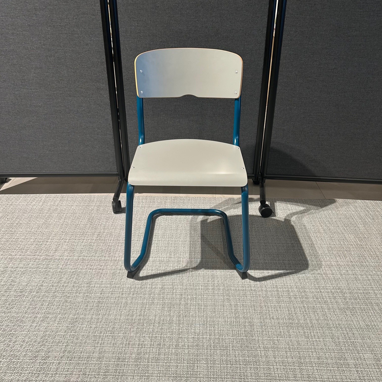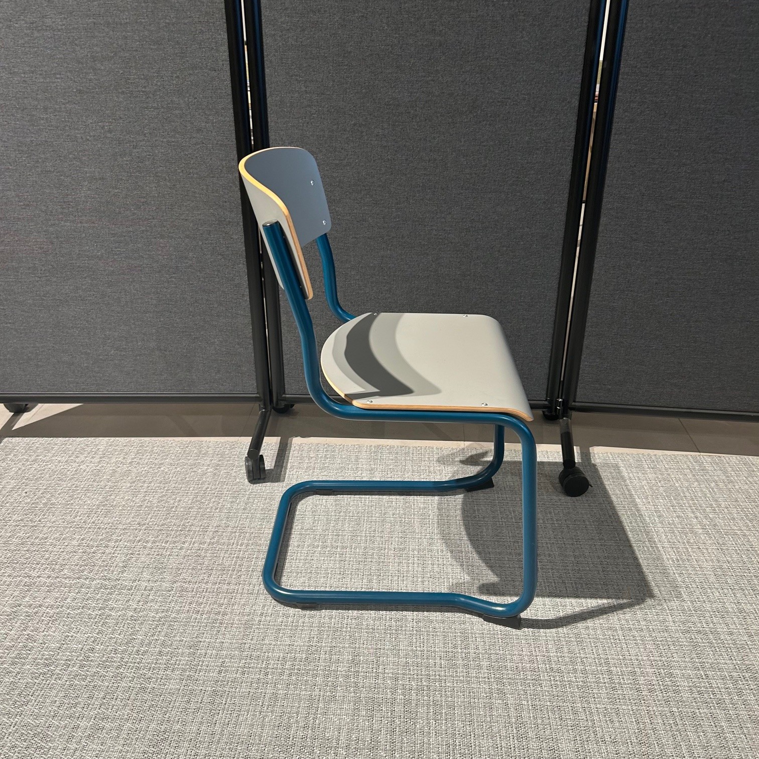 Seat and backrest in laminat (grey). Sledgebase in metal (blue).