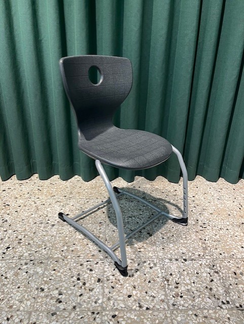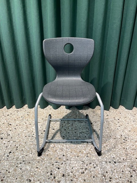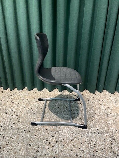 Seat and backrest in plastic. Sledgebase in metal (grey).