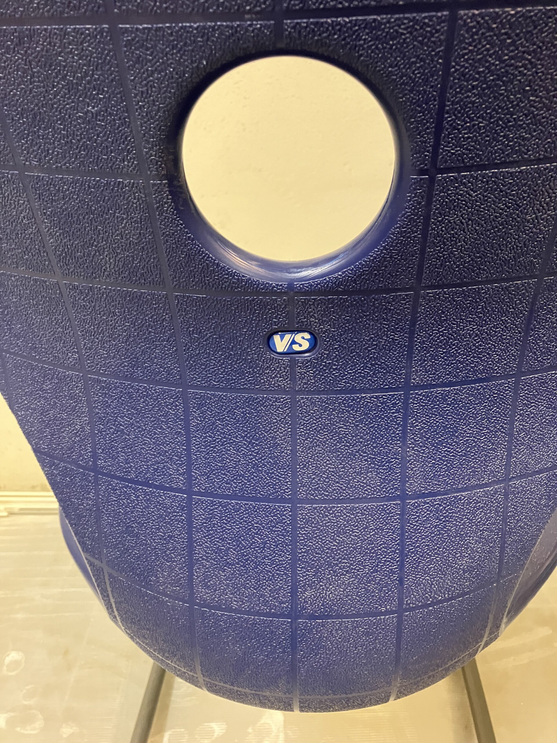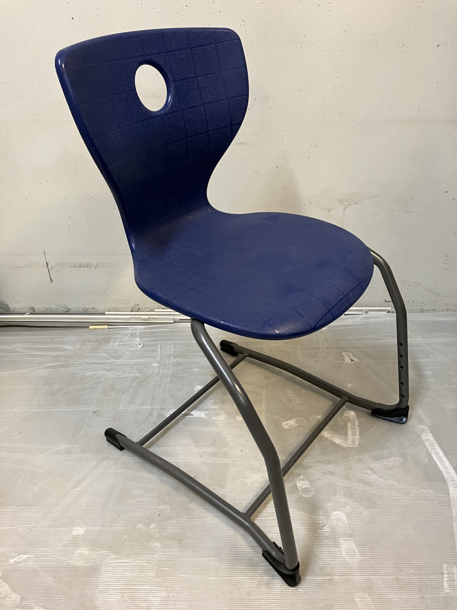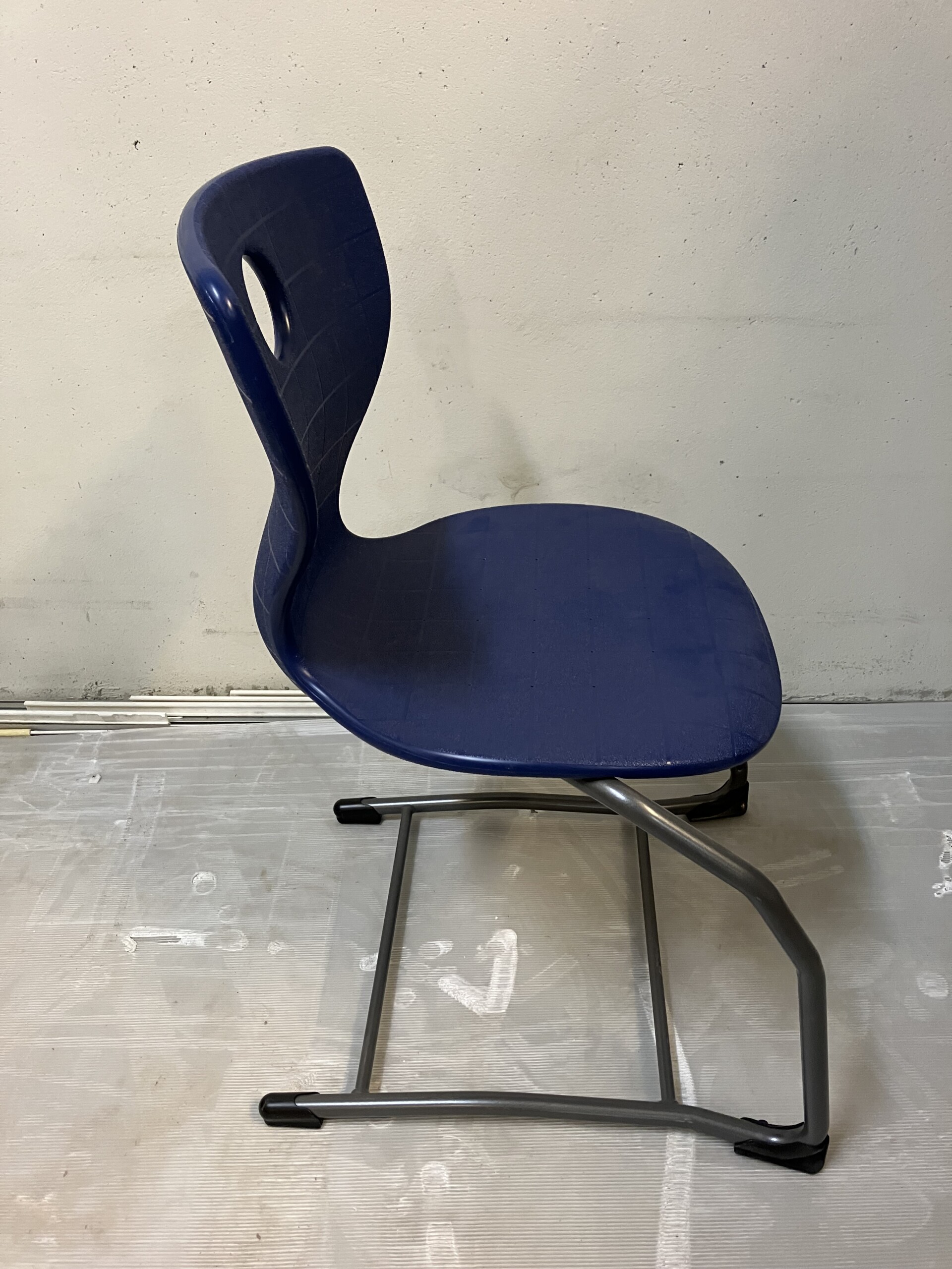 Seat and backrest in plastic (blue). Sledgebase in metal (grey).