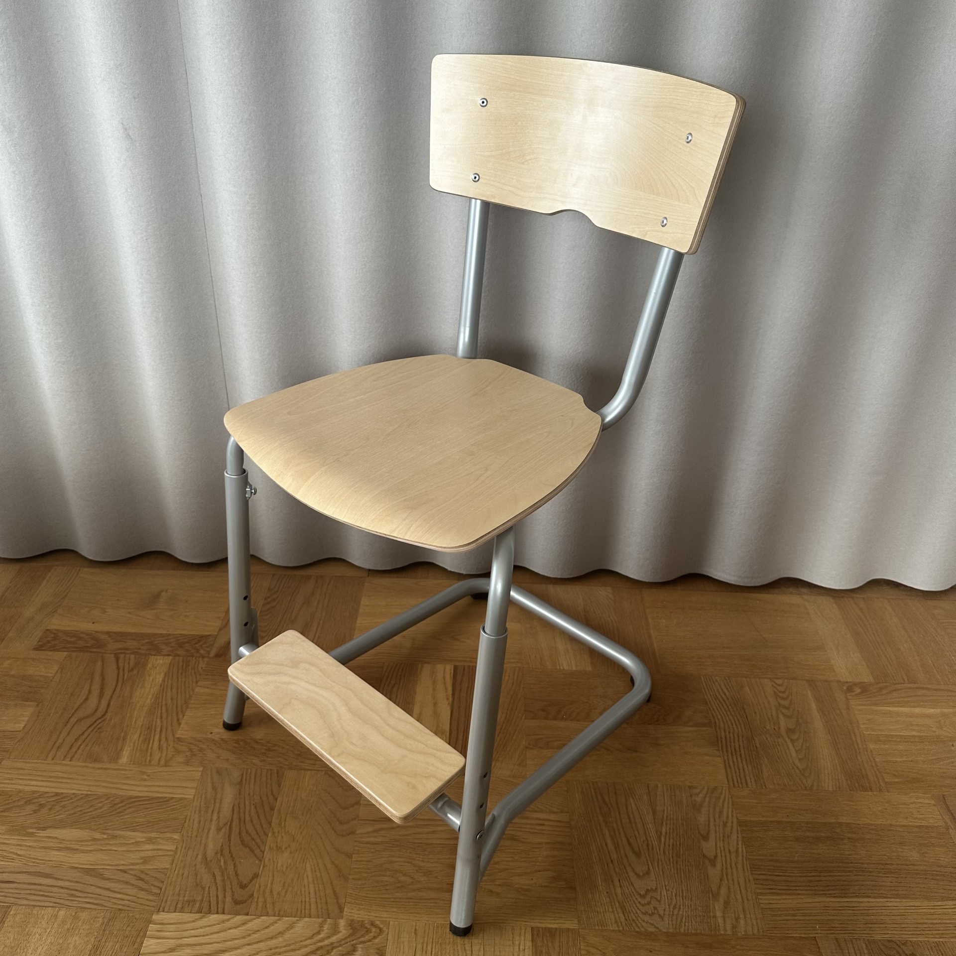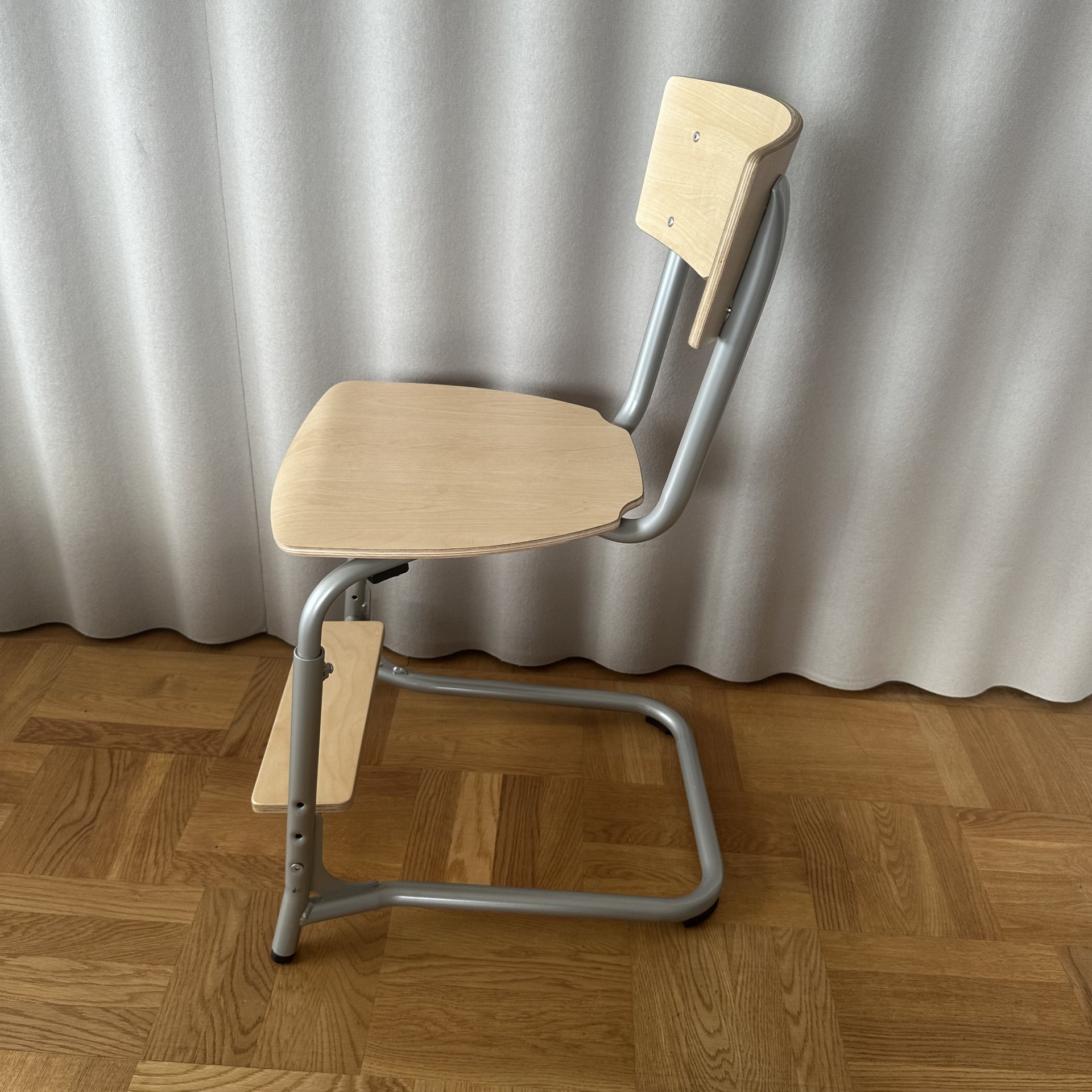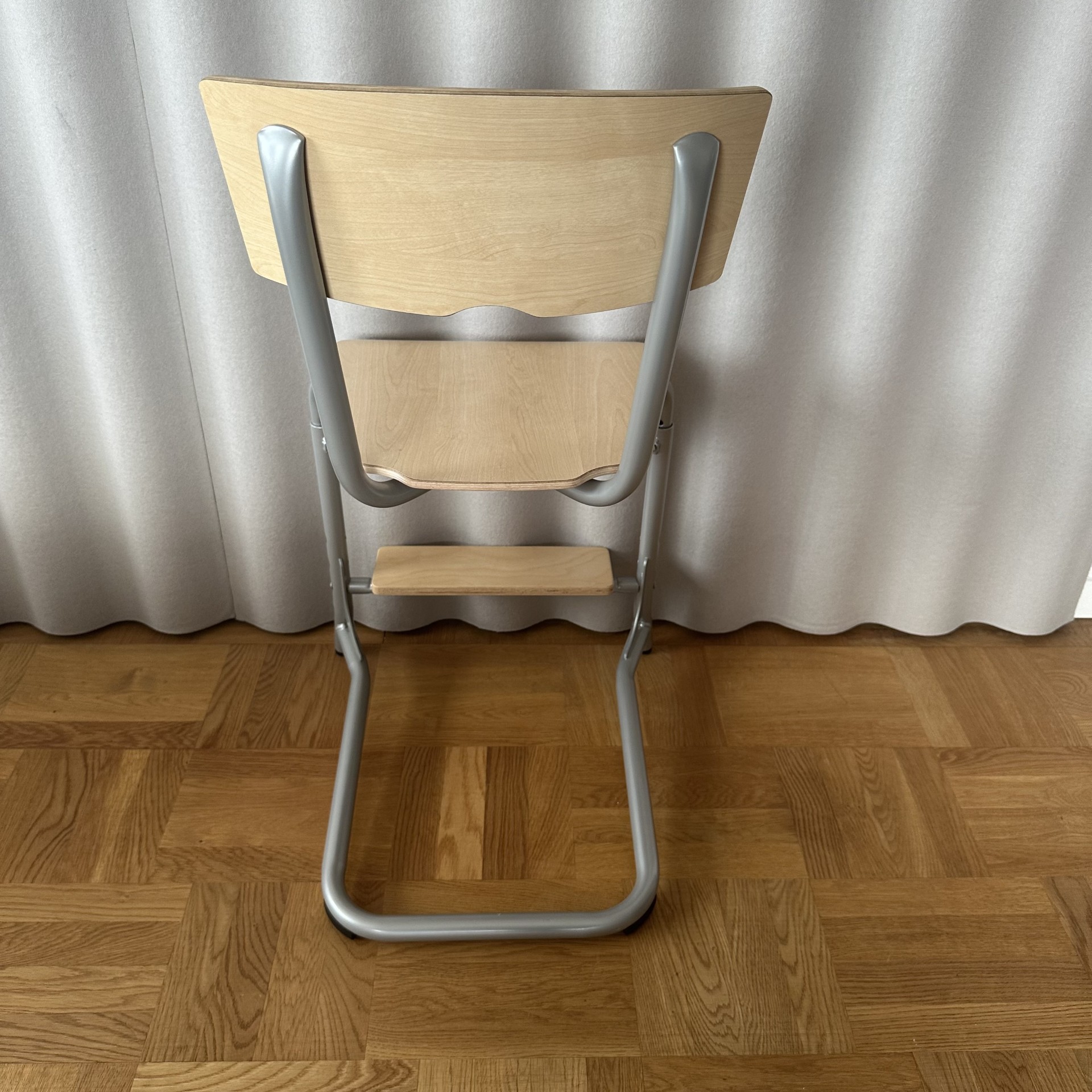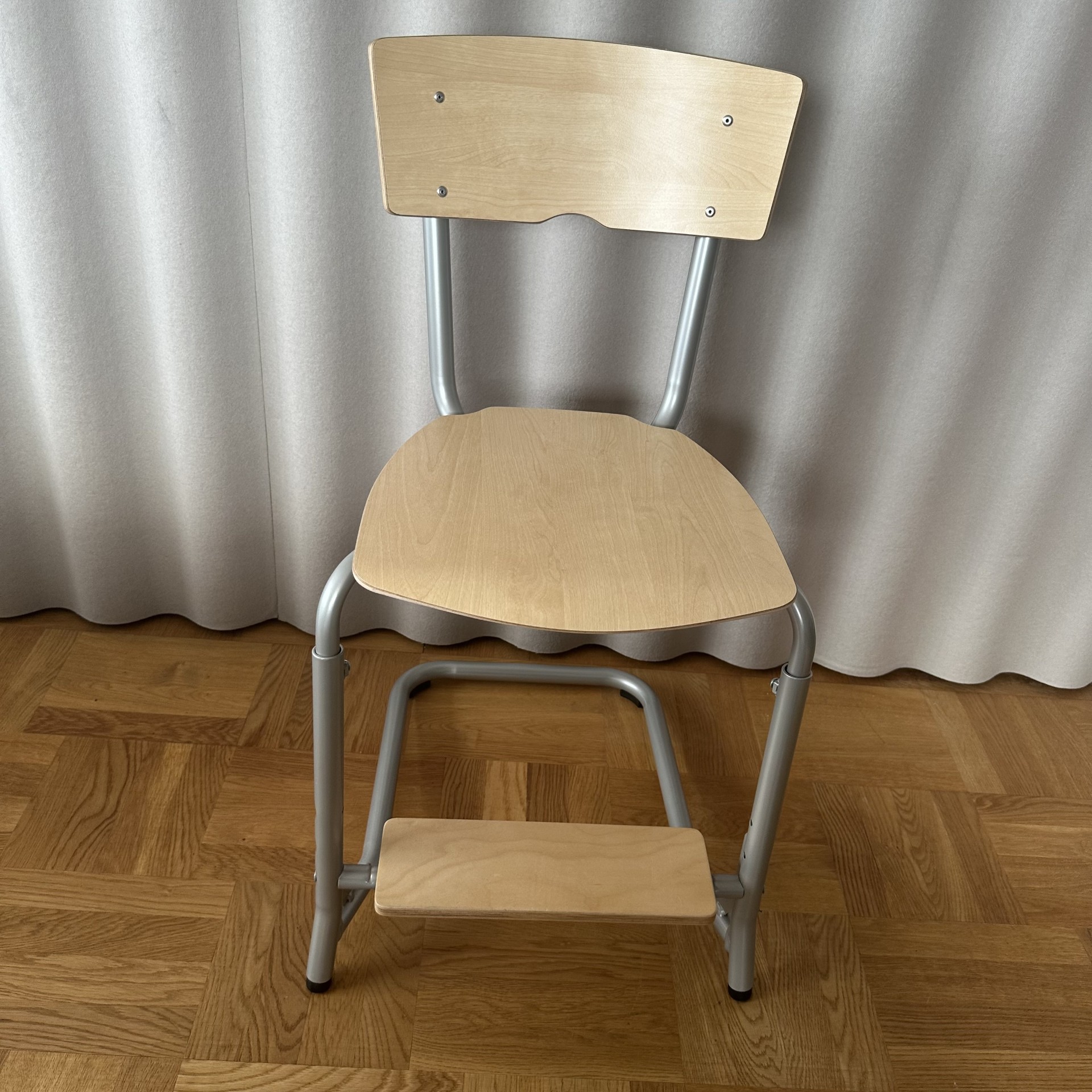 Seat and backrest in laminat (birch). Sledgebase in metal (silver).