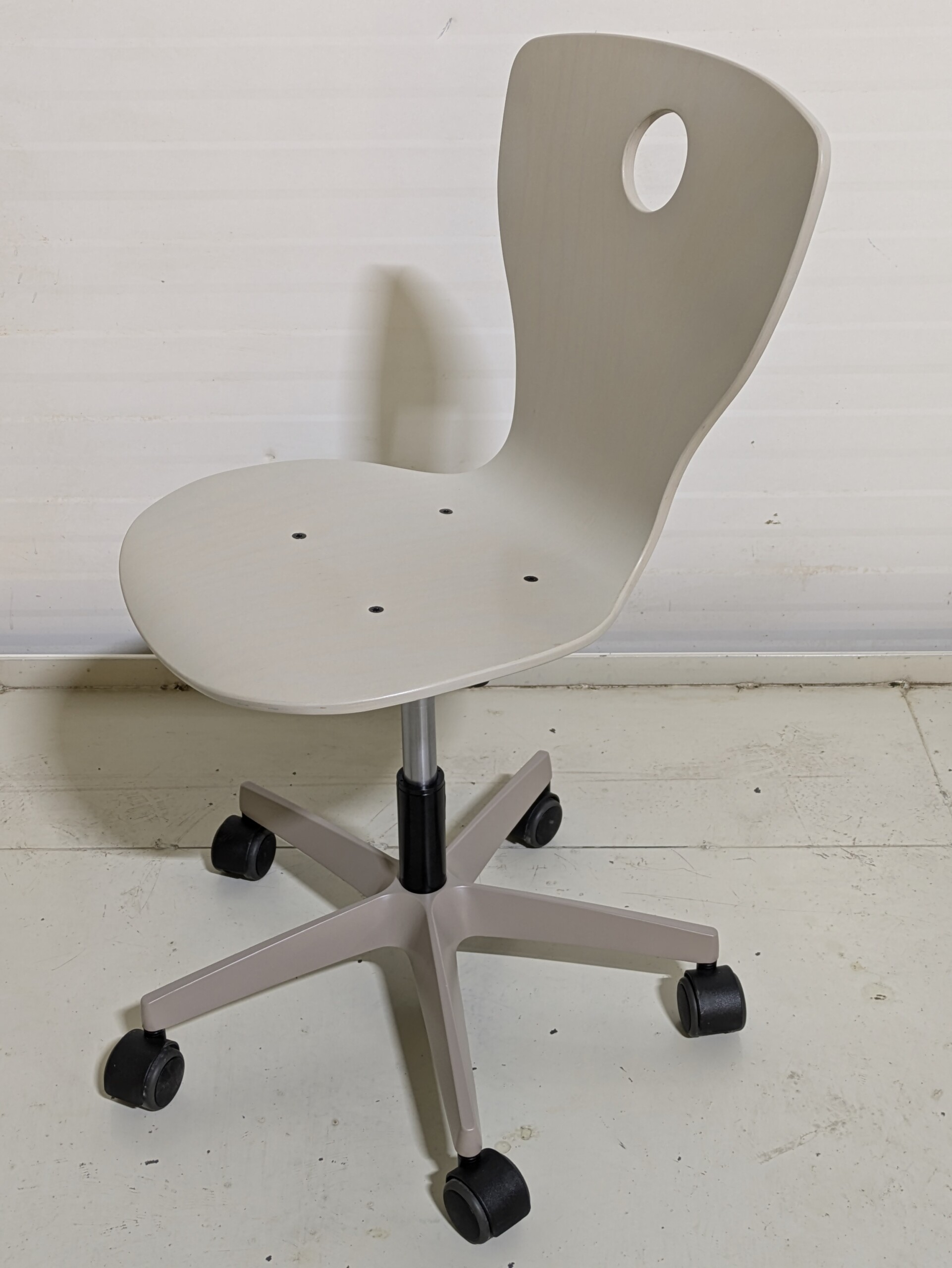 Seat and backrest in wood (grey). Star base in metal (grey).
