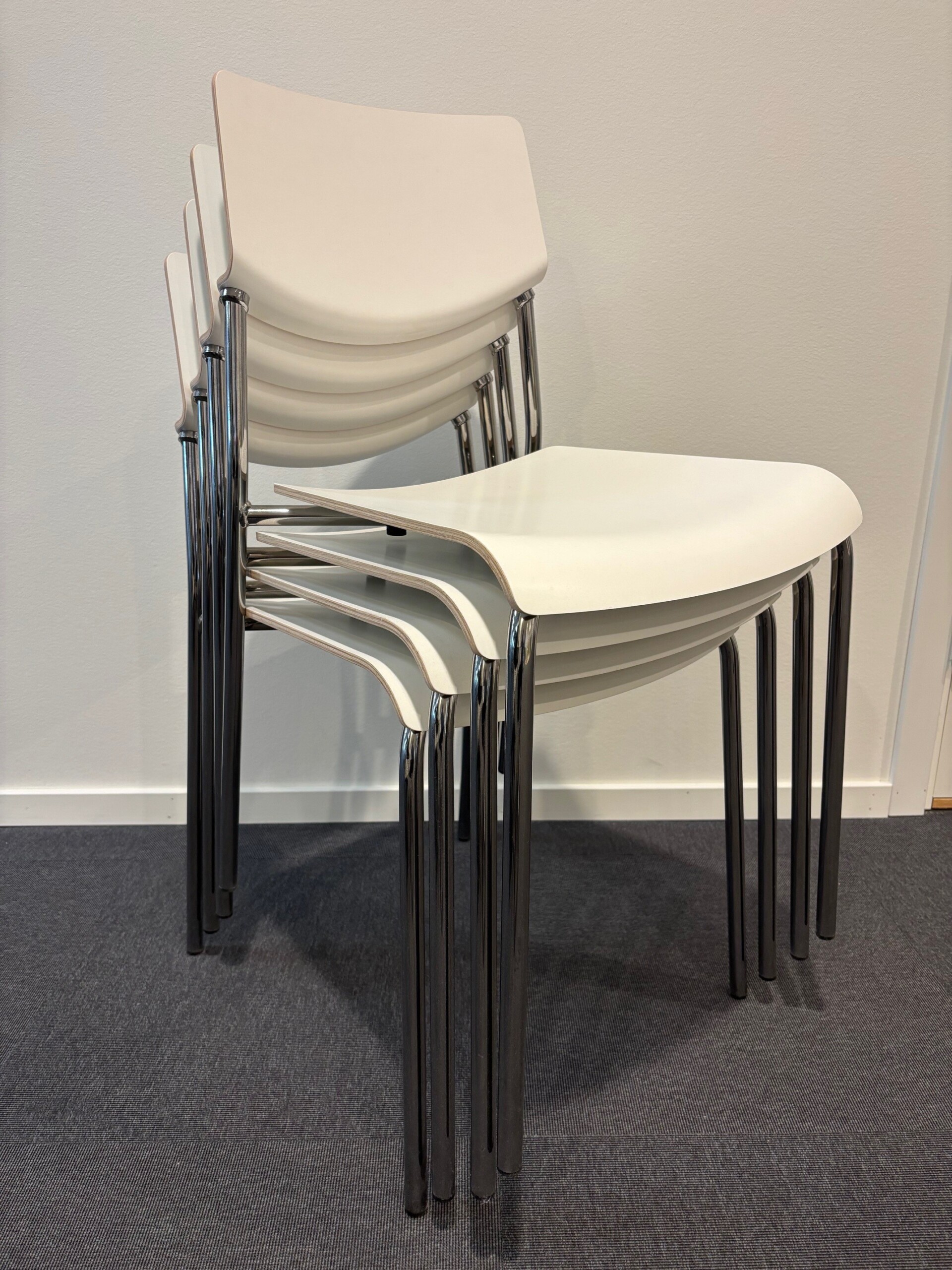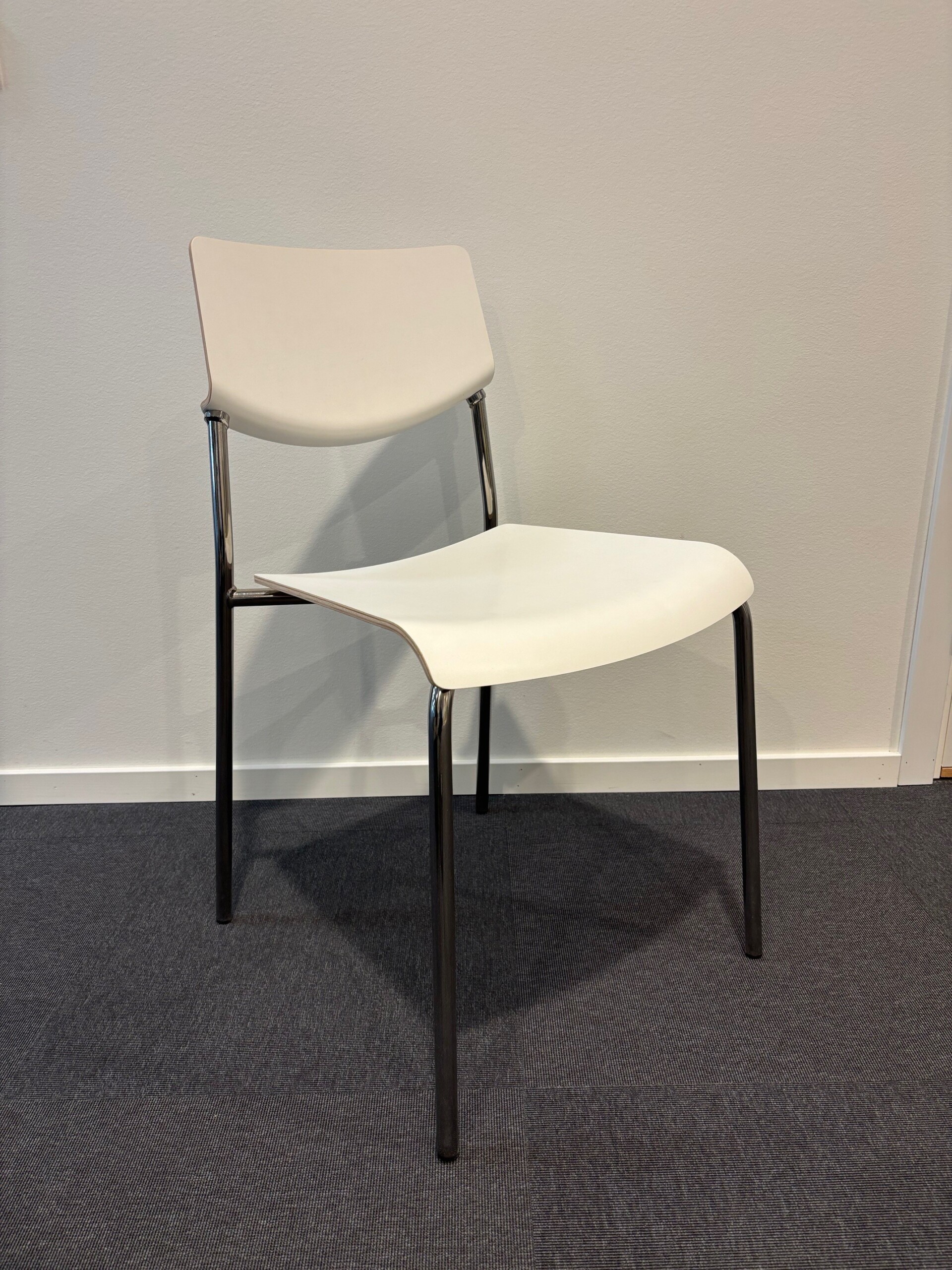 Seat and backrest in wood (white). Legs in metal (chrome).