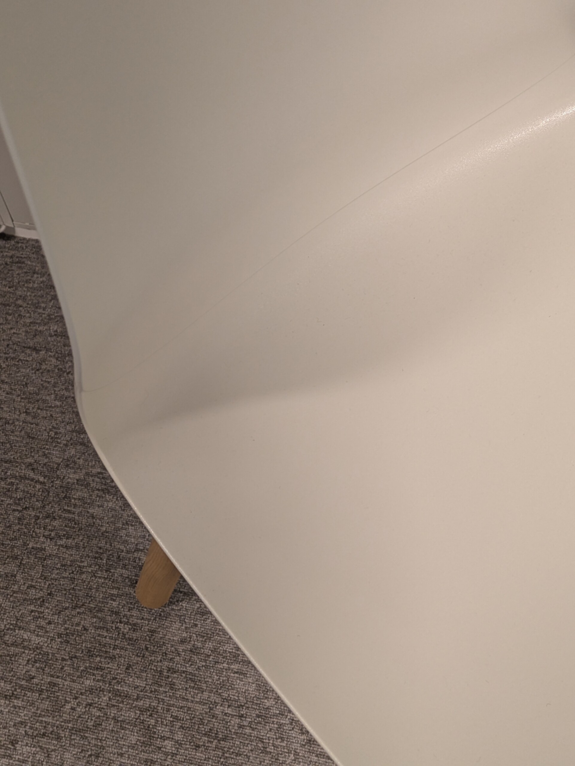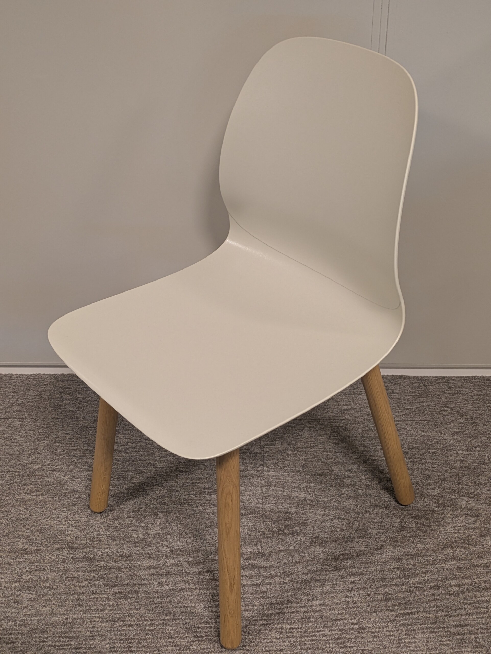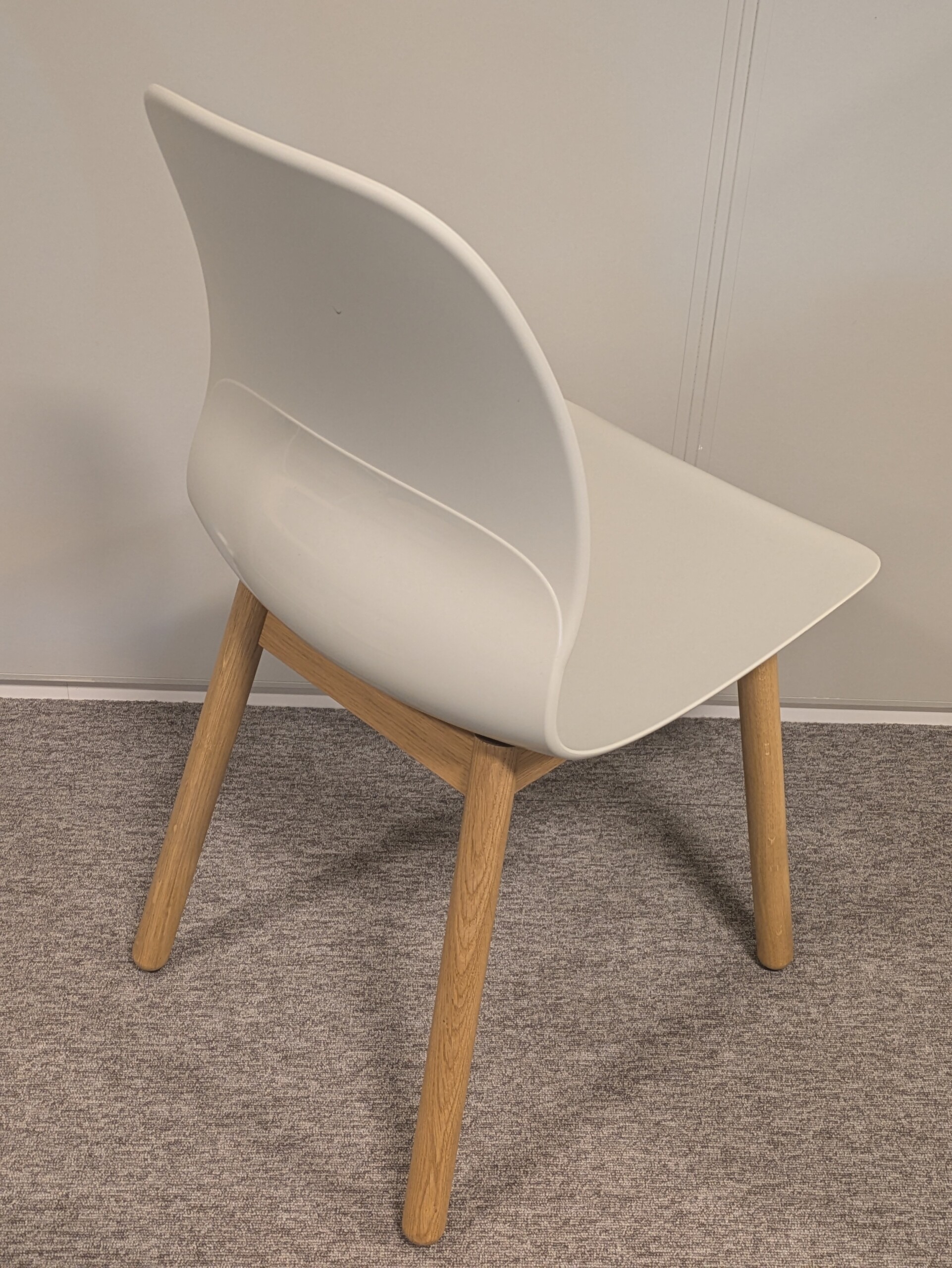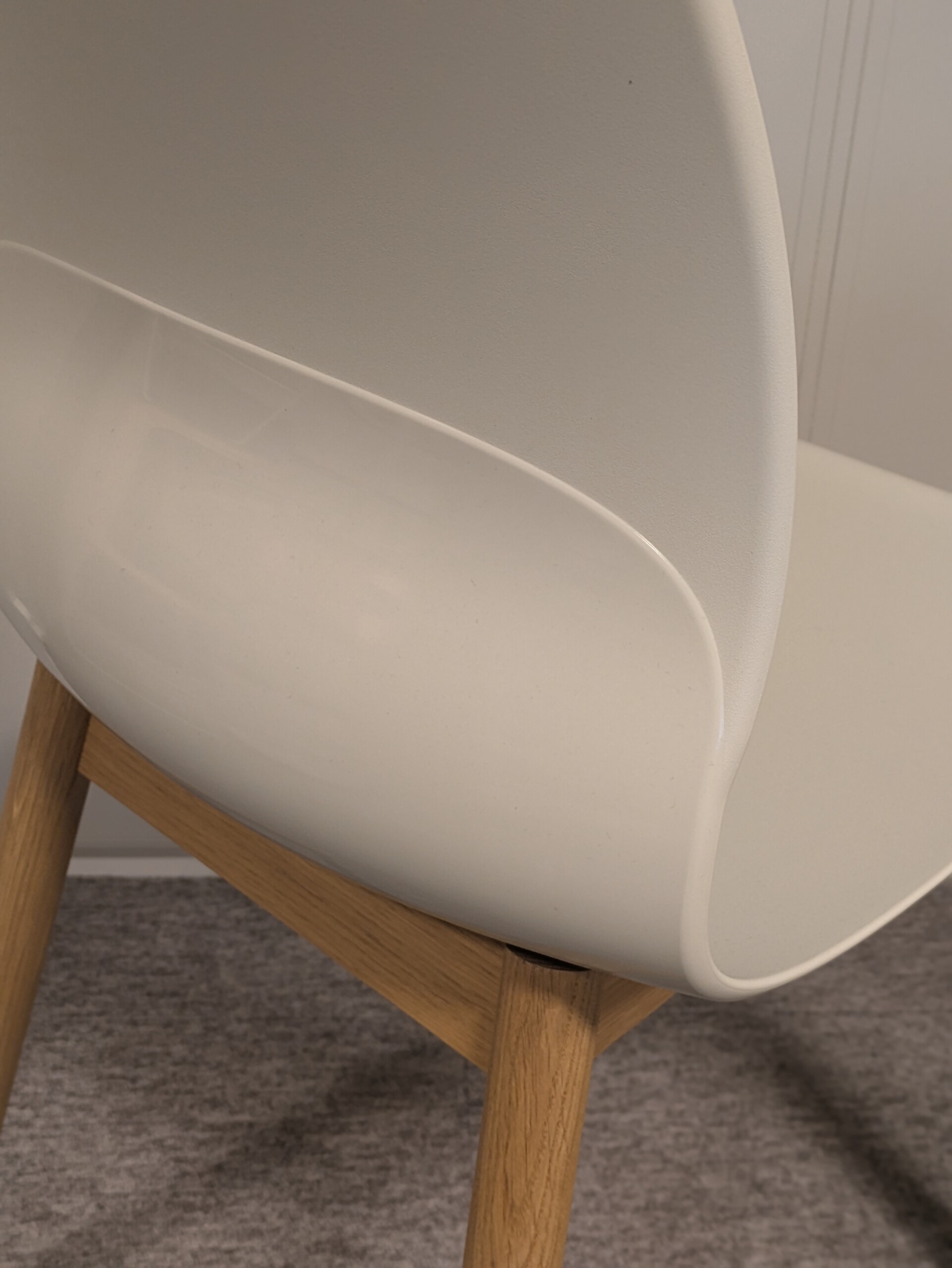 Seat and backrest in plastic (white). Legs in wood (oak).