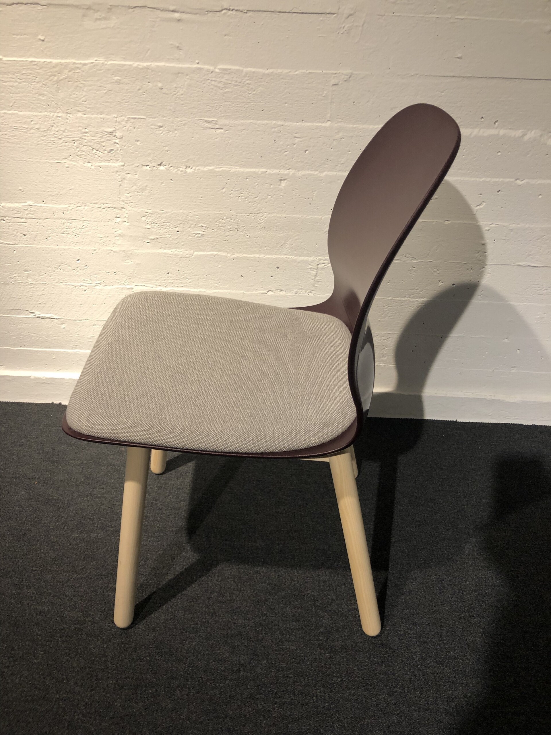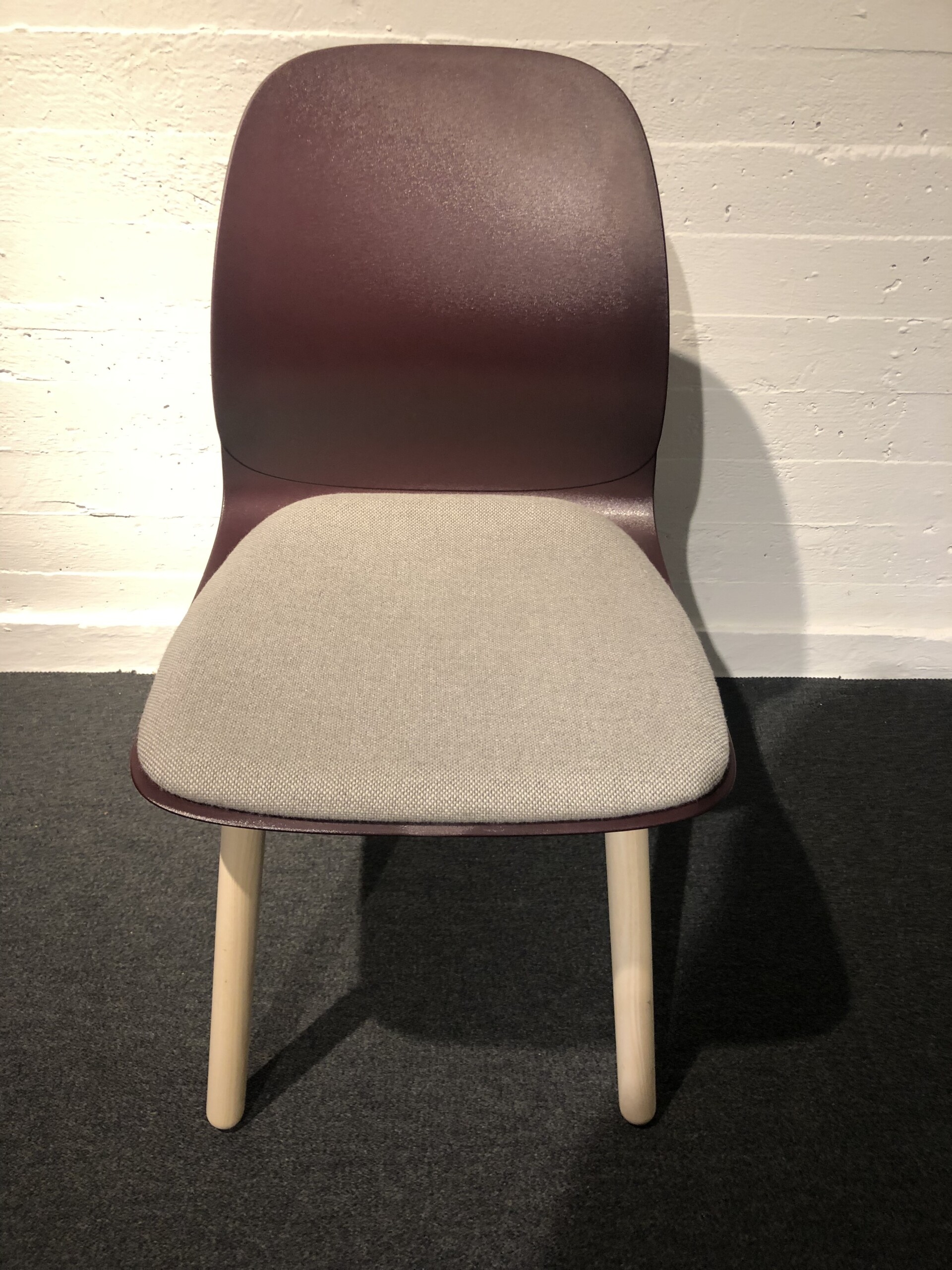 Seat in fabric (beige). Backrest in plastic (red). Legs in wood (ash).