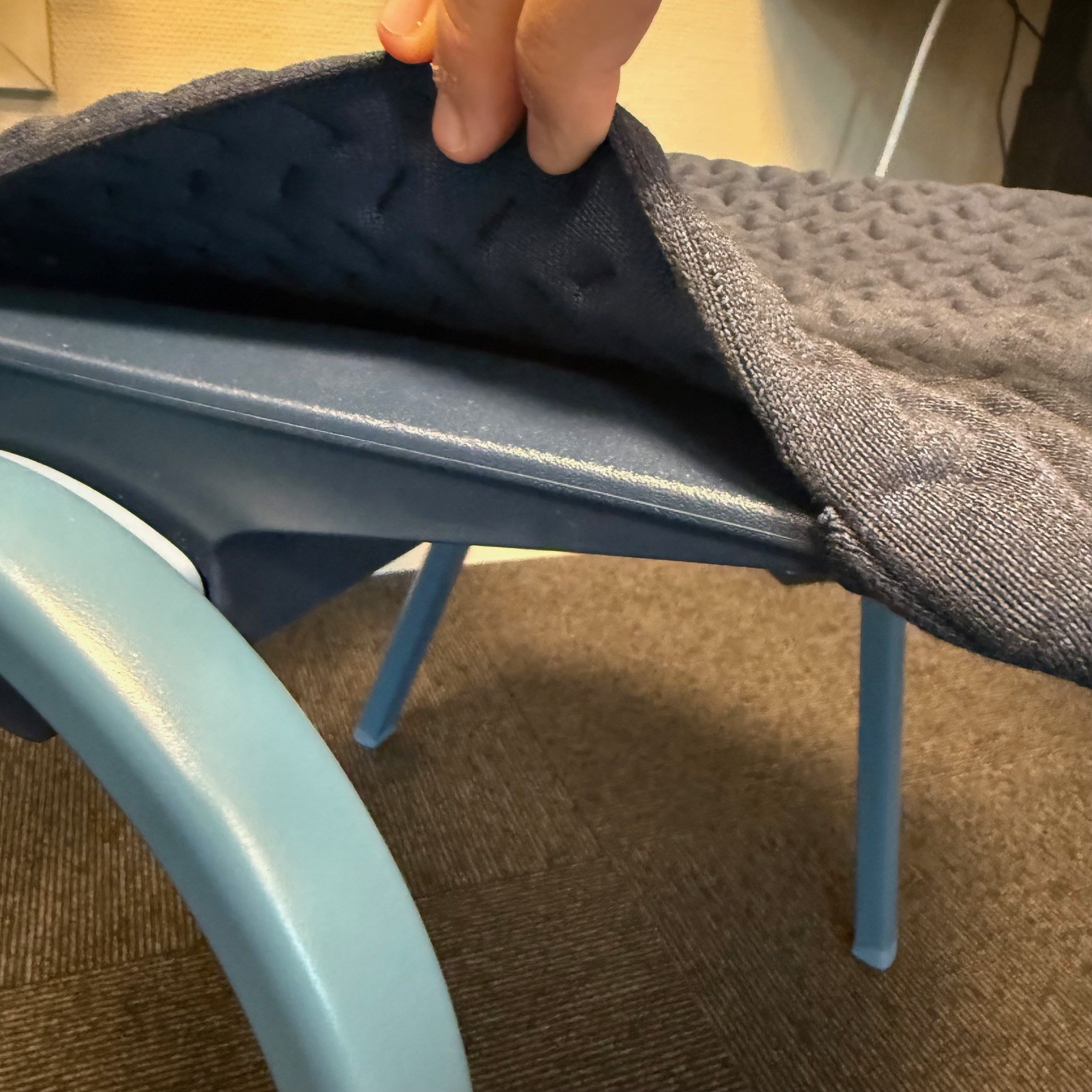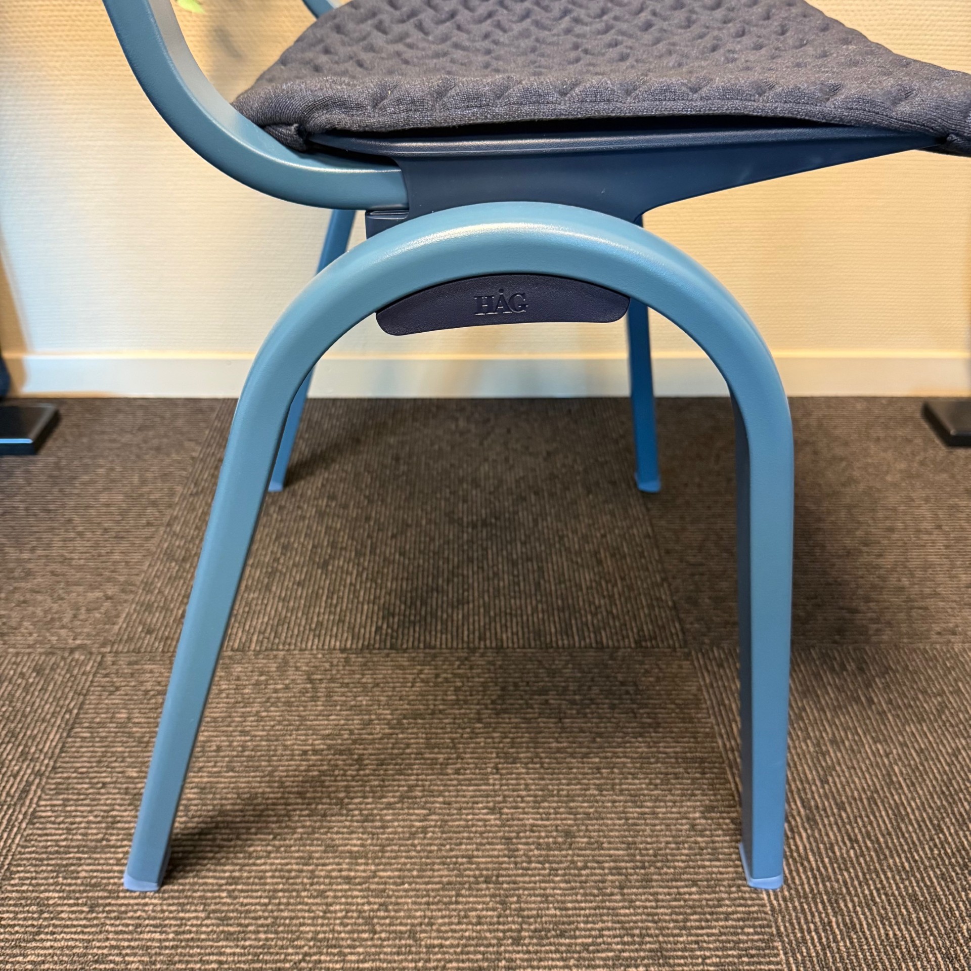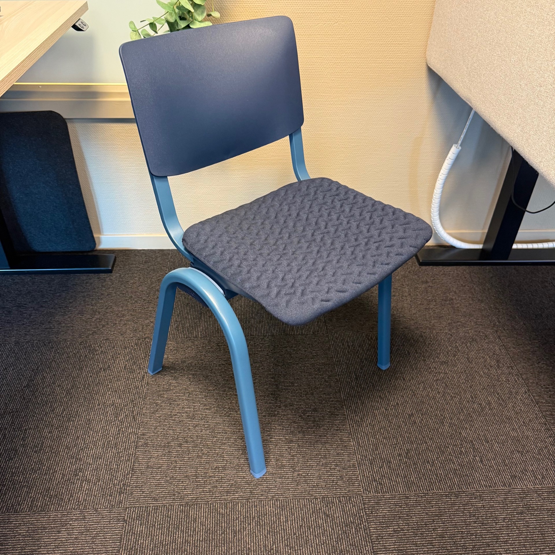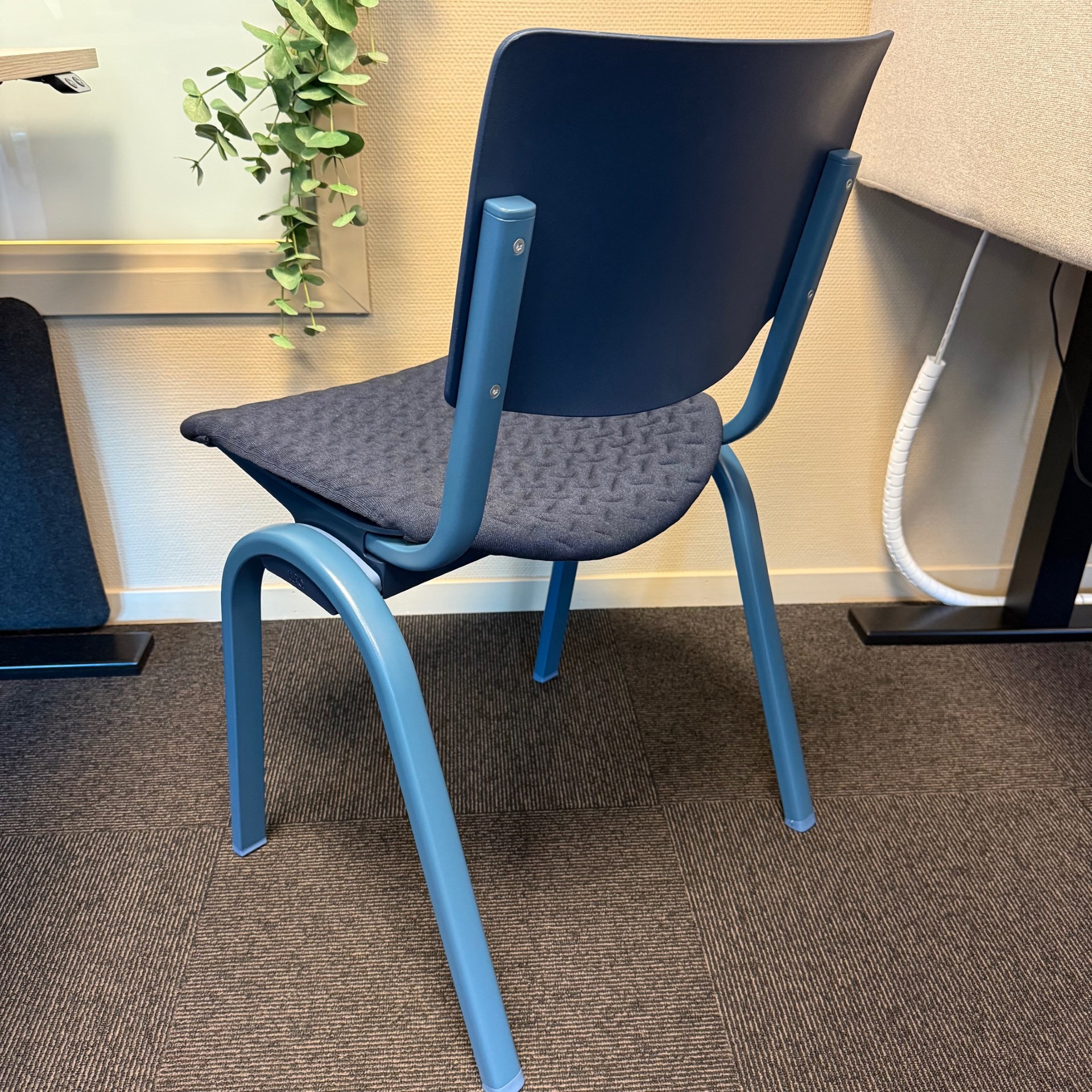 Seat and backrest in plastic (blue). Legs in metal (blue).