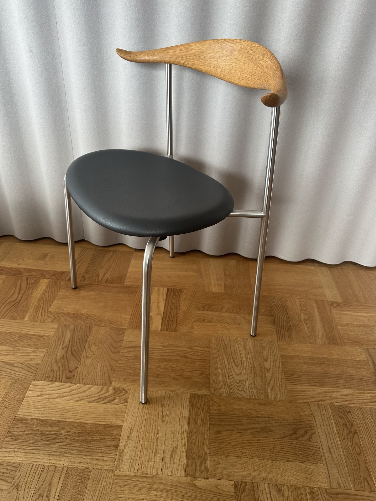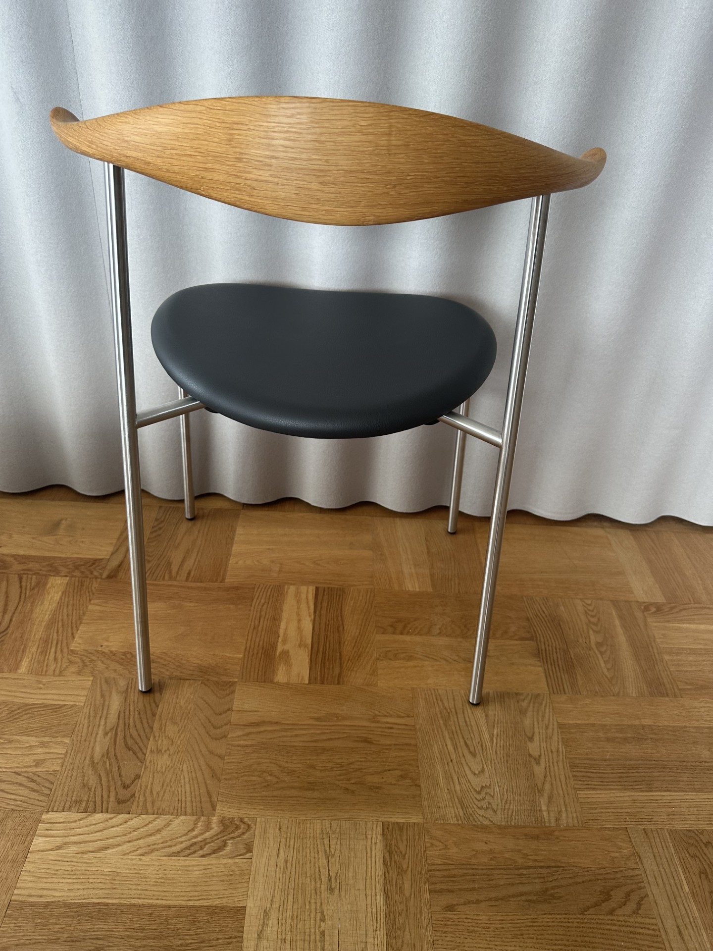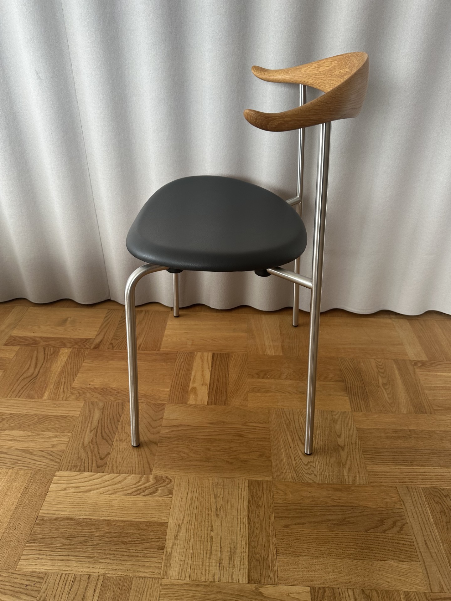Seat in leather (black). Backrest in wood (oak). Legs in metal (stainless).