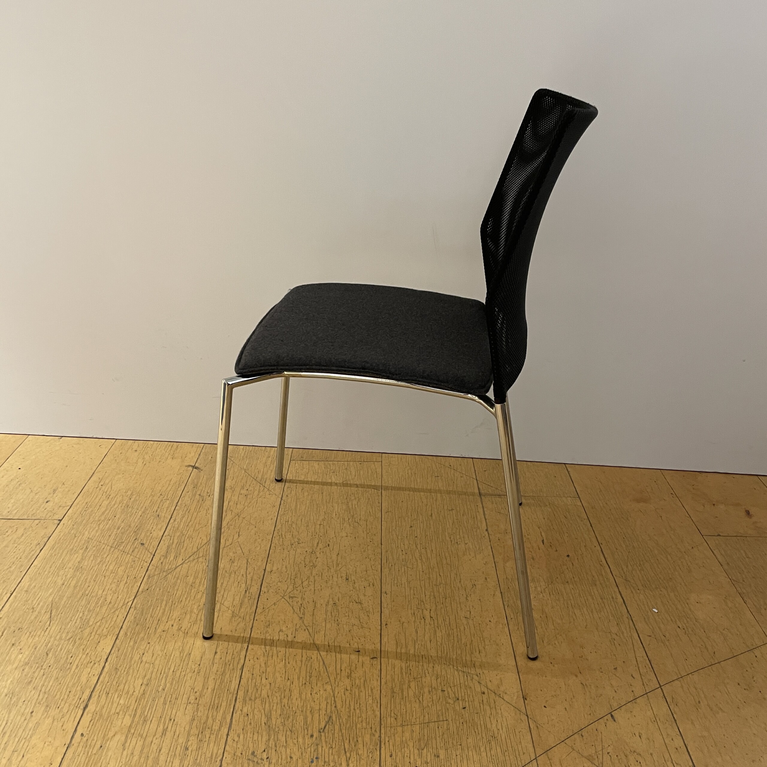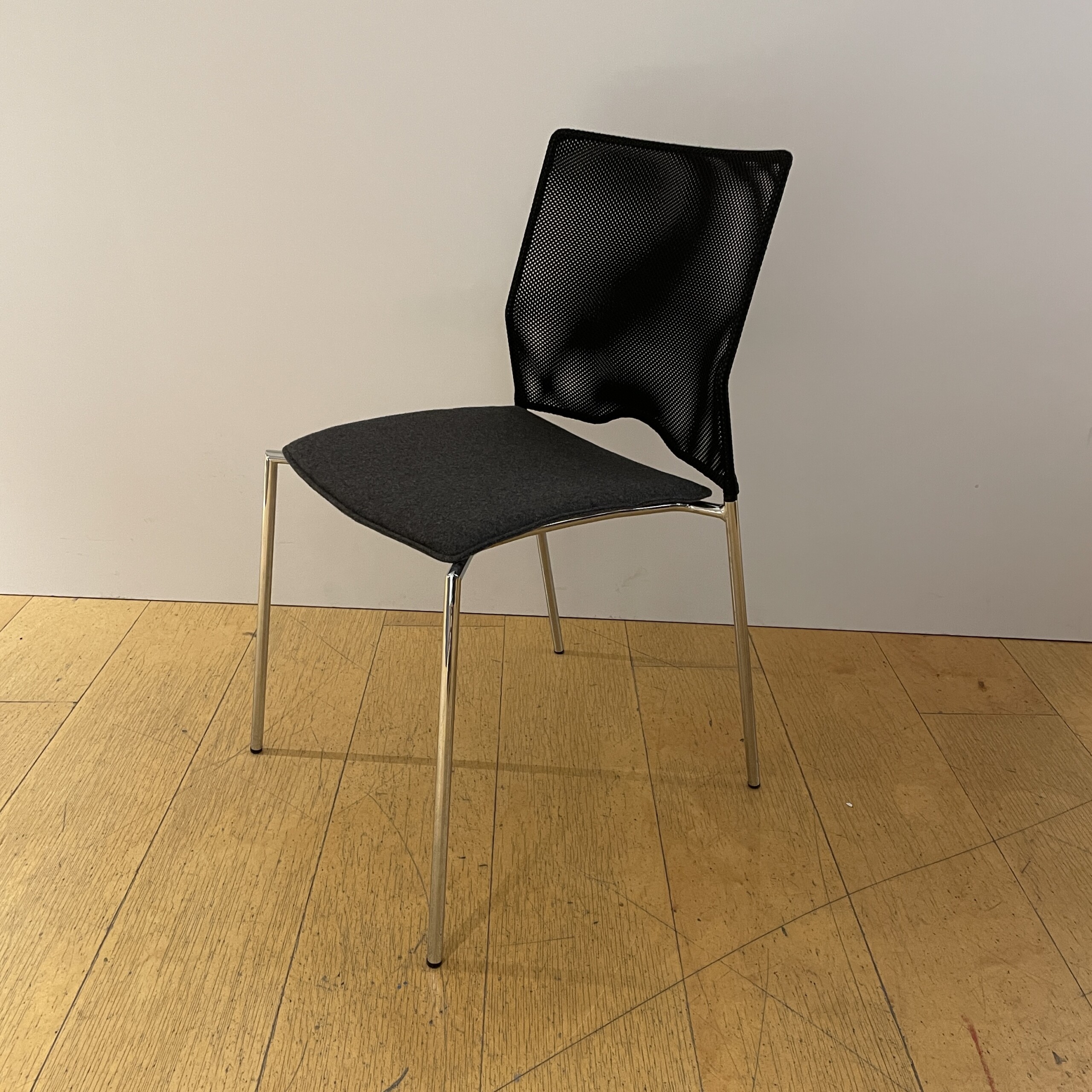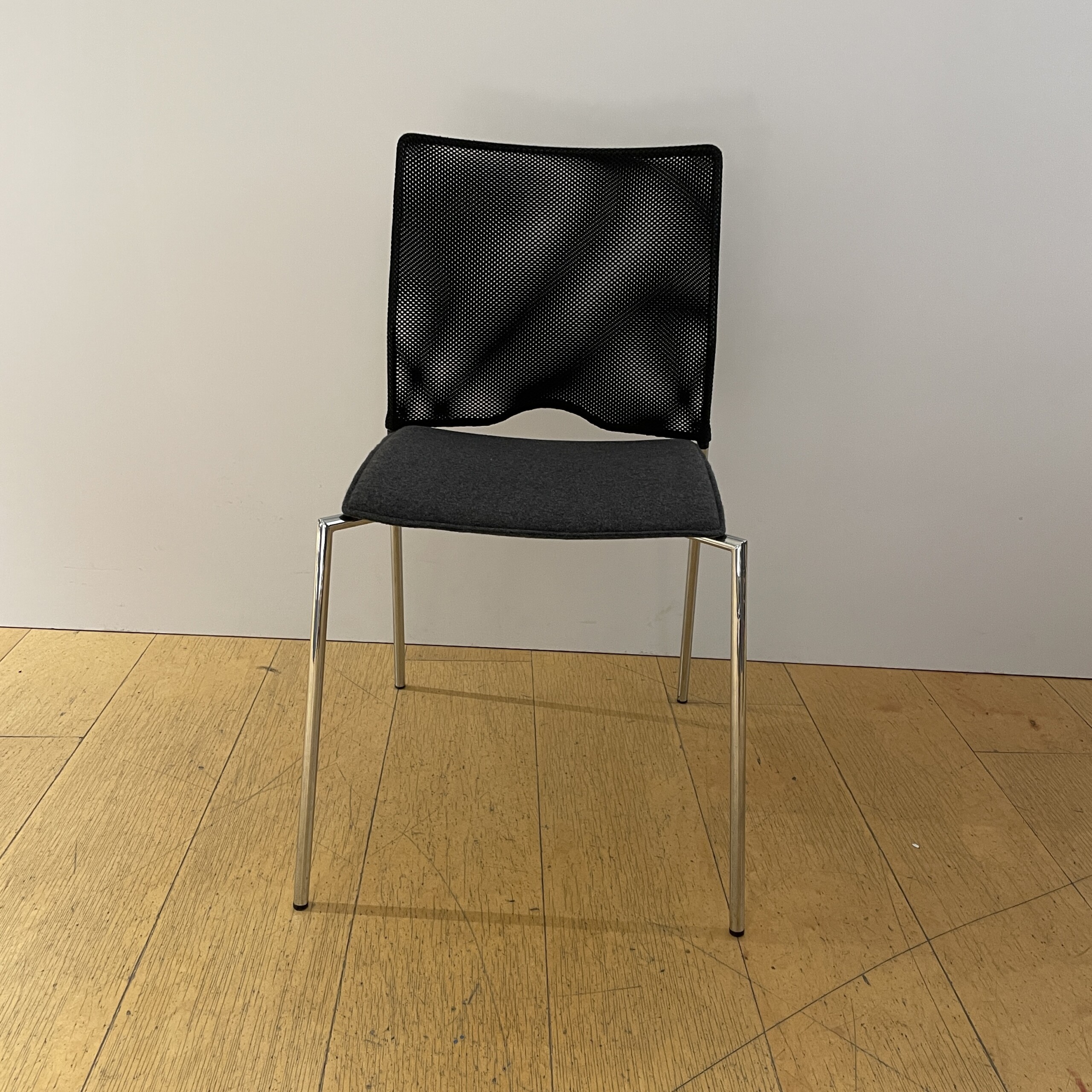 Seat in fabric (grey). Backrest in mesh (black). Legs in metal (chrome).