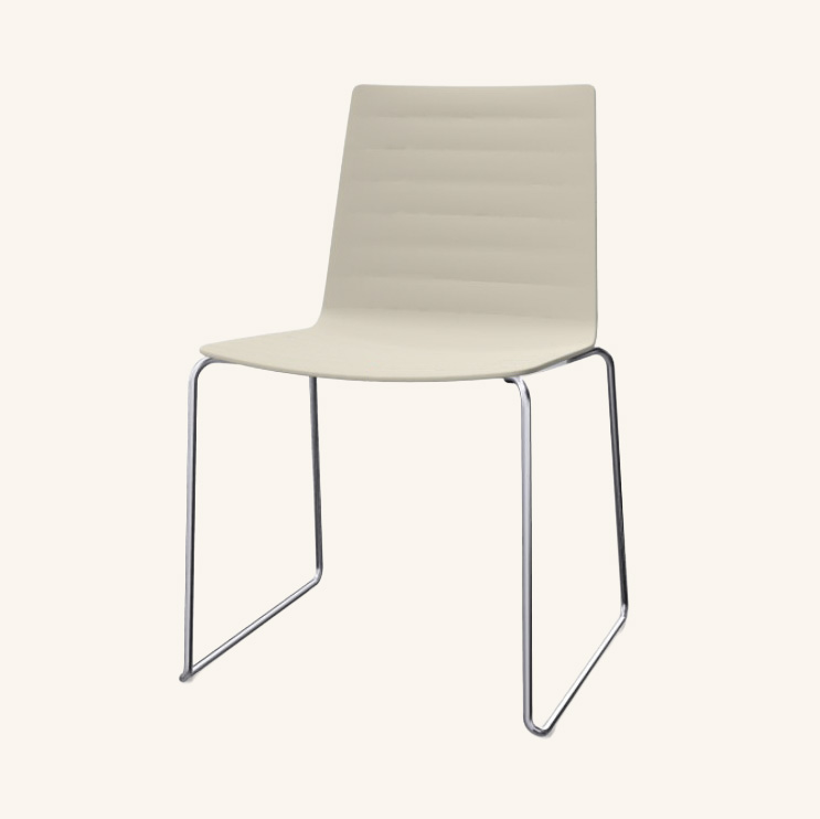 Seat and backrest in plastic (white). Sledgebase in metal (stainless).