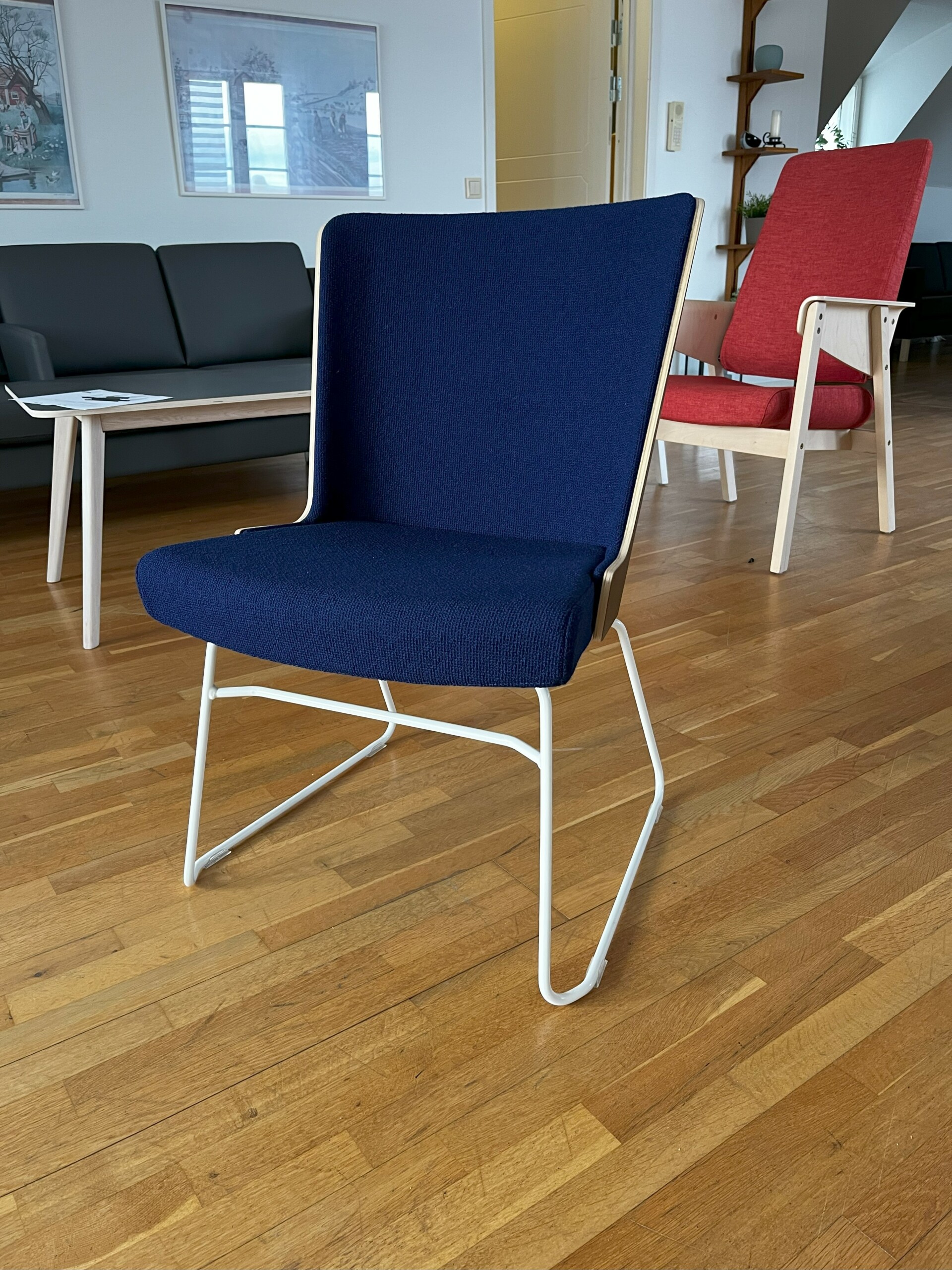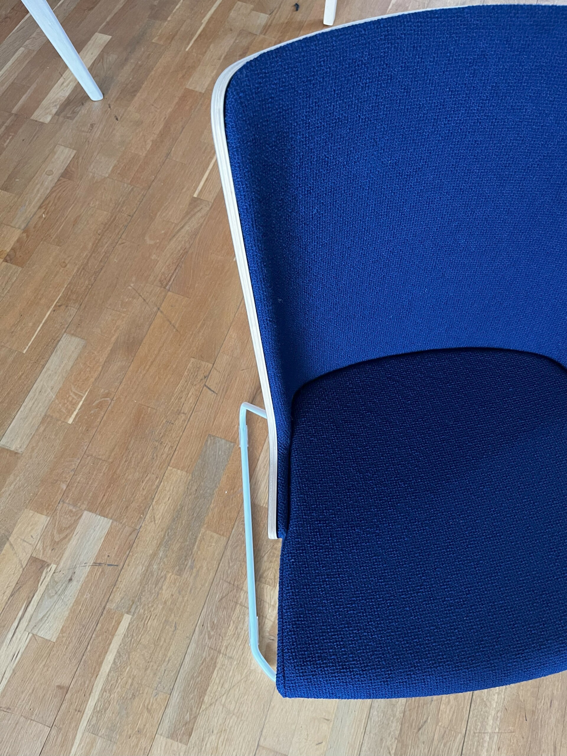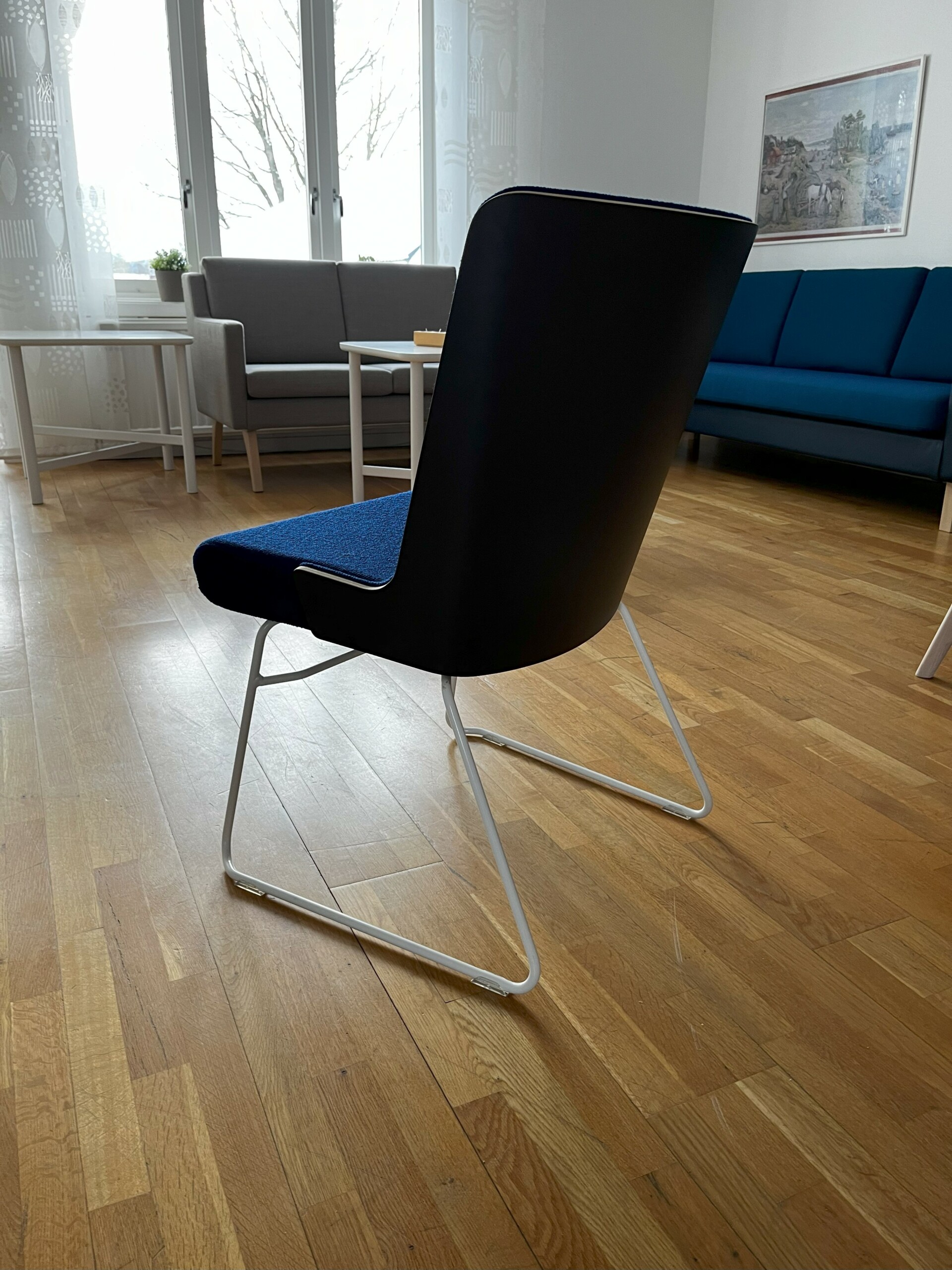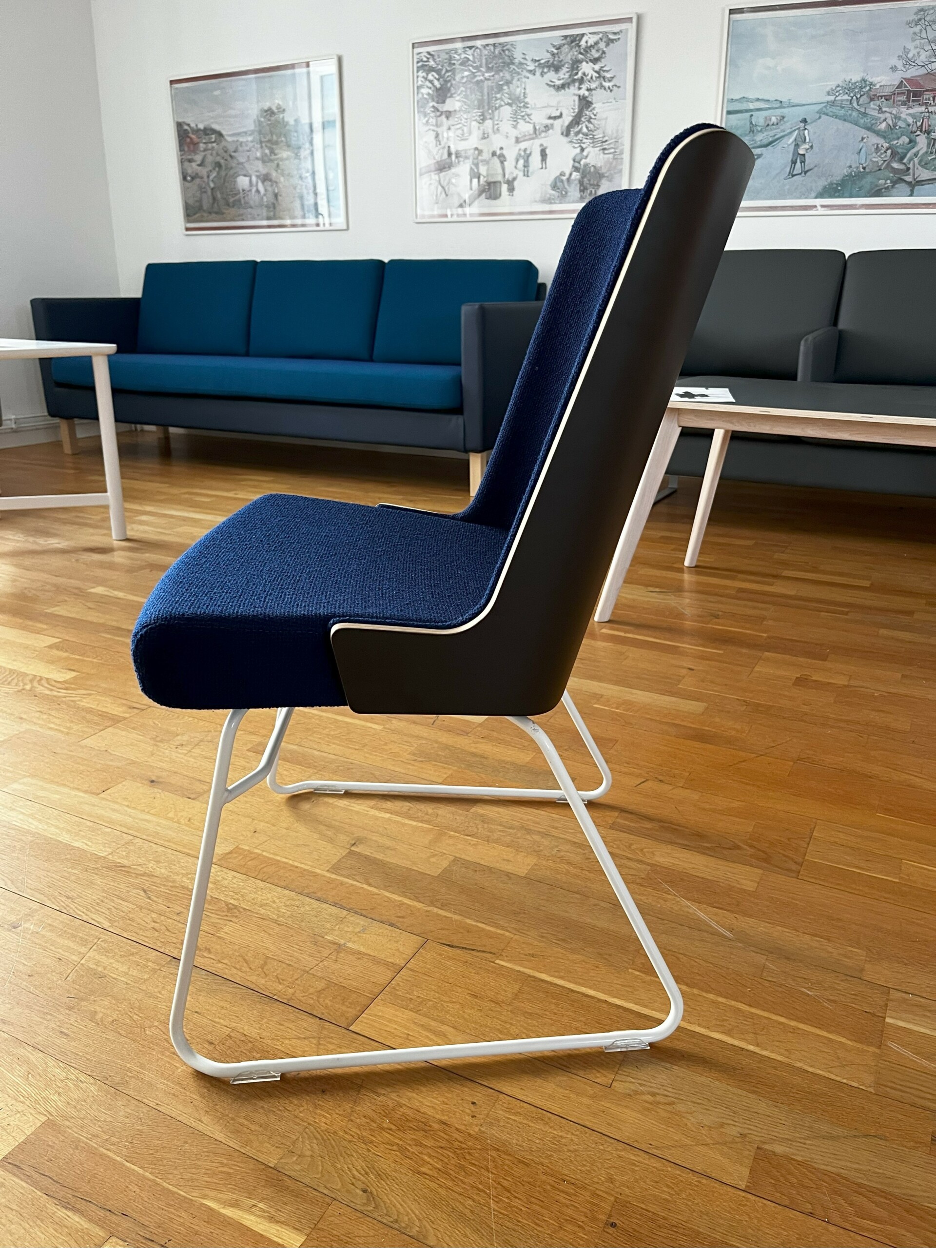 Seat and backrest in fabric (blue). Sledgebase in metal (white).