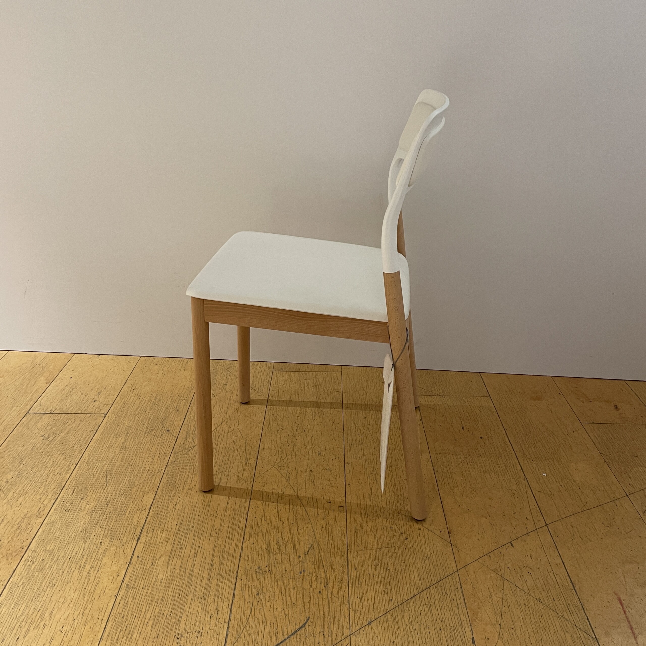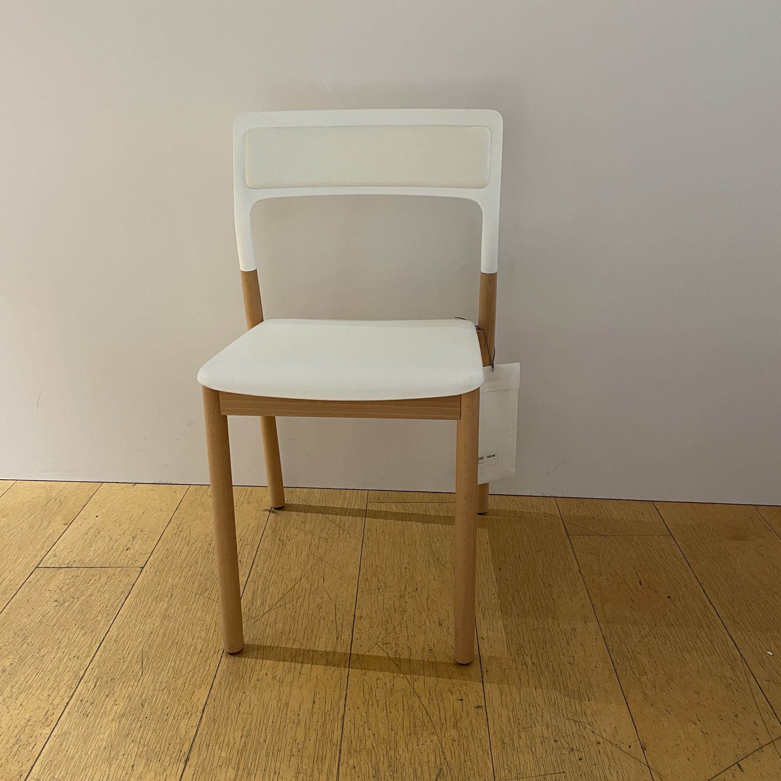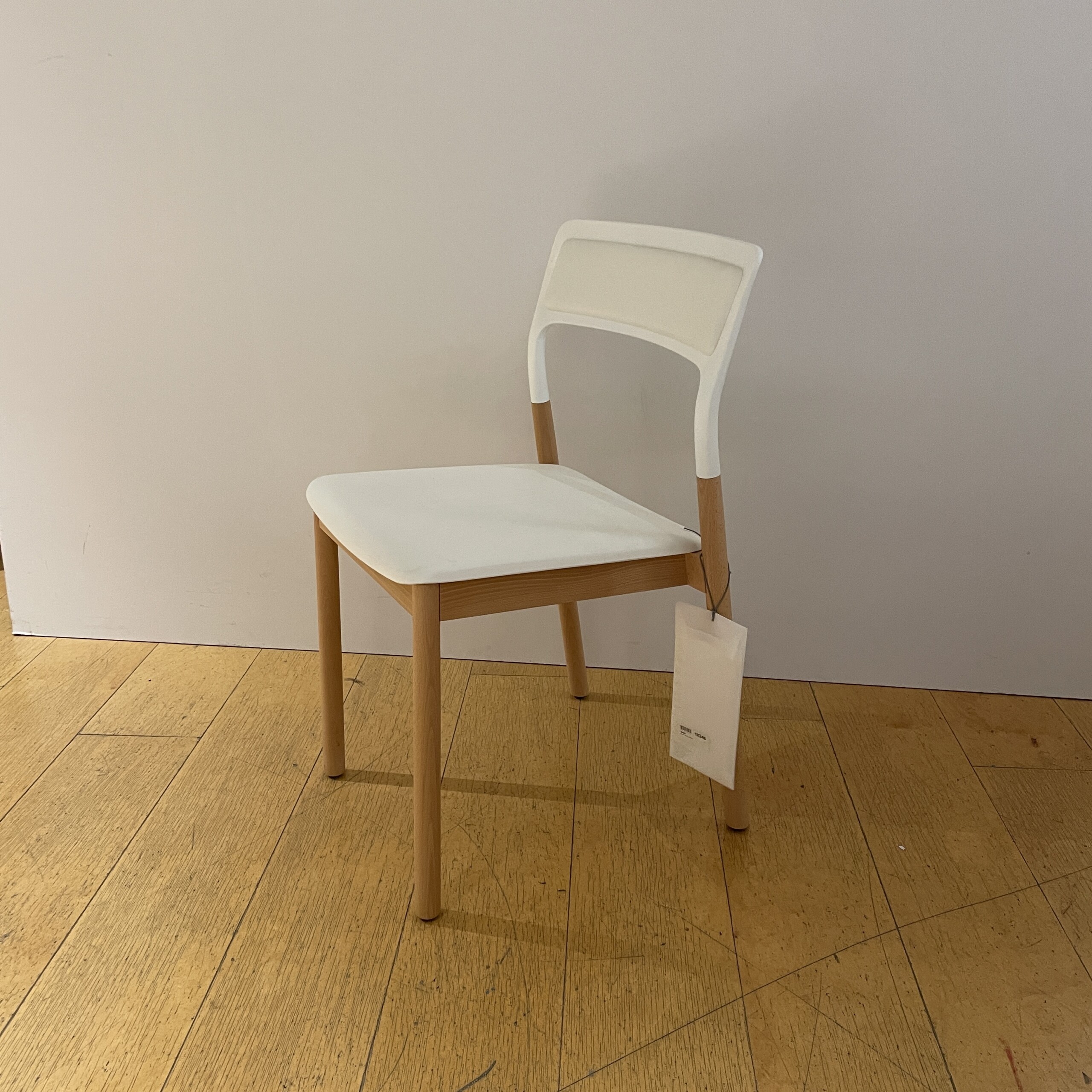 Seat and backrest in plastic. Legs in wood (bok).