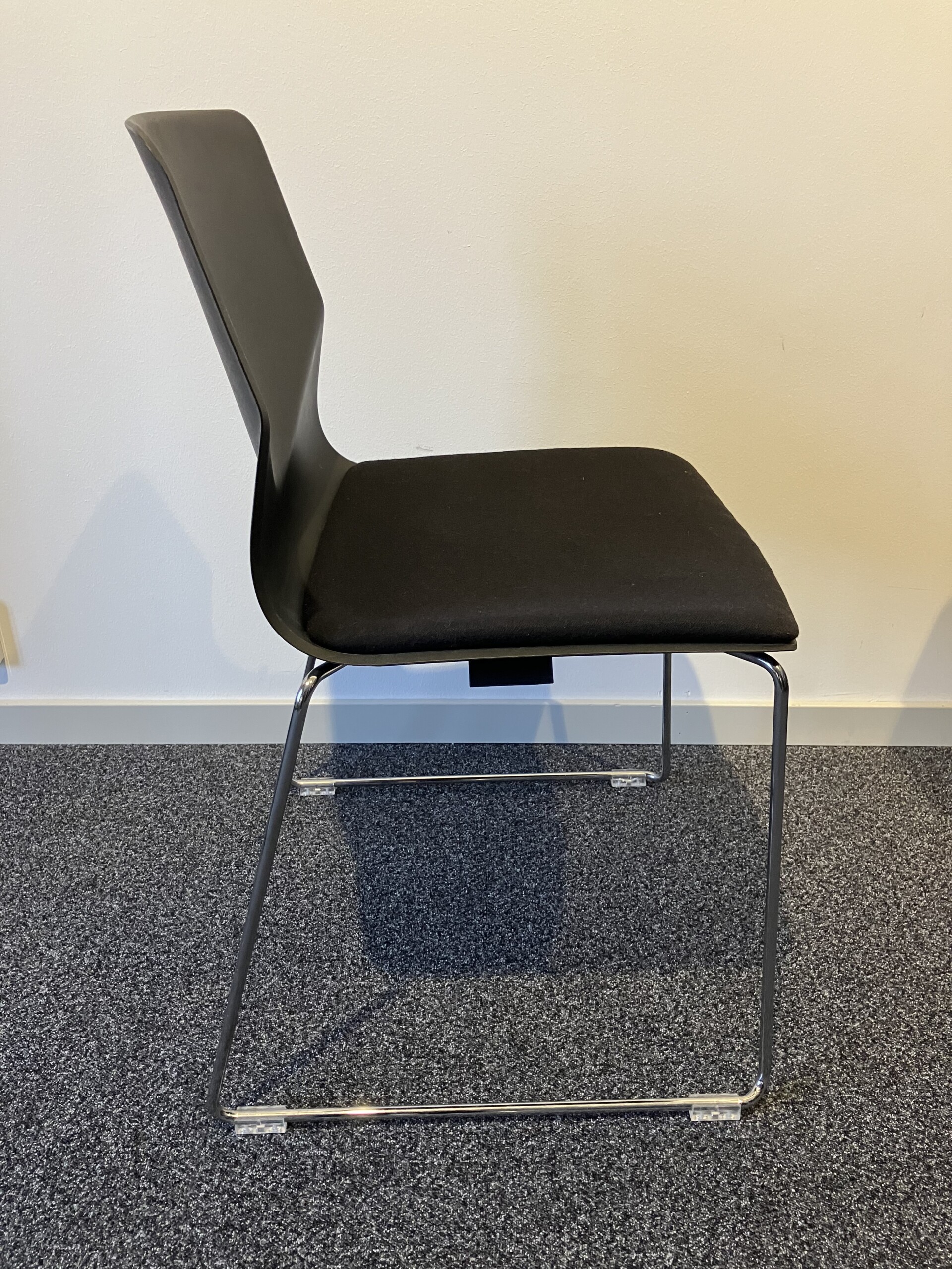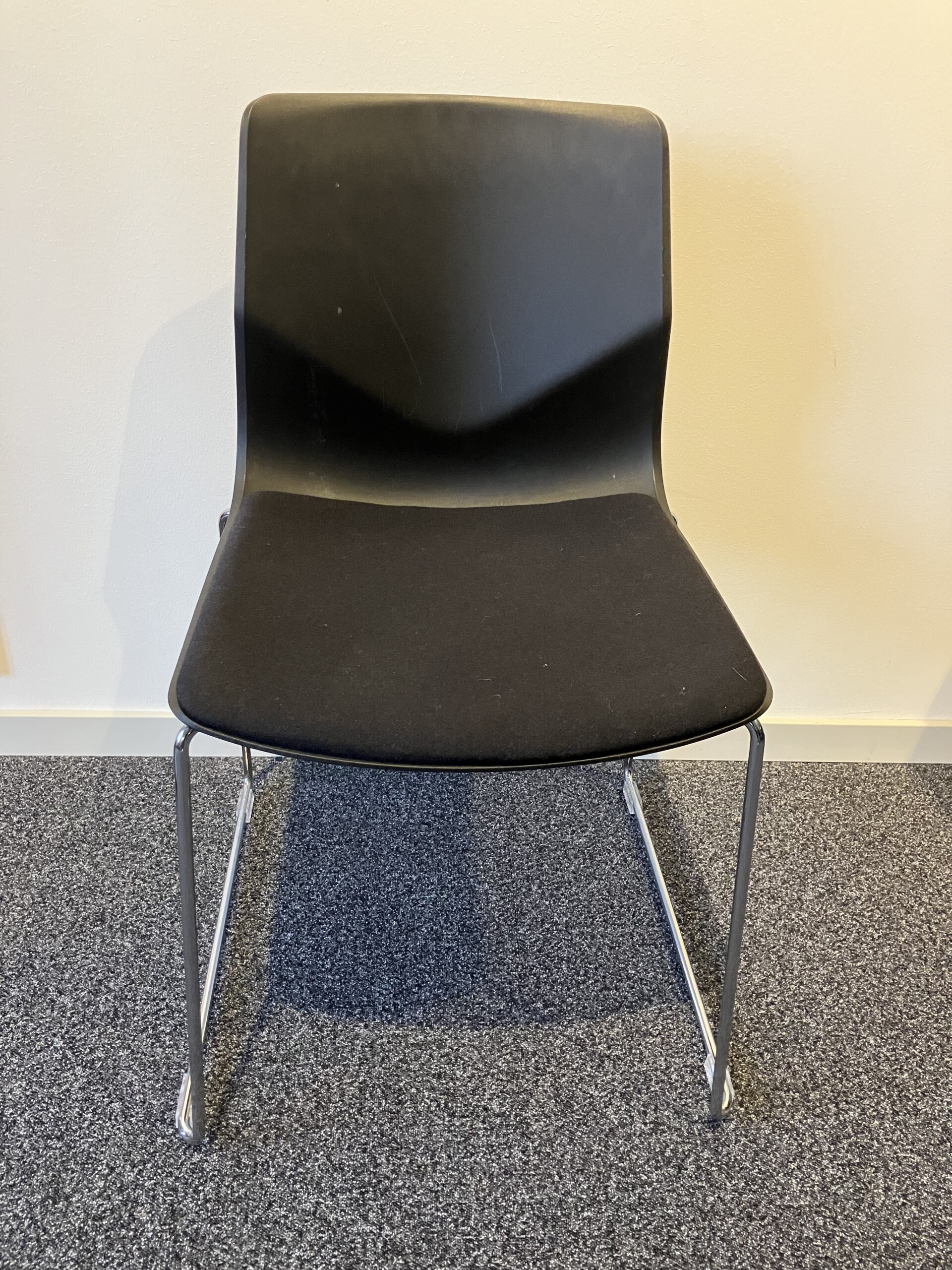 Seat in fabric (black). Backrest in plastic (black). Sledgebase in metal (chrome).