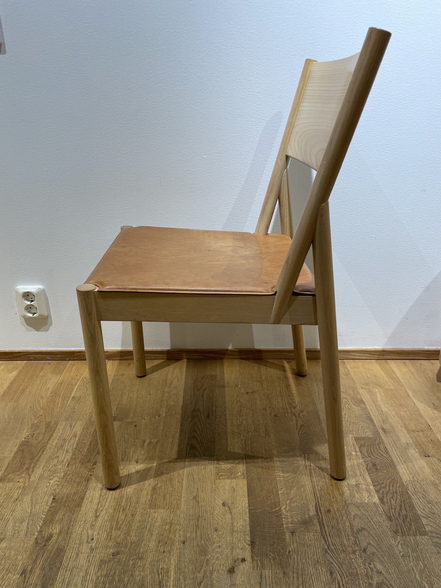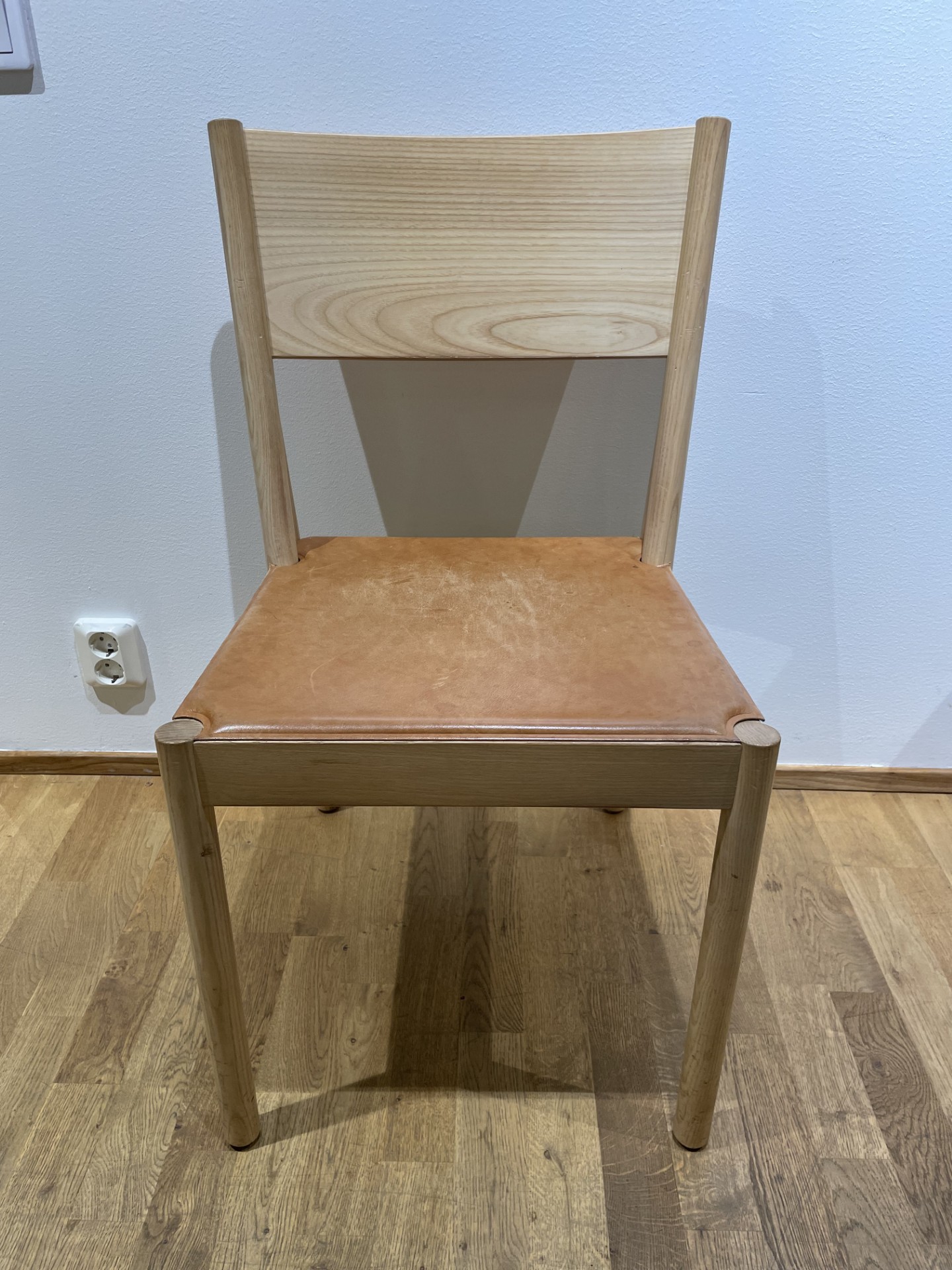 Seat in leather (brown). Backrest in wood (ash). Legs in wood (ash).