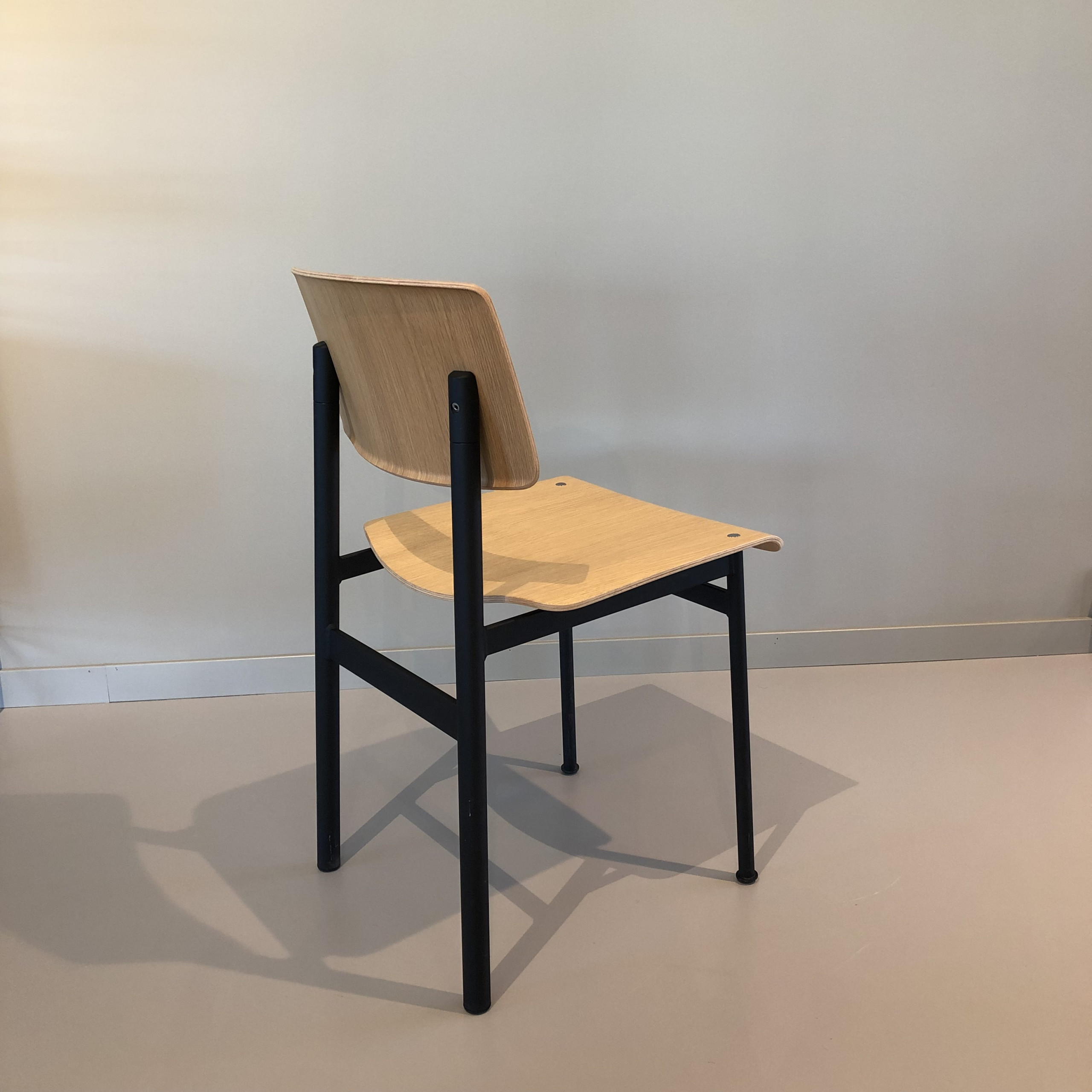 Seat and backrest in wood (oak). Legs in metal (black).