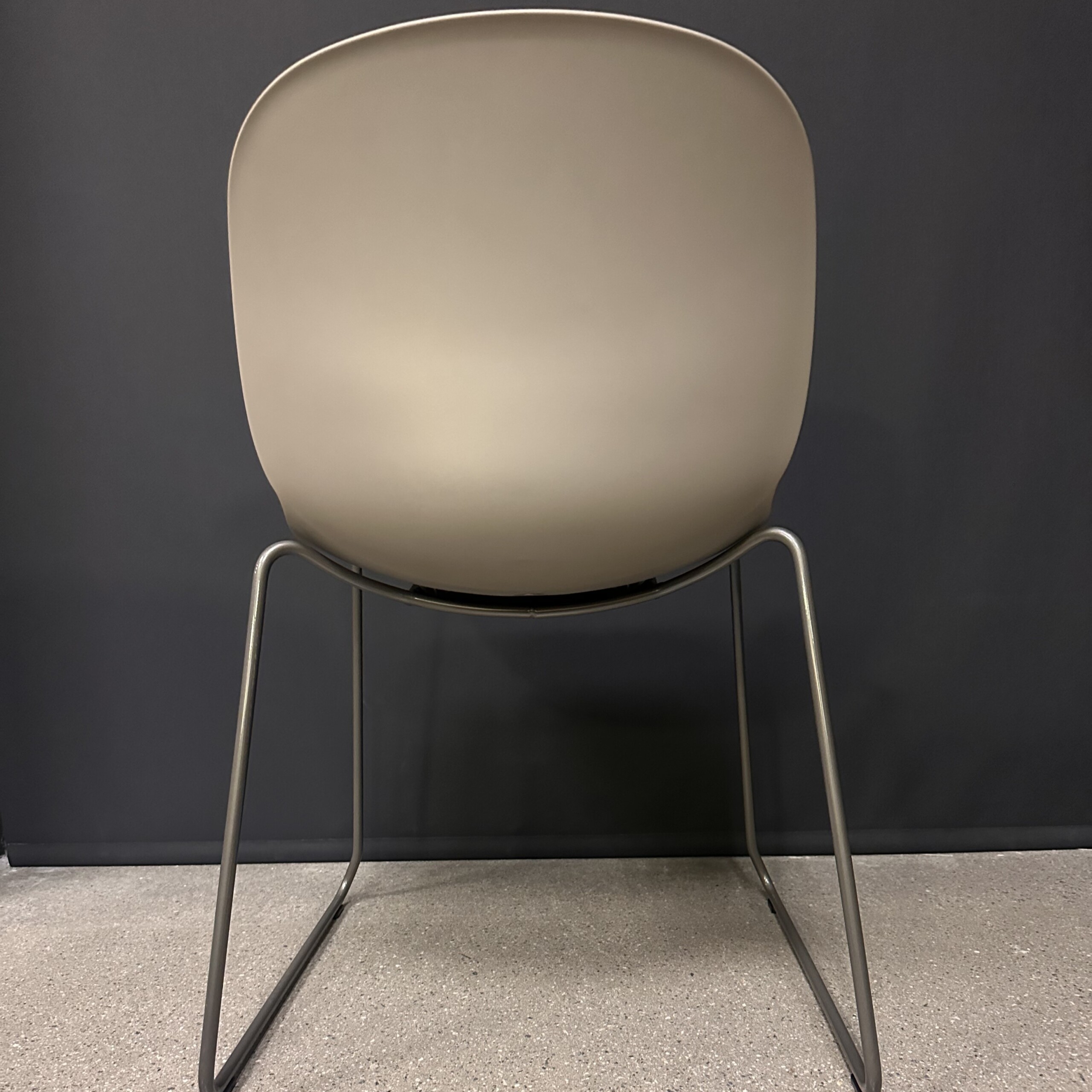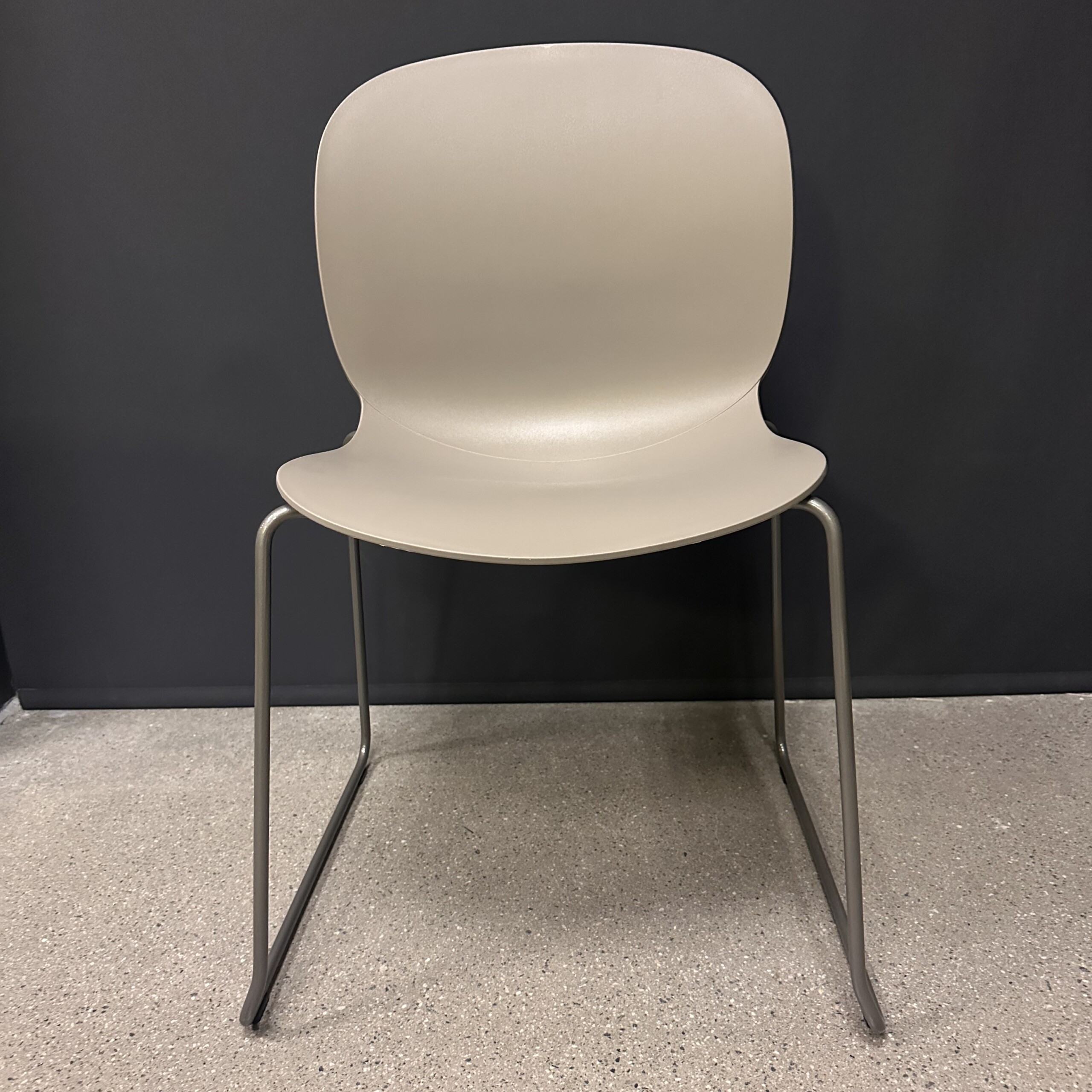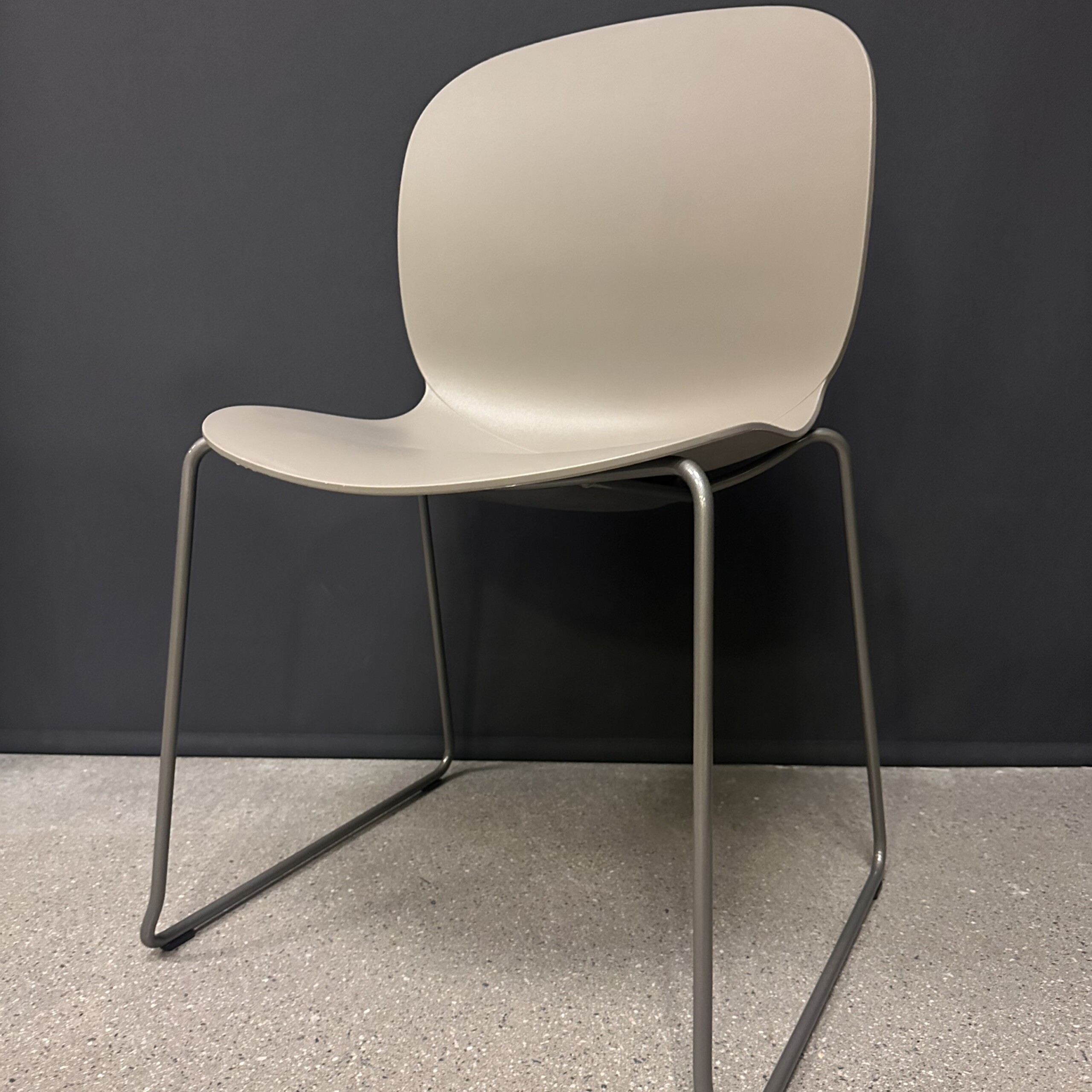 Seat and backrest in plastic (grey). Sledgebase in metal (silver).