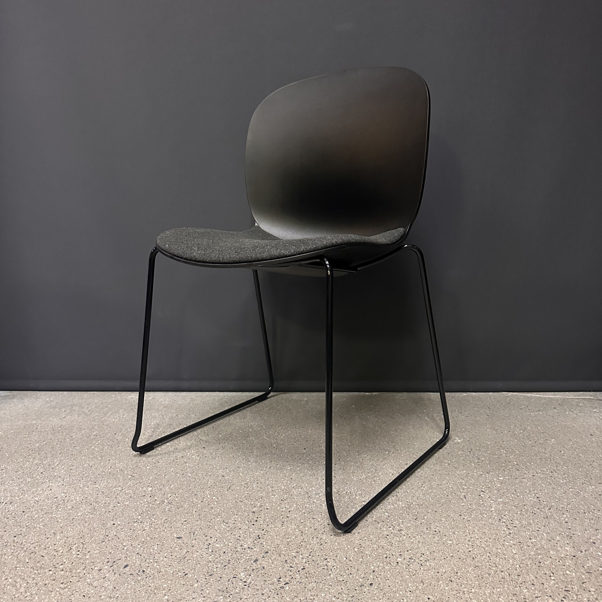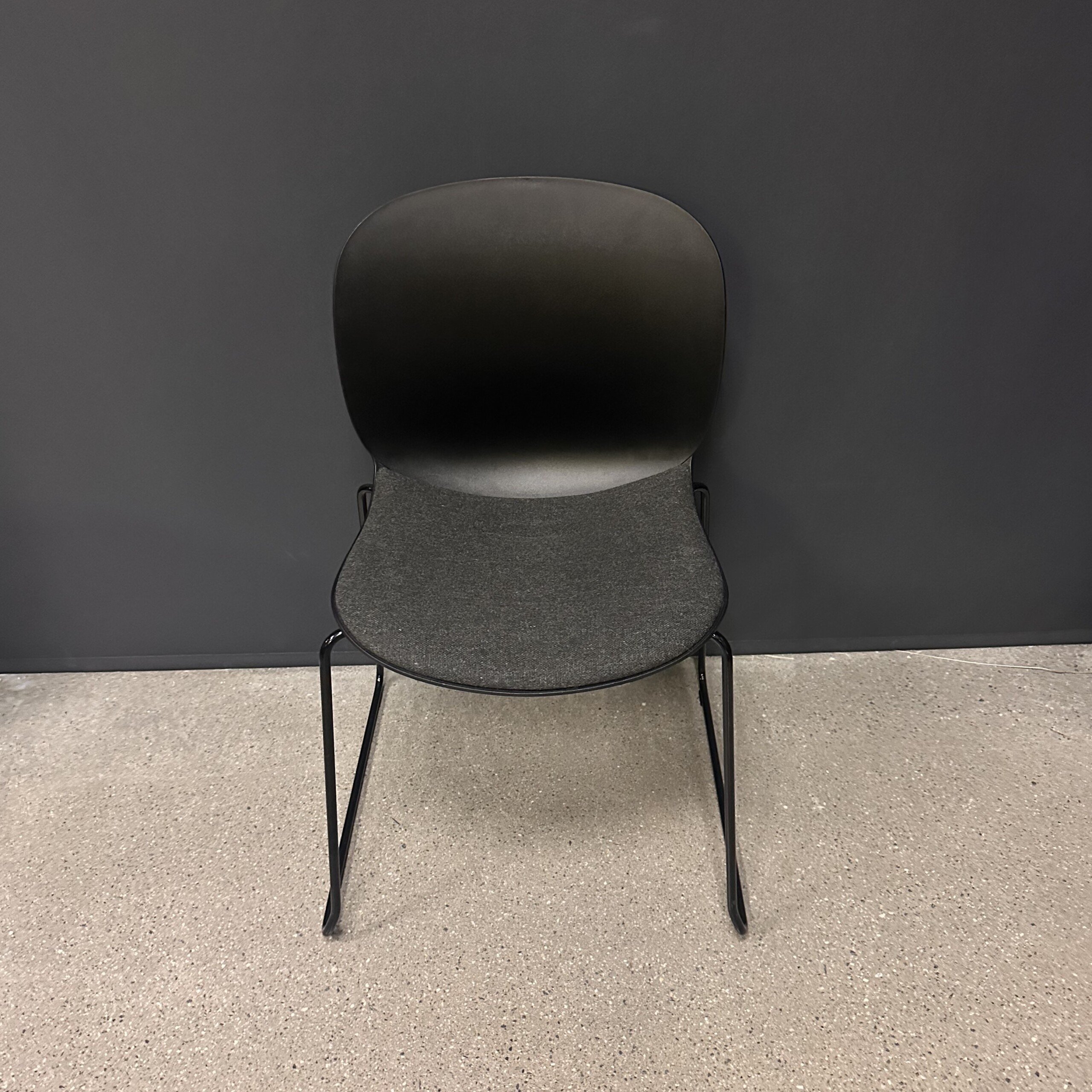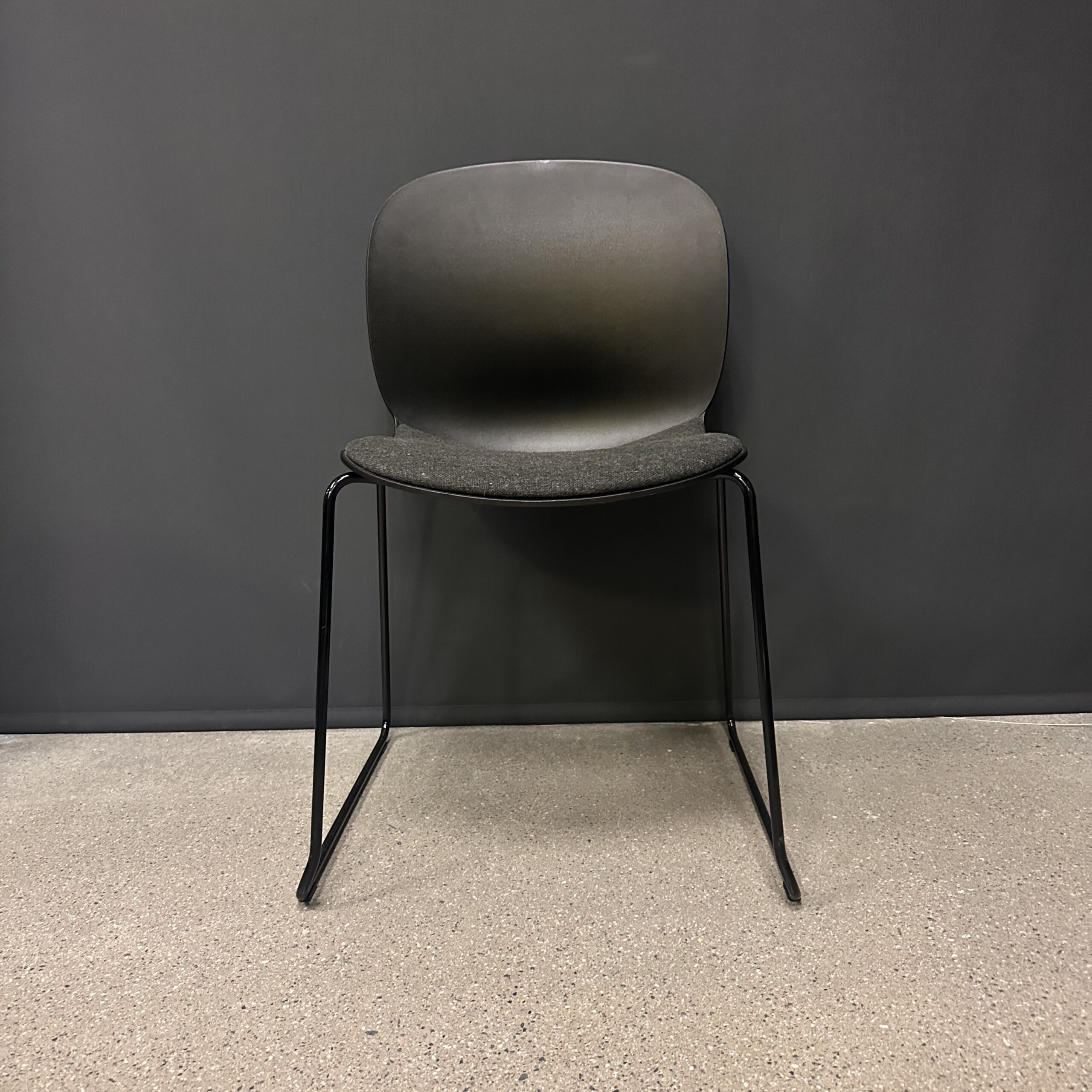 Seat in fabric (grey). Backrest in plastic (black). Sledgebase in metal (black).