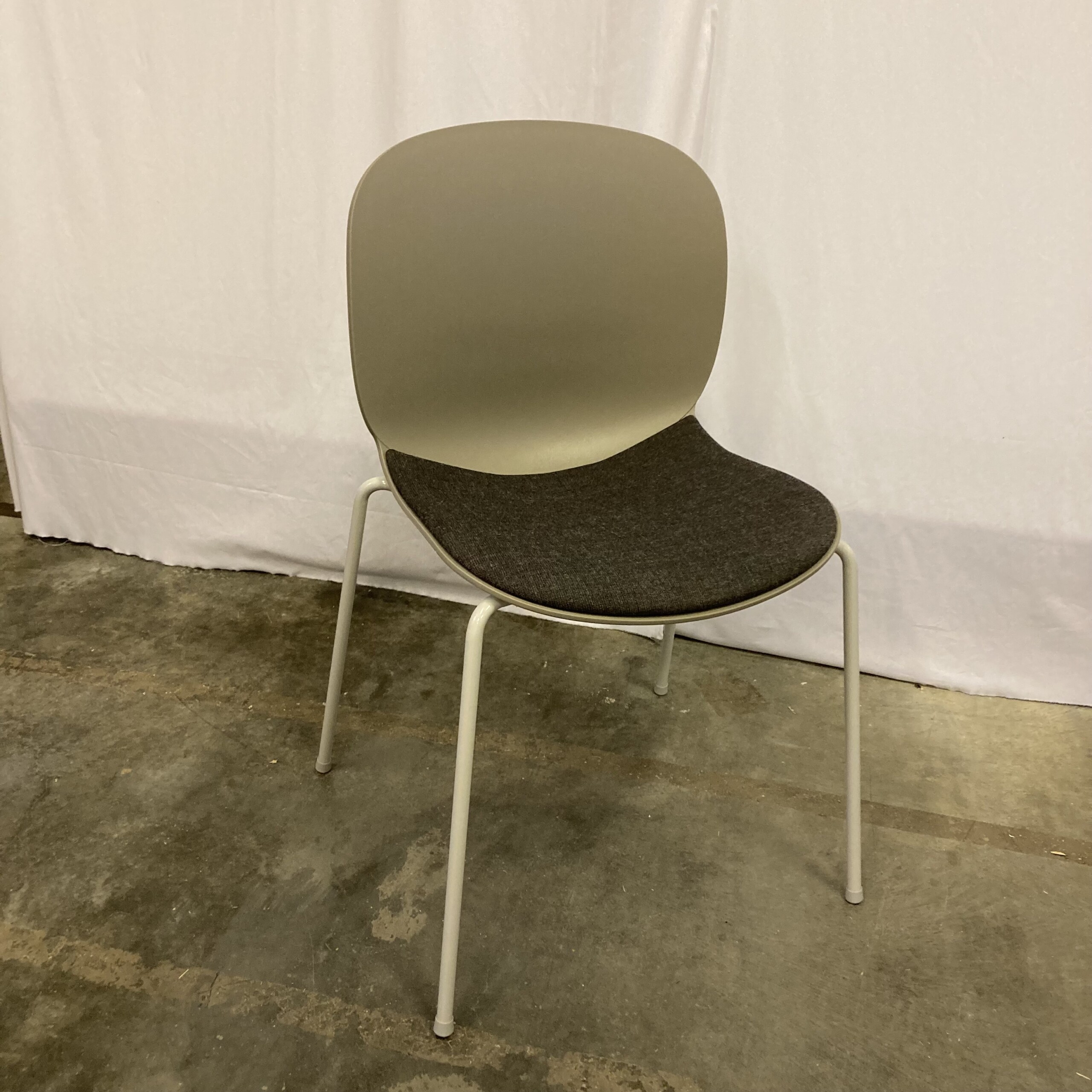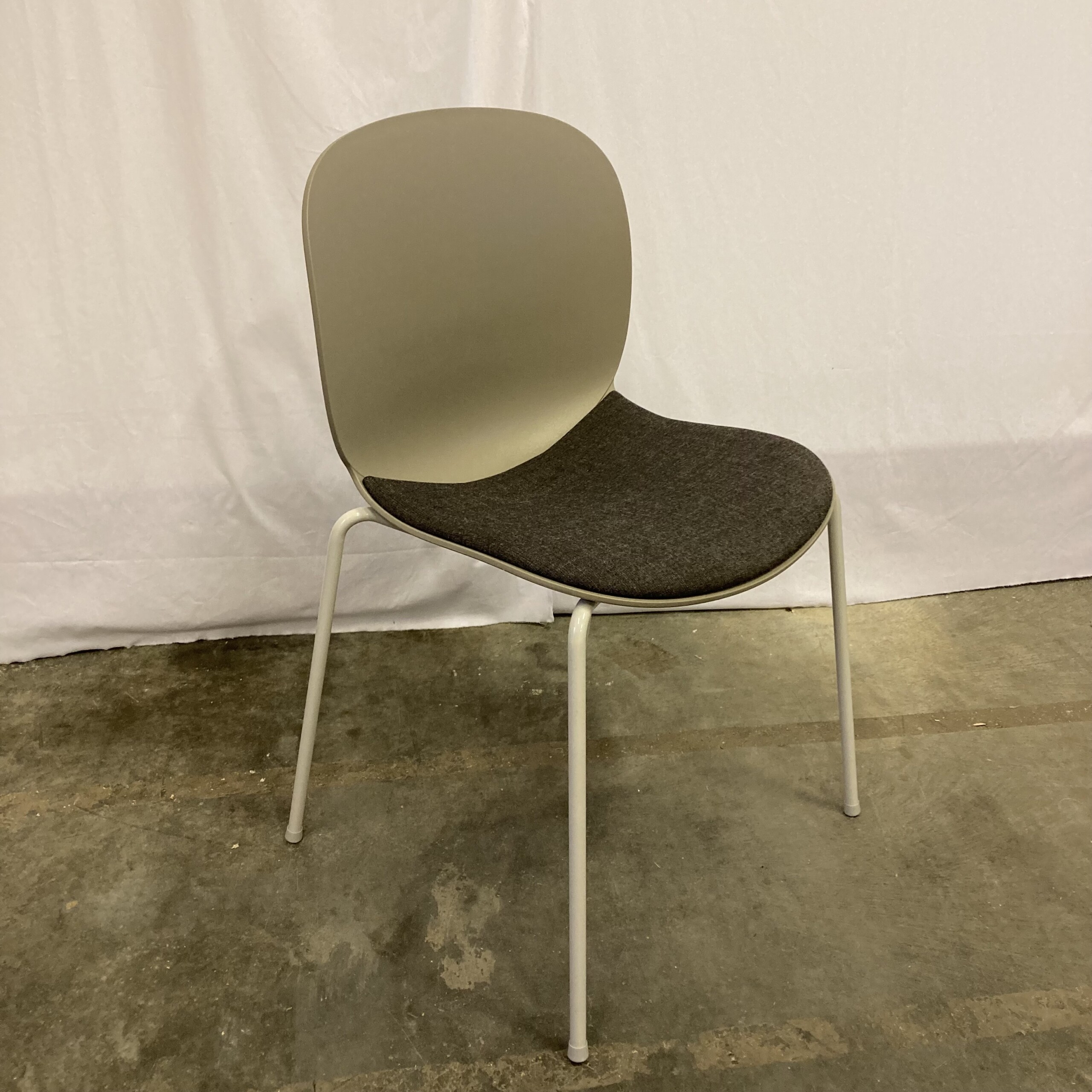 Seat in fabric (brown). Backrest in plastic (beige). Legs in metal (grey).