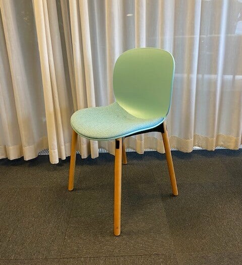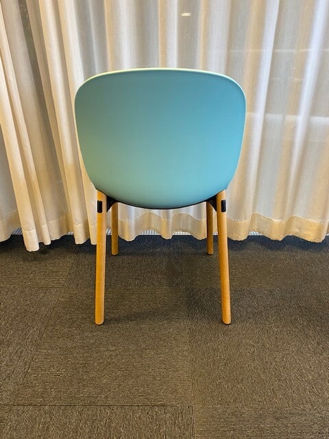 Seat in fabric (blue). Backrest in plastic (blue). Legs in wood (oak).