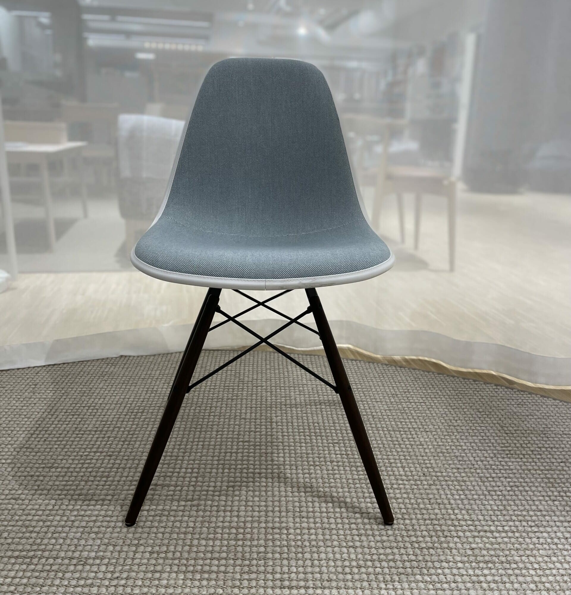 Seat and backrest in fabric (blue). Legs in wood (brown).