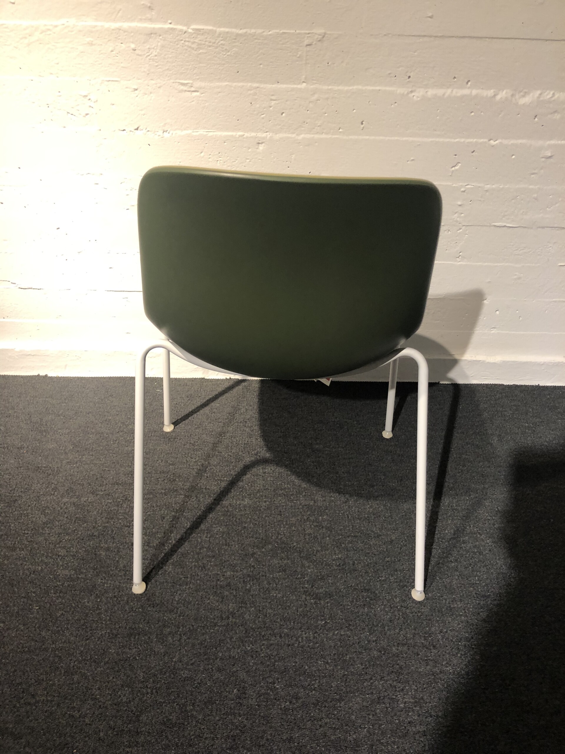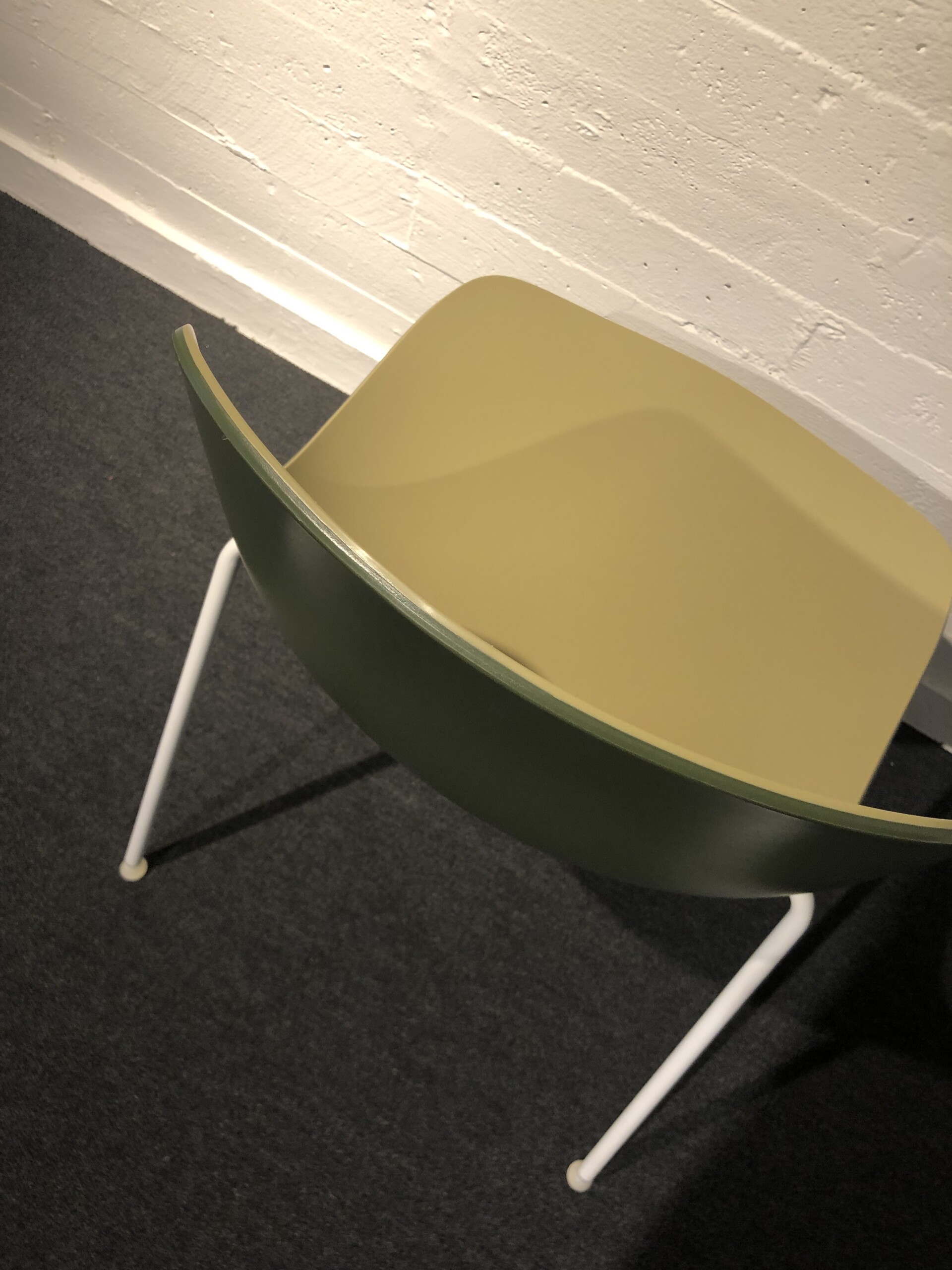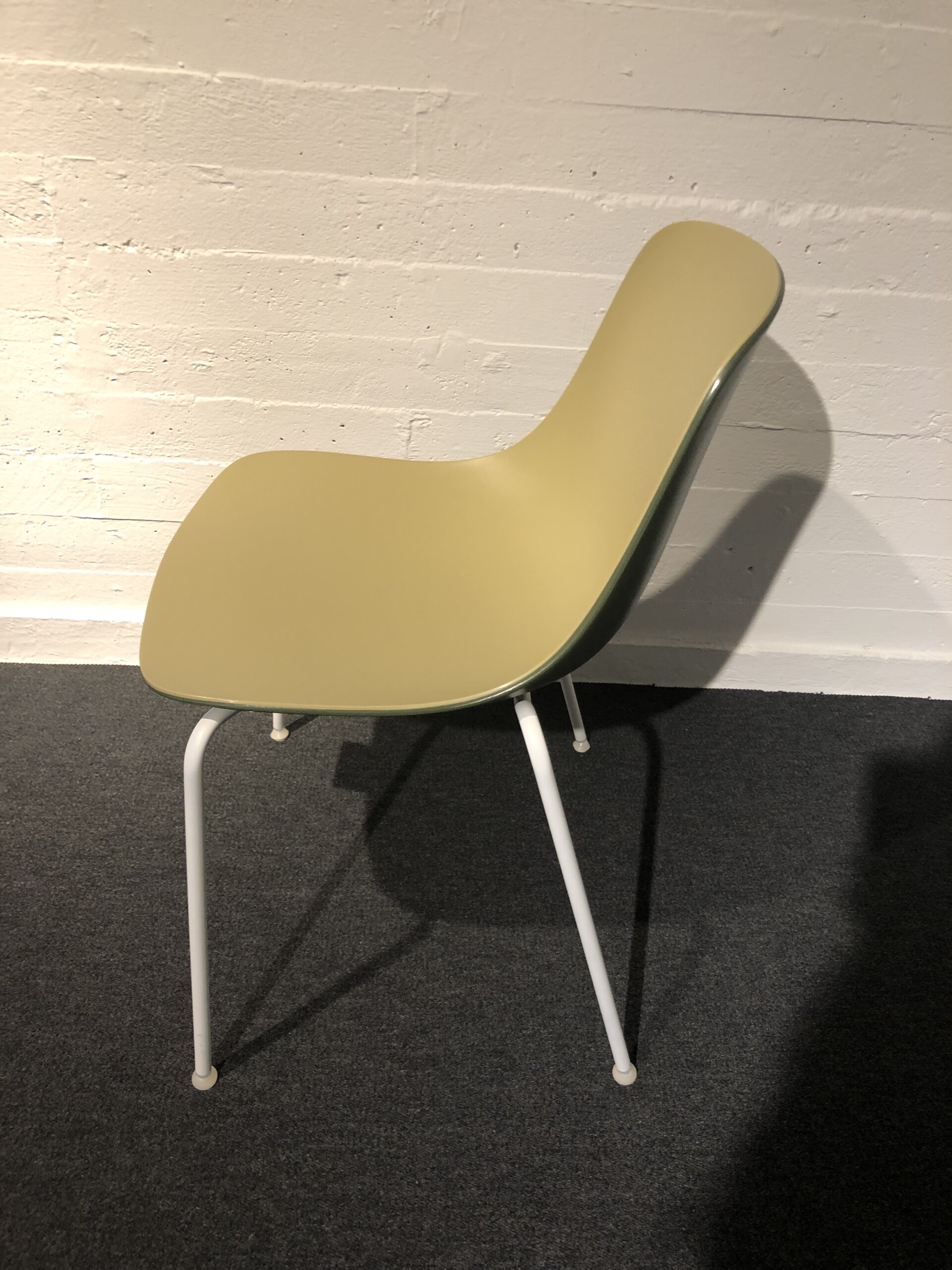 Seat in plastic (yellow). Backrest in plastic (green). Legs in metal (white).