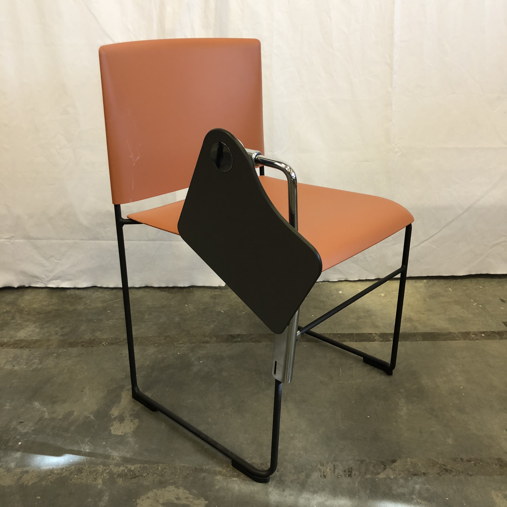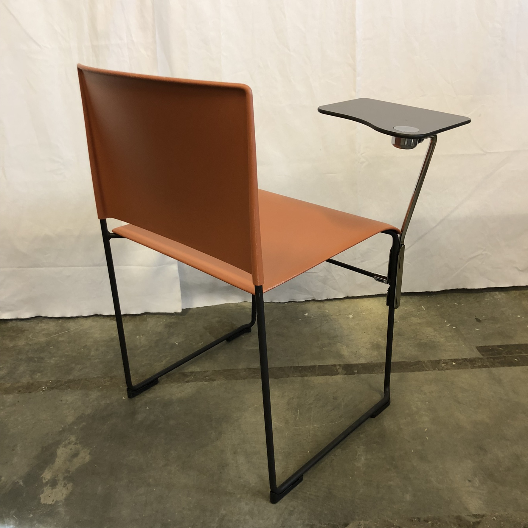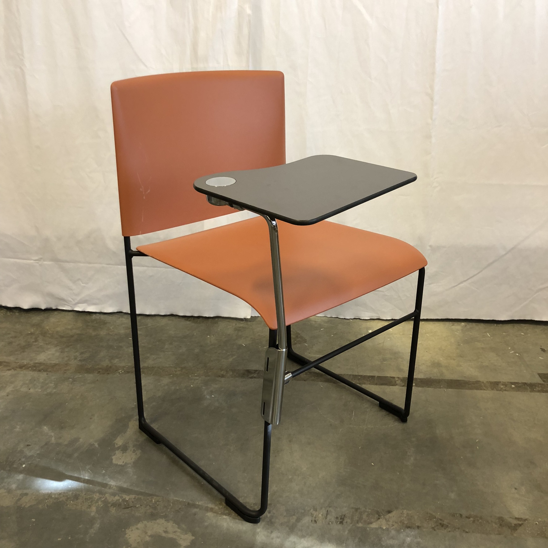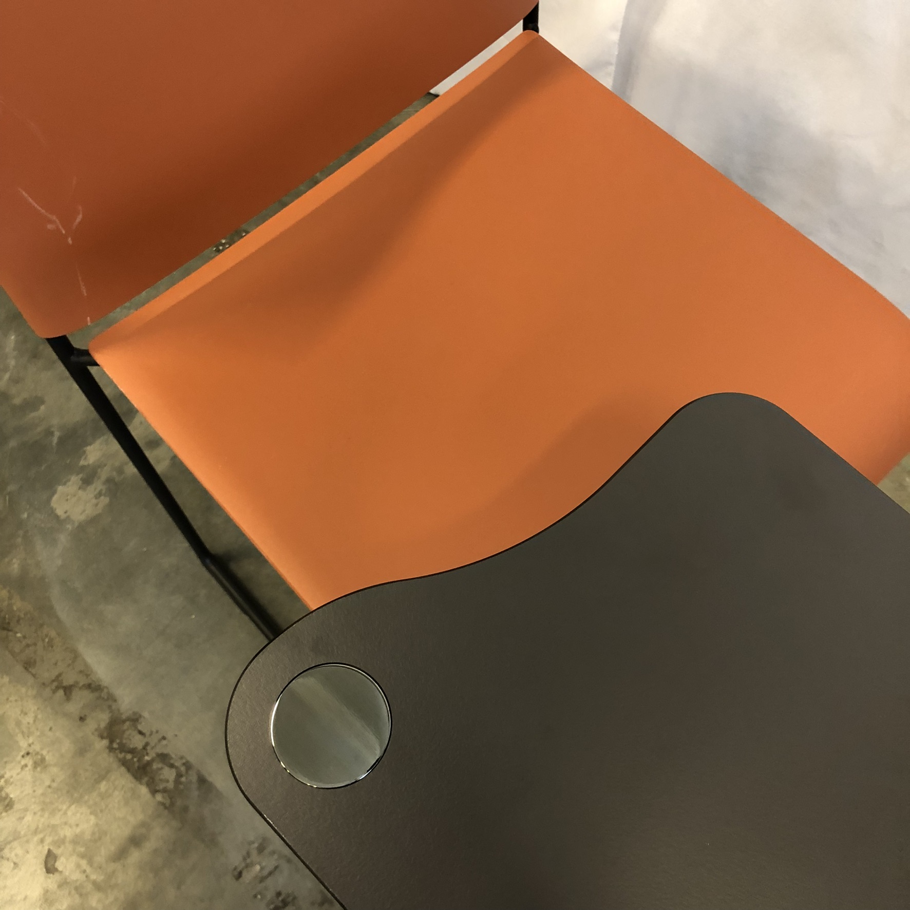 Seat and backrest in plastic (orange). Sledgebase in metal (black).