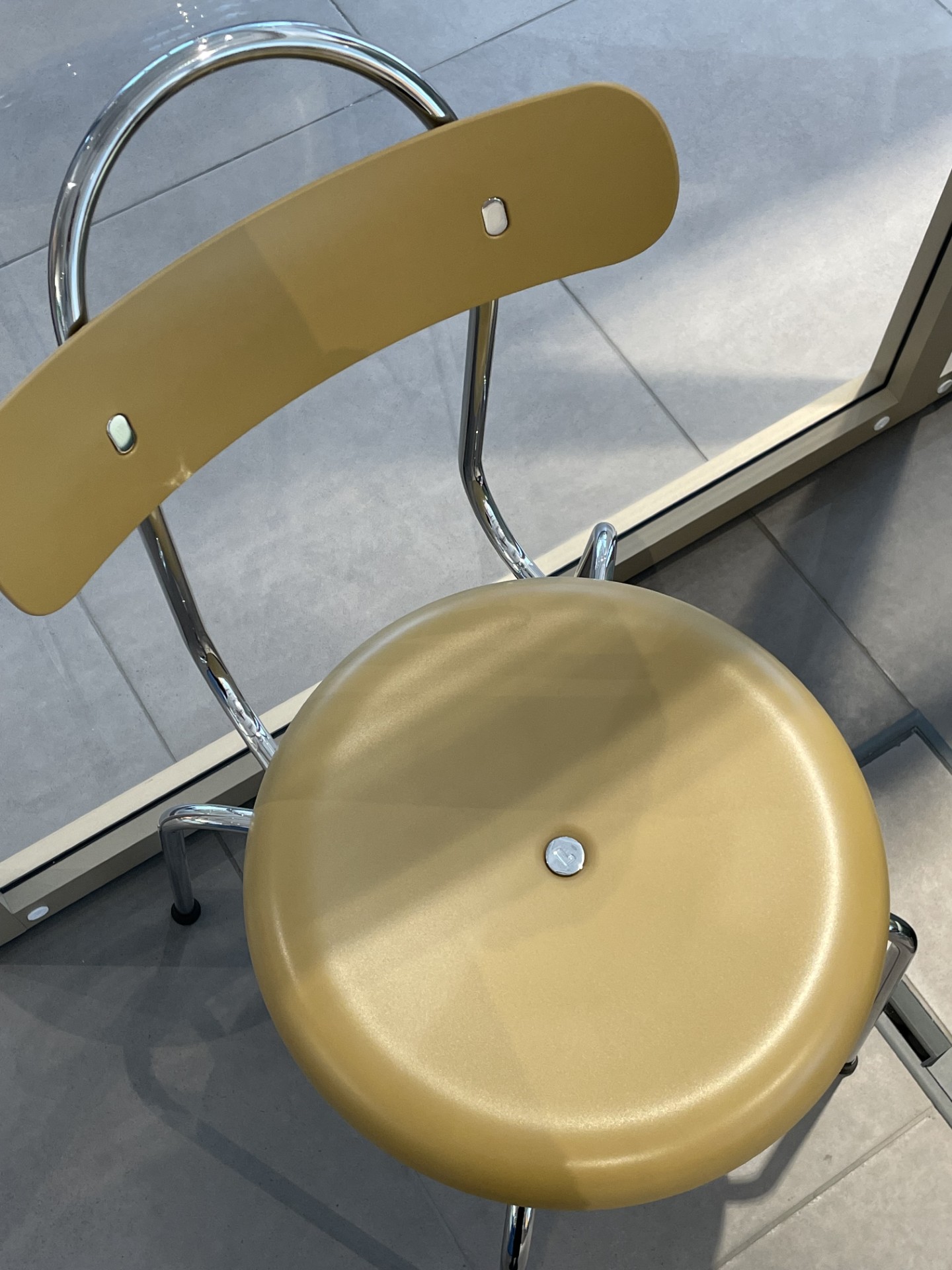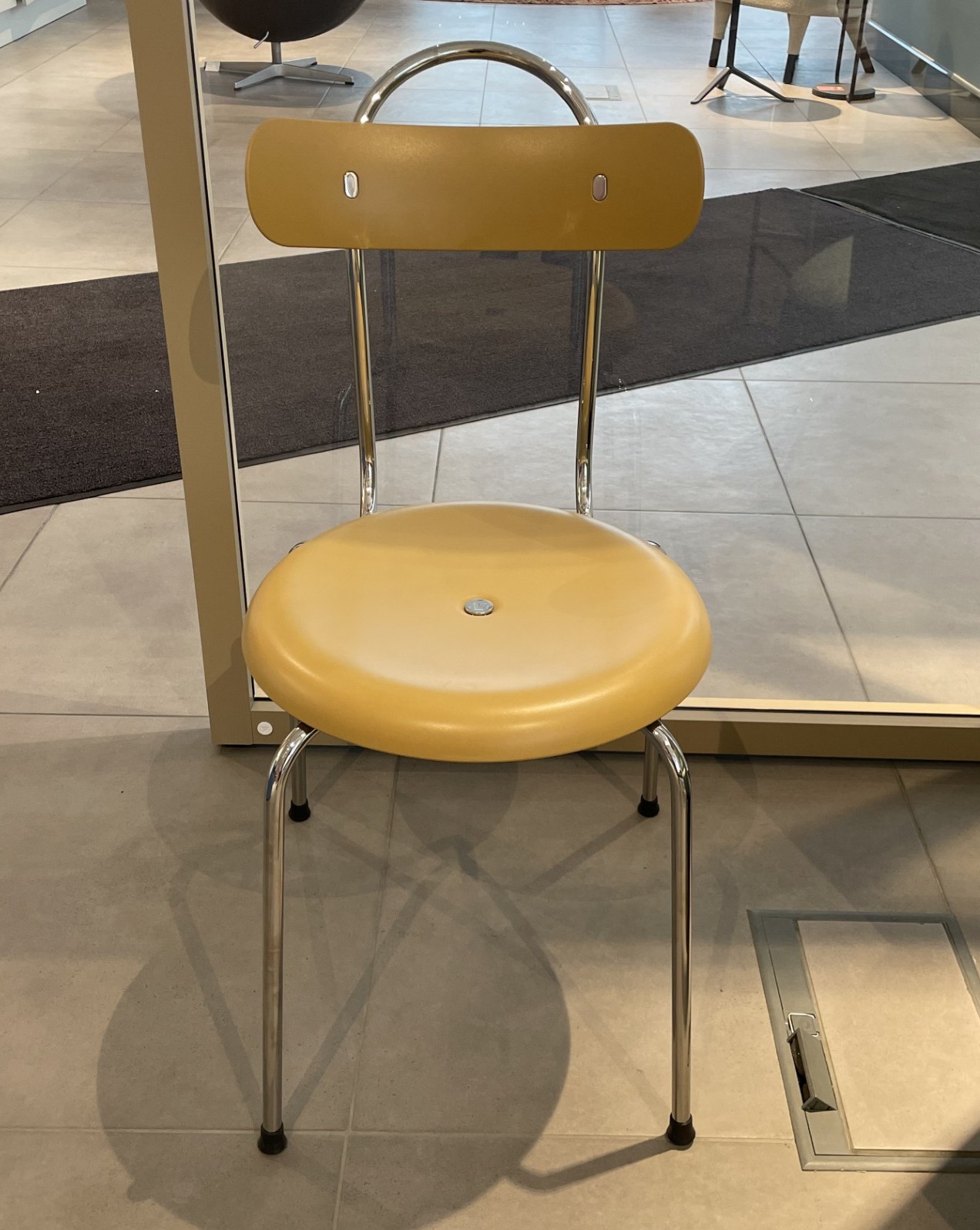 Seat and backrest in plastic (yellow). Legs in metal (chrome).