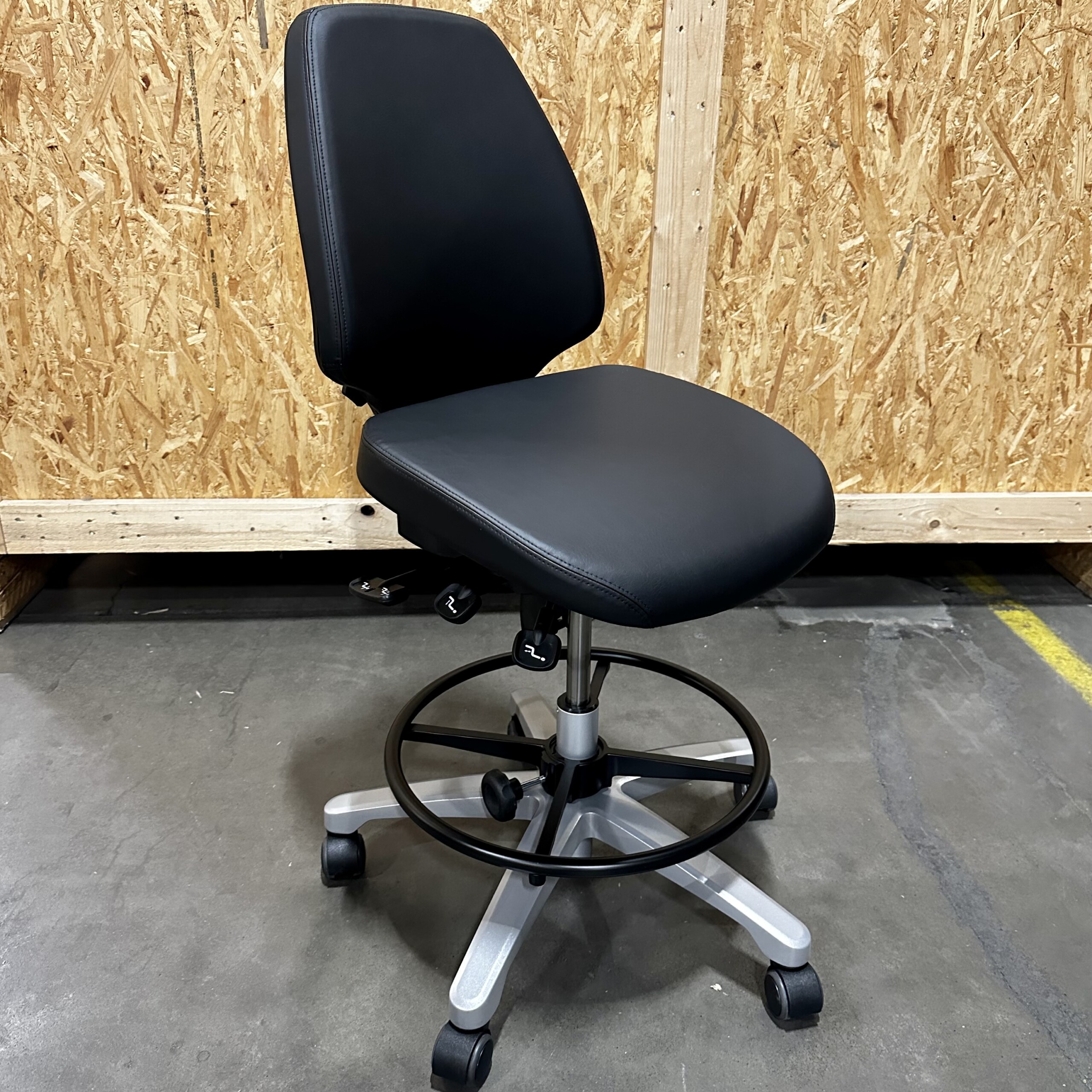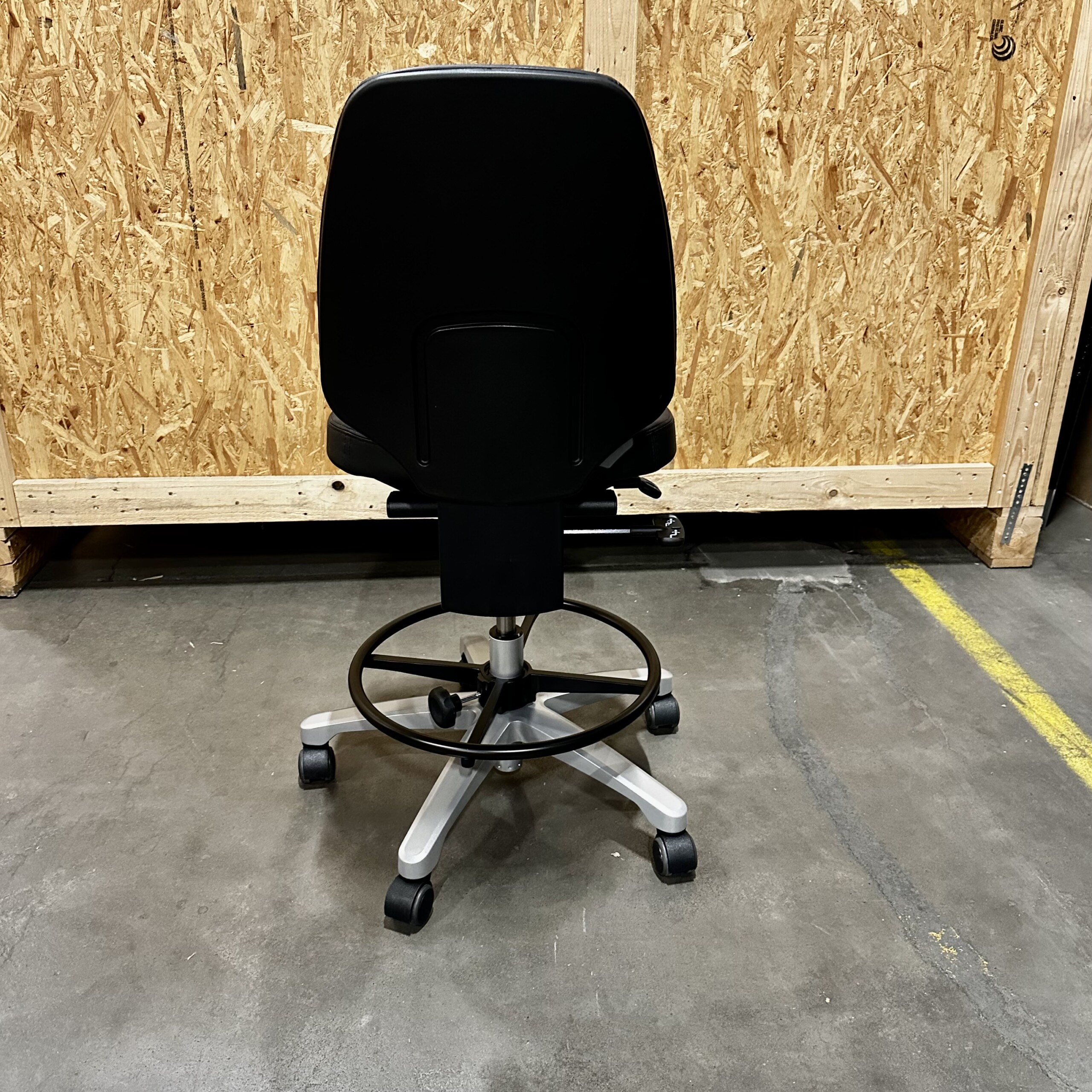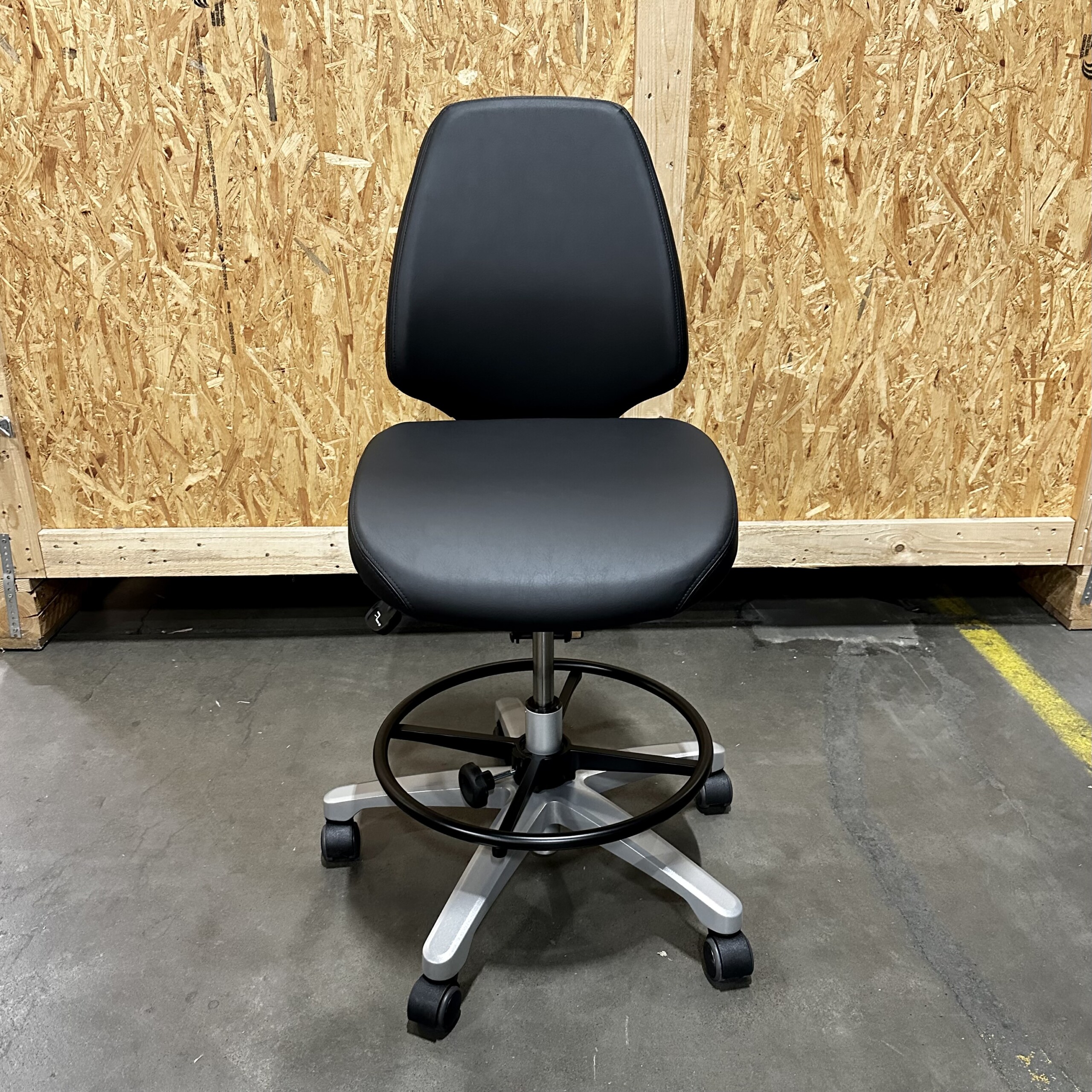 Seat and backrest in artificial leather (black). Star base in metal (silver). Adjustable height.