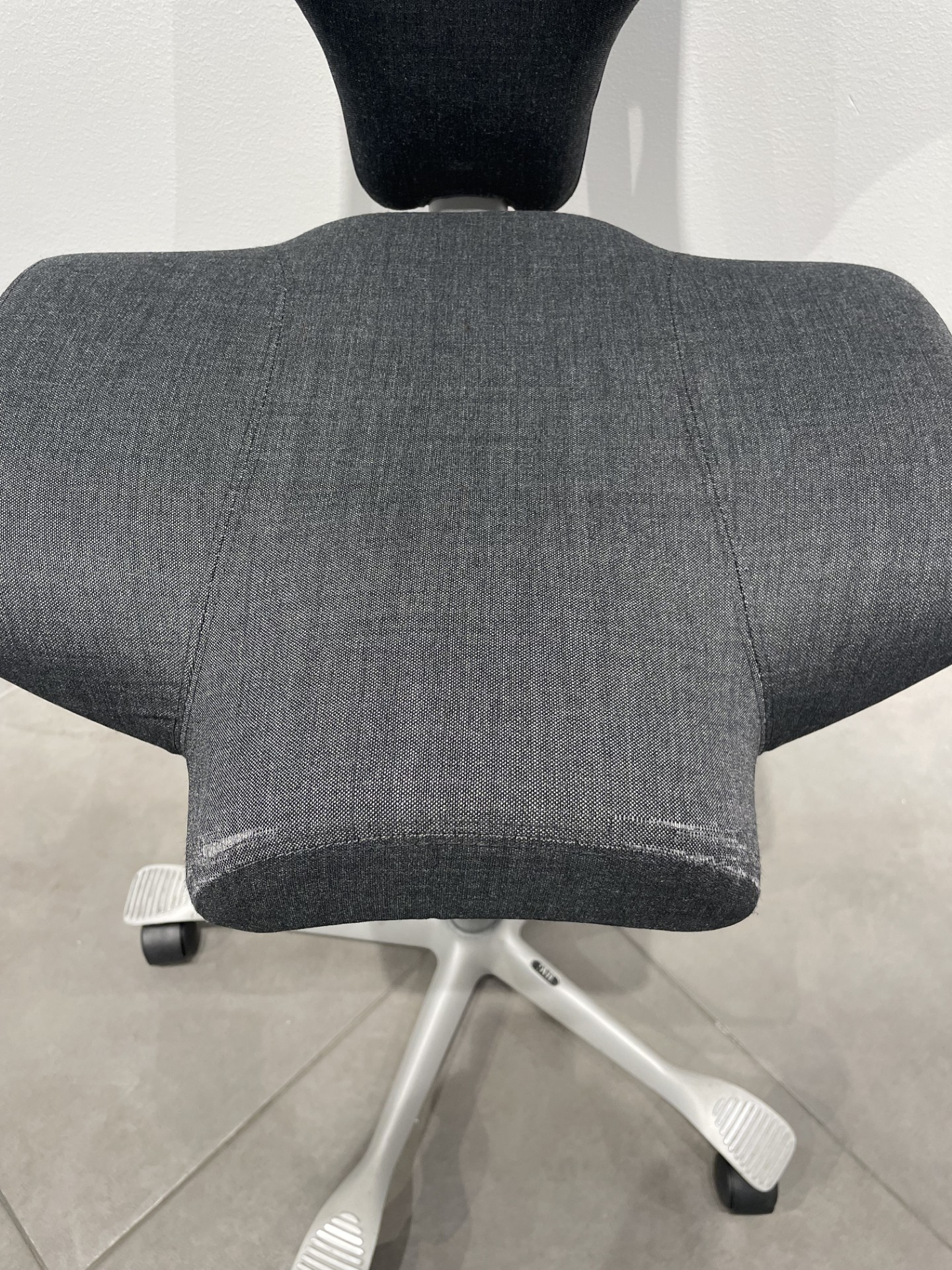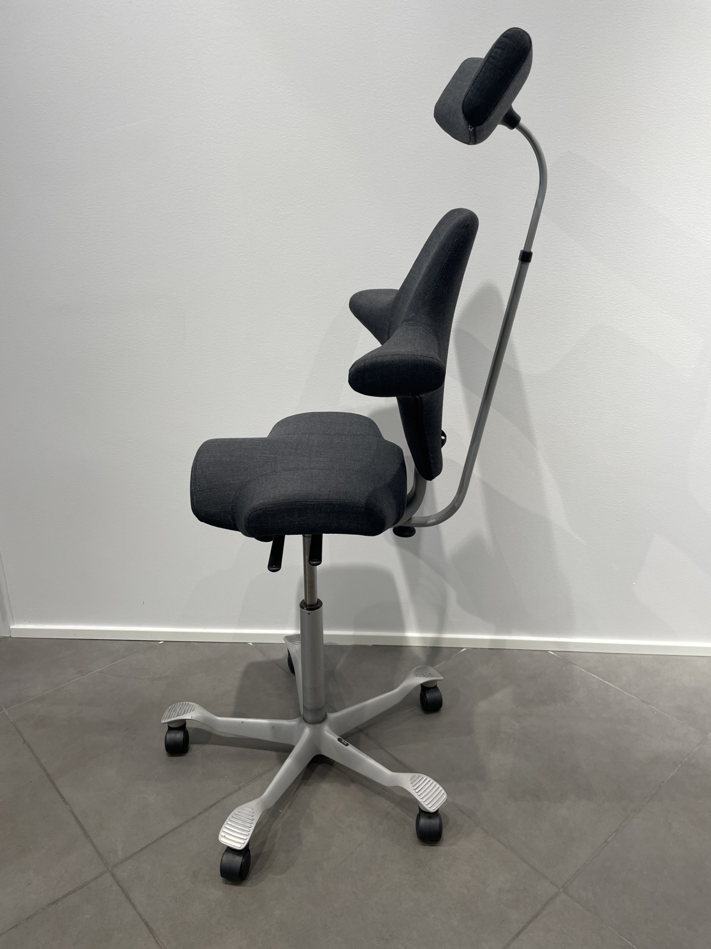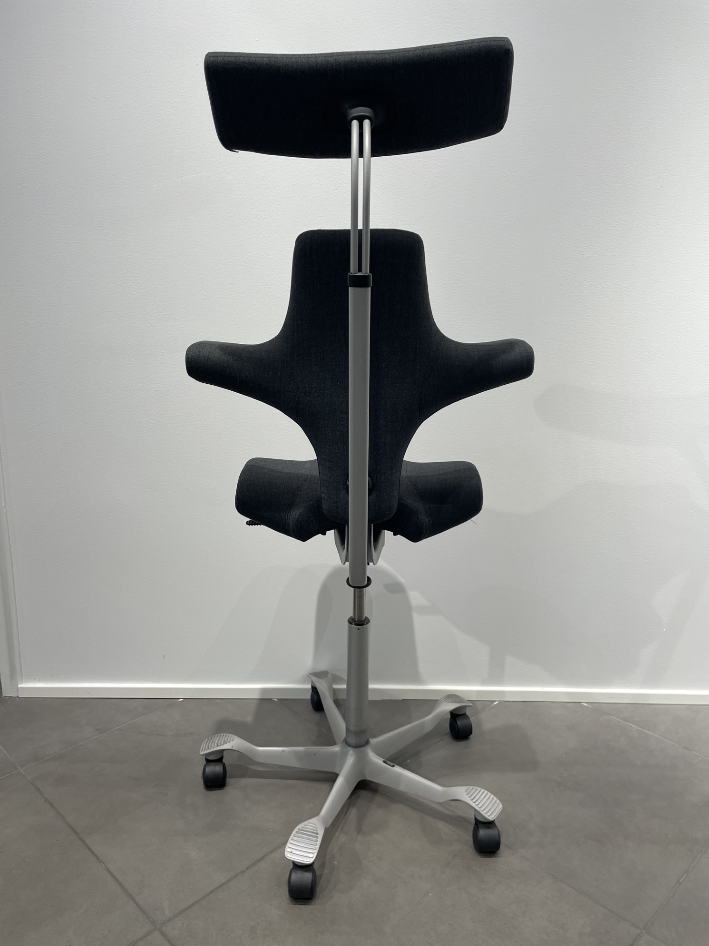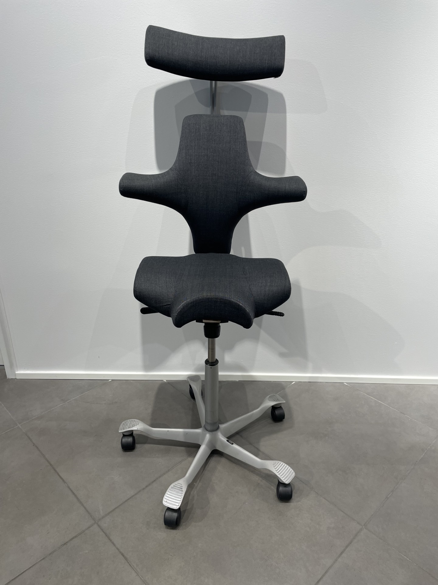 Seat and backrest in fabric (grey). Star base in metal (silver). Adjustable height.