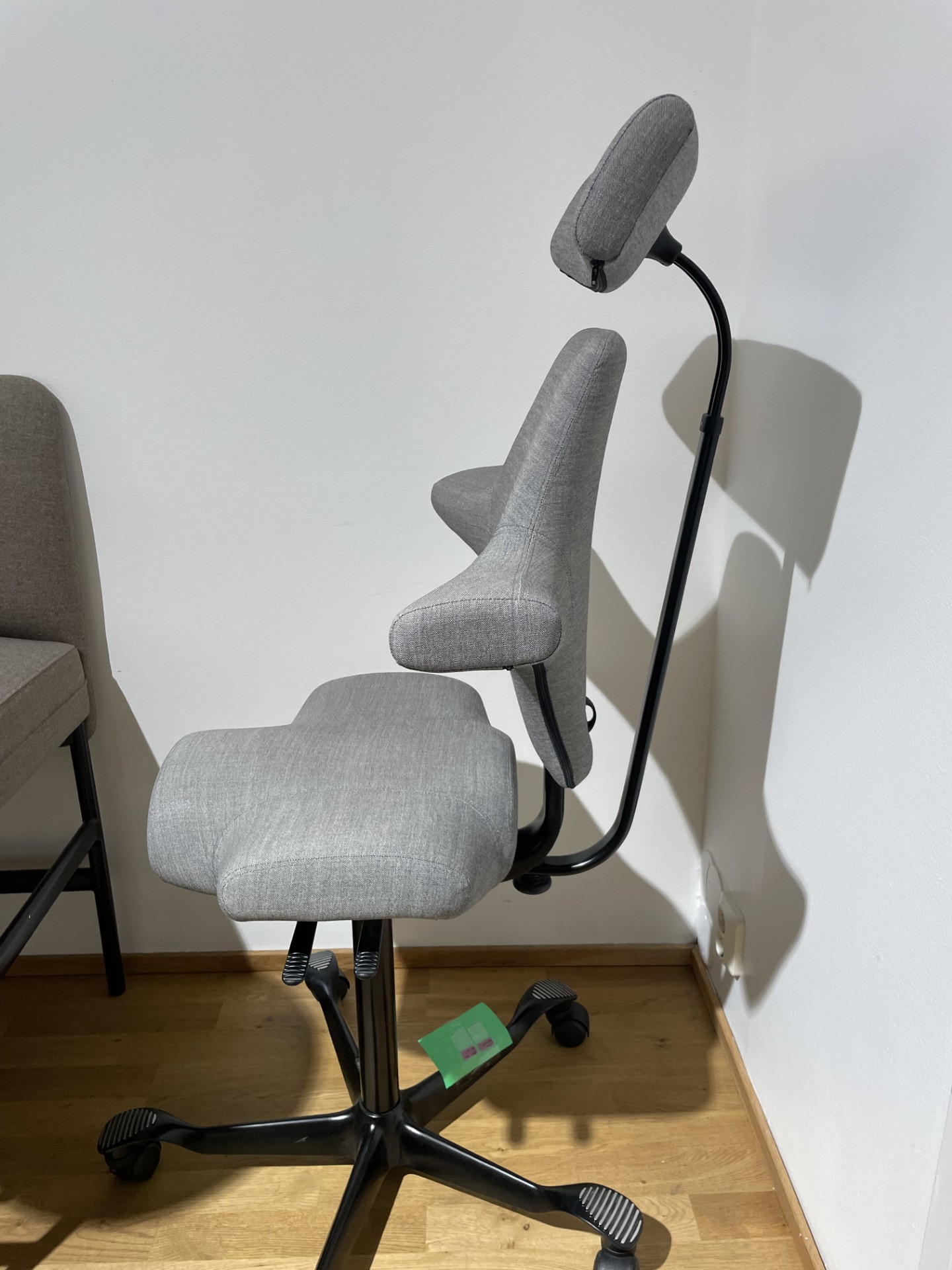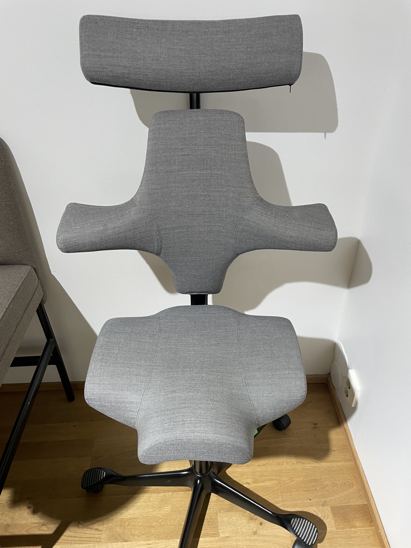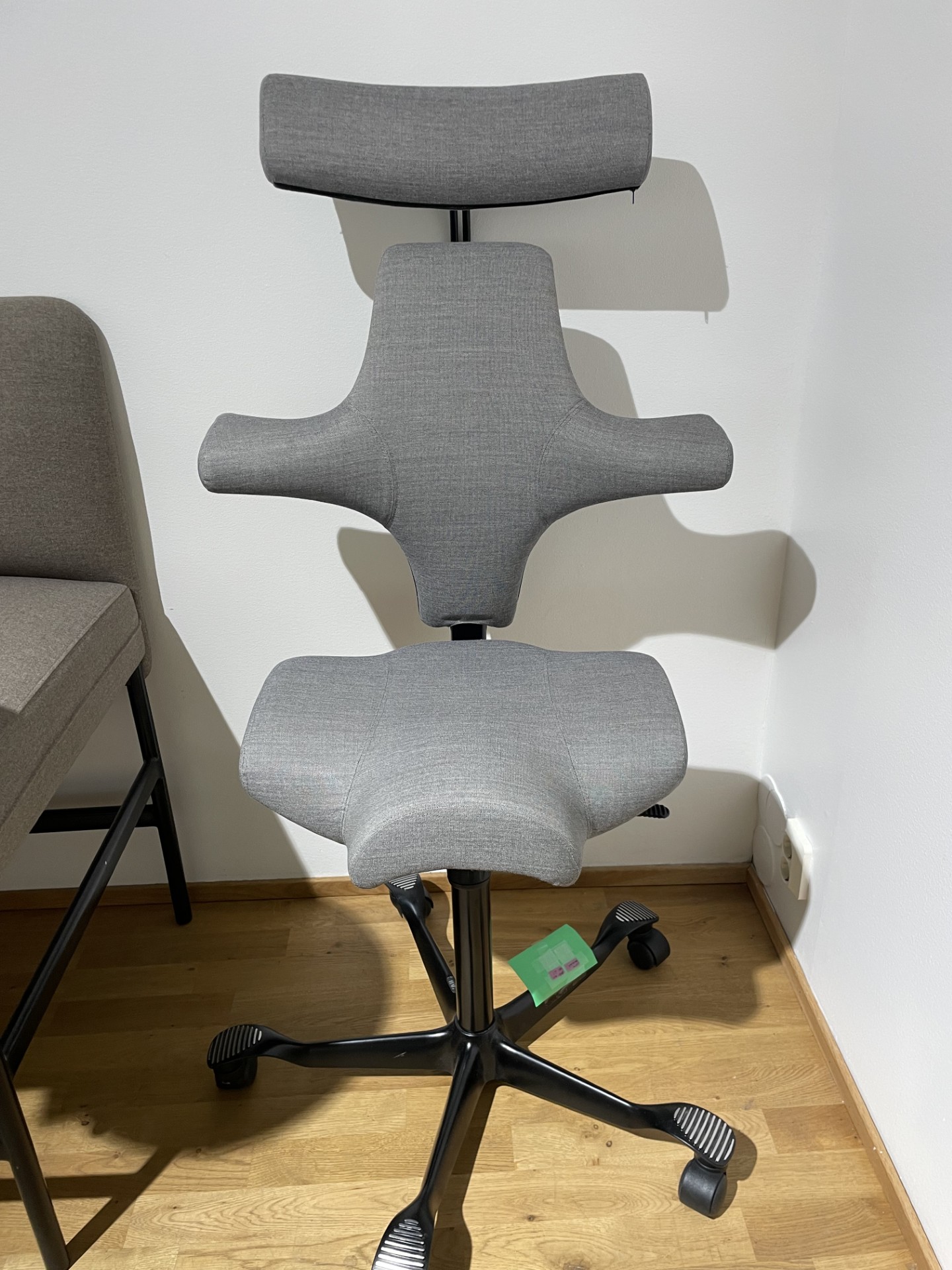 Seat and backrest in fabric (grey). Star base in metal (black). Adjustable height.