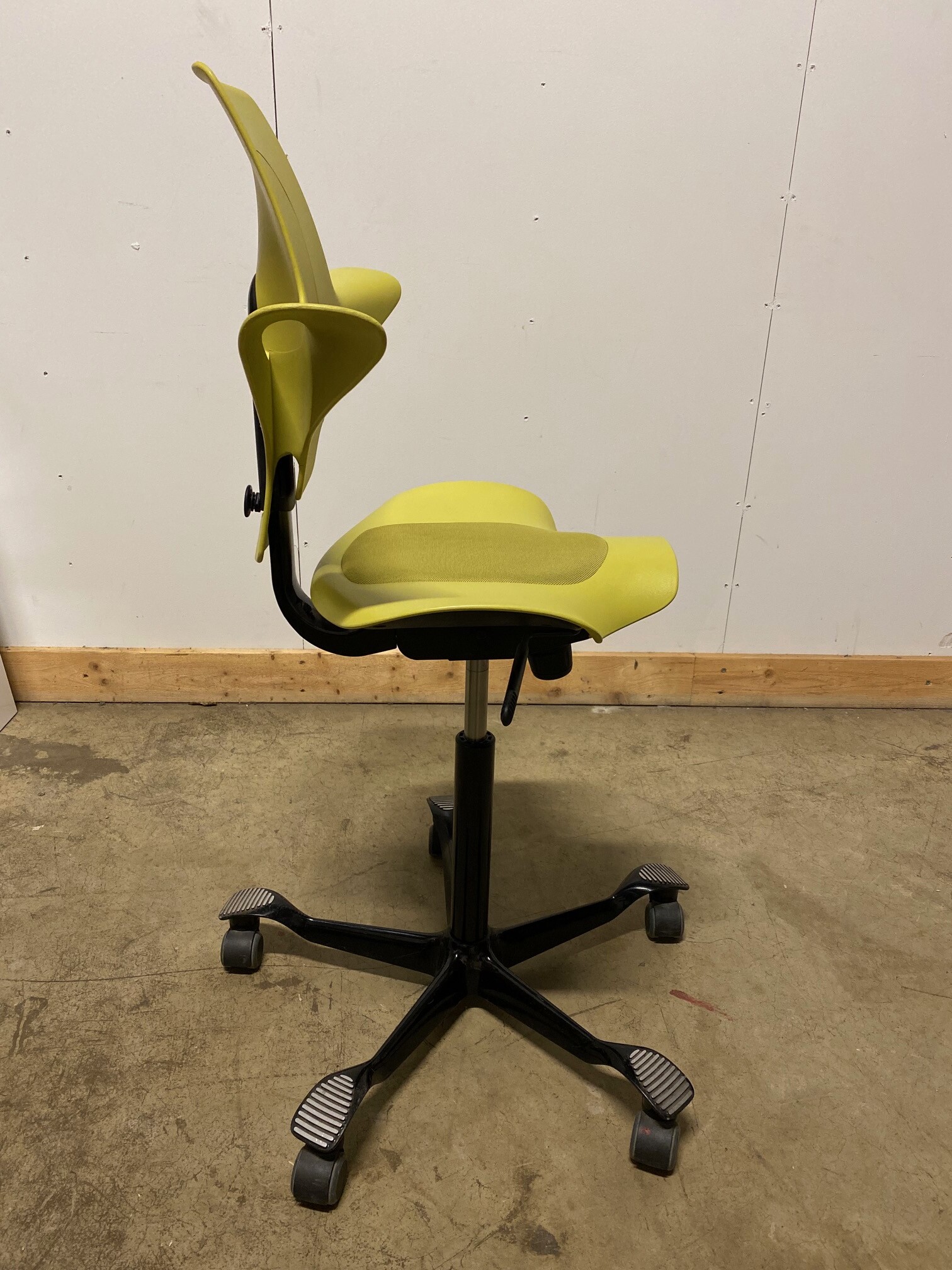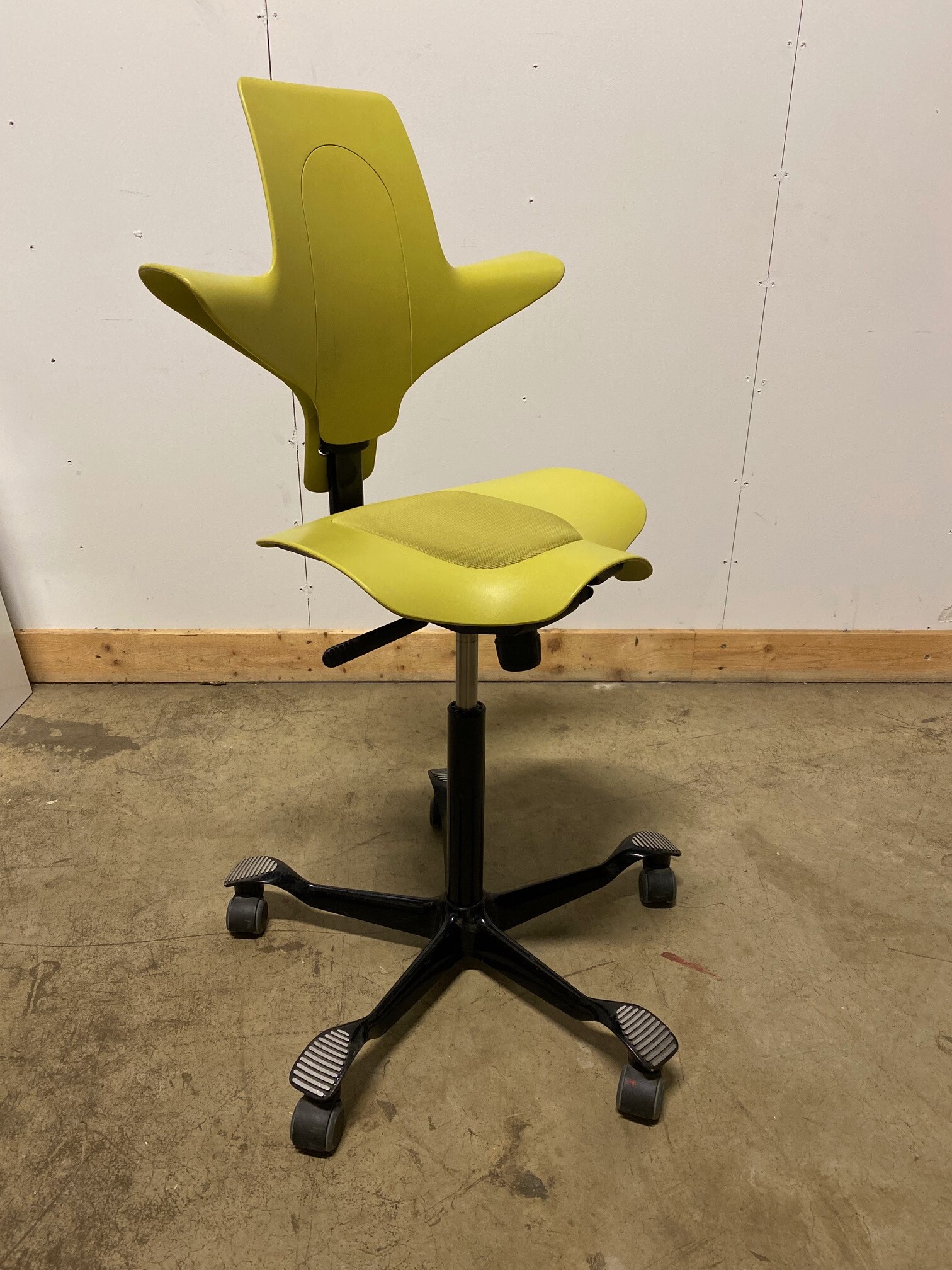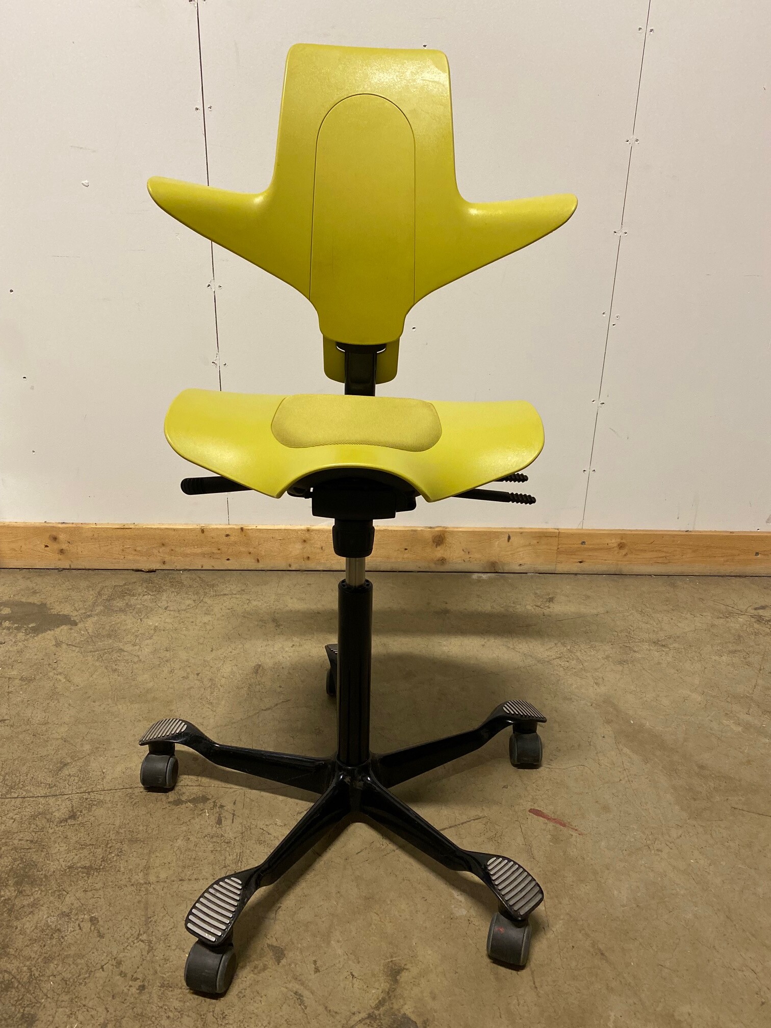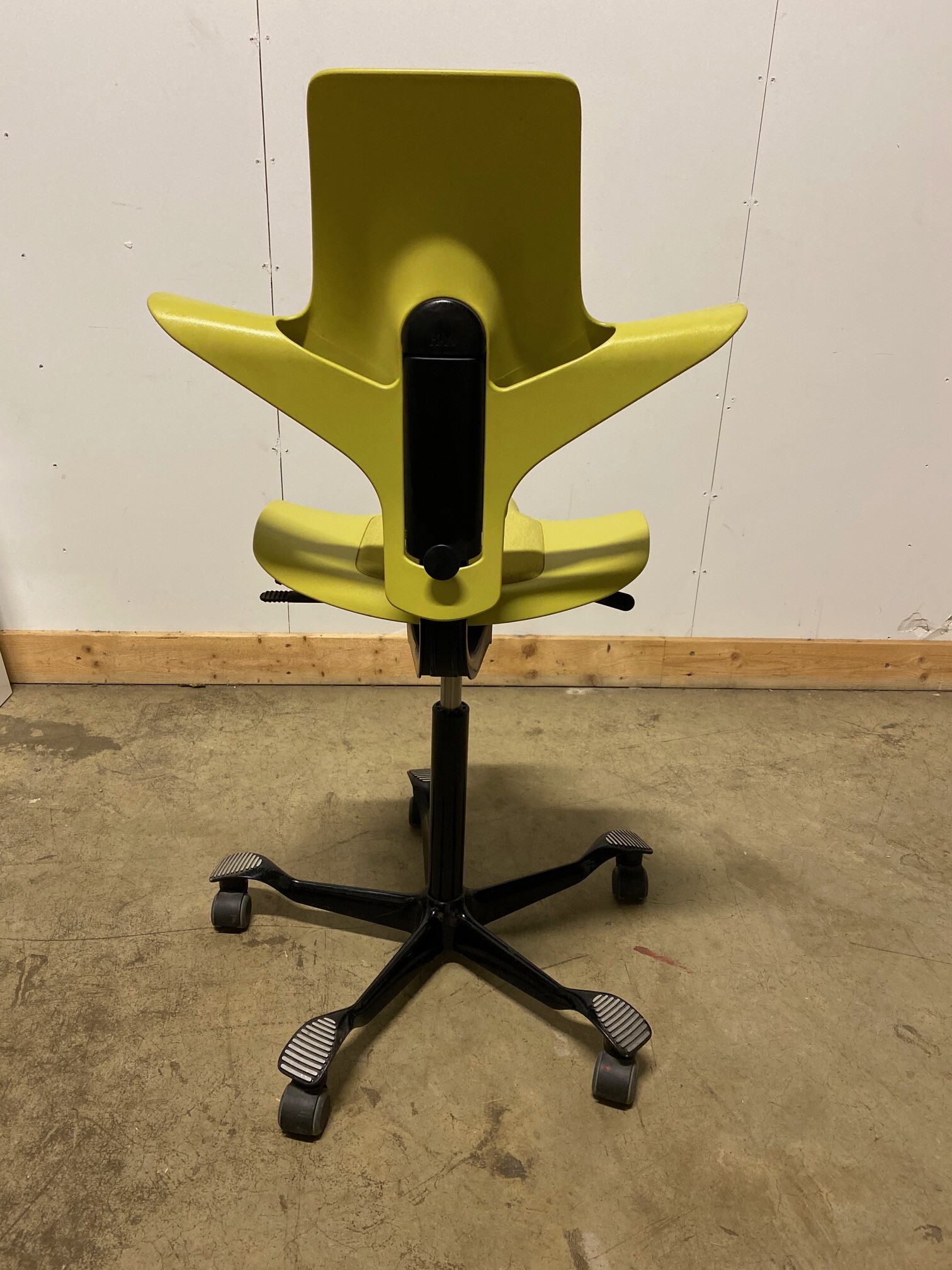 Seat in fabric (yellow). Backrest in plastic (yellow). Star base in metal (black). Adjustable height.
