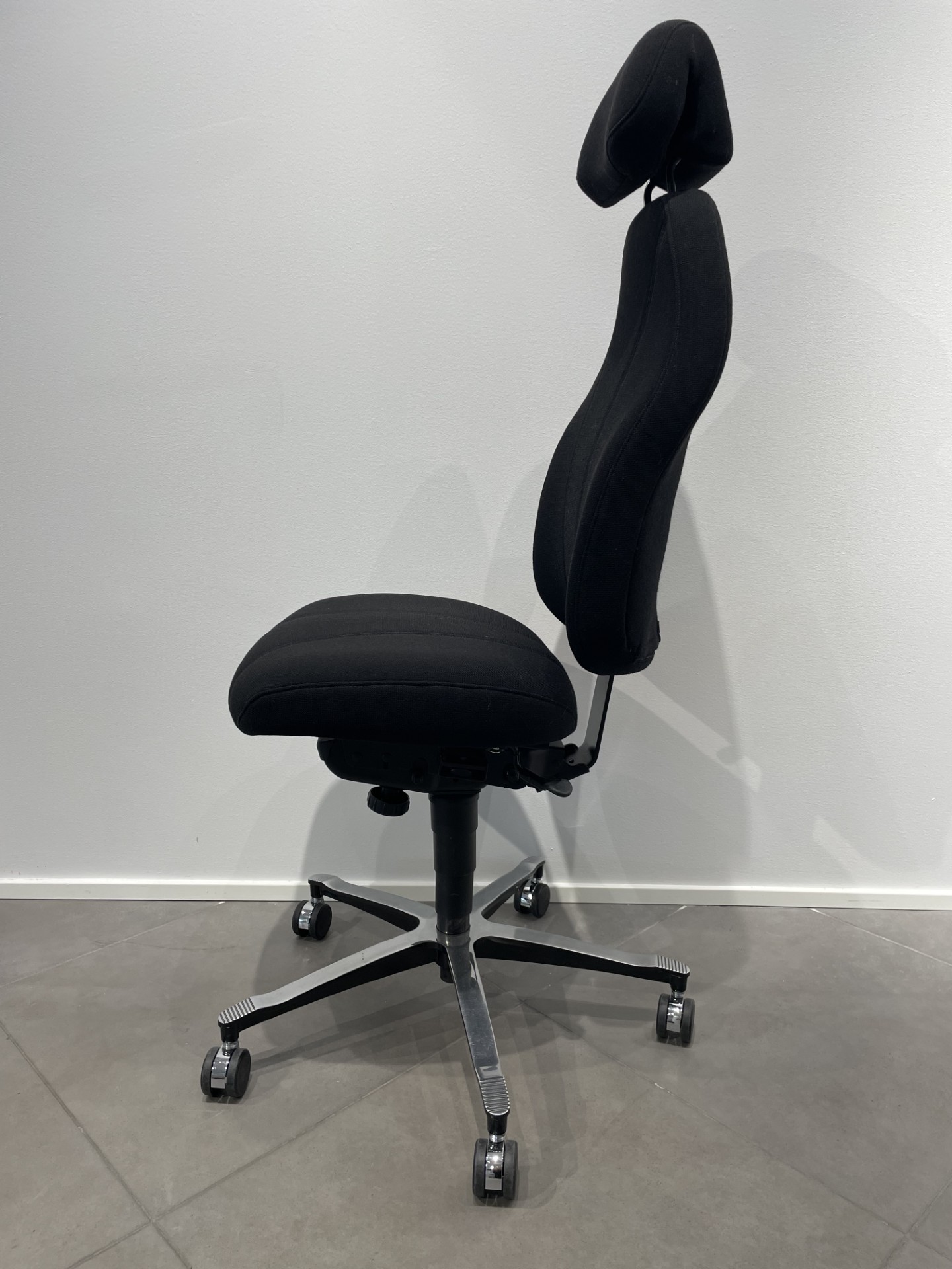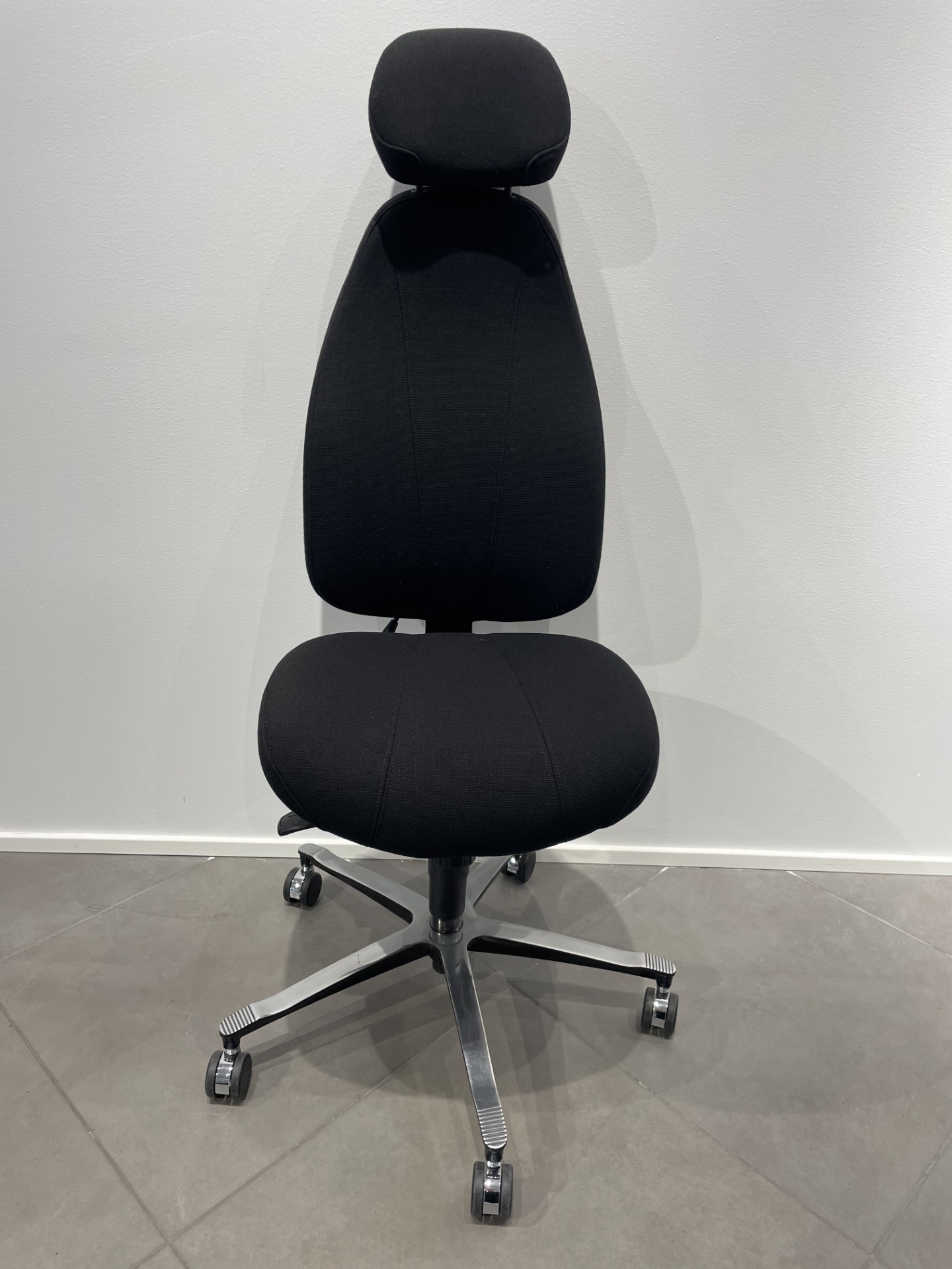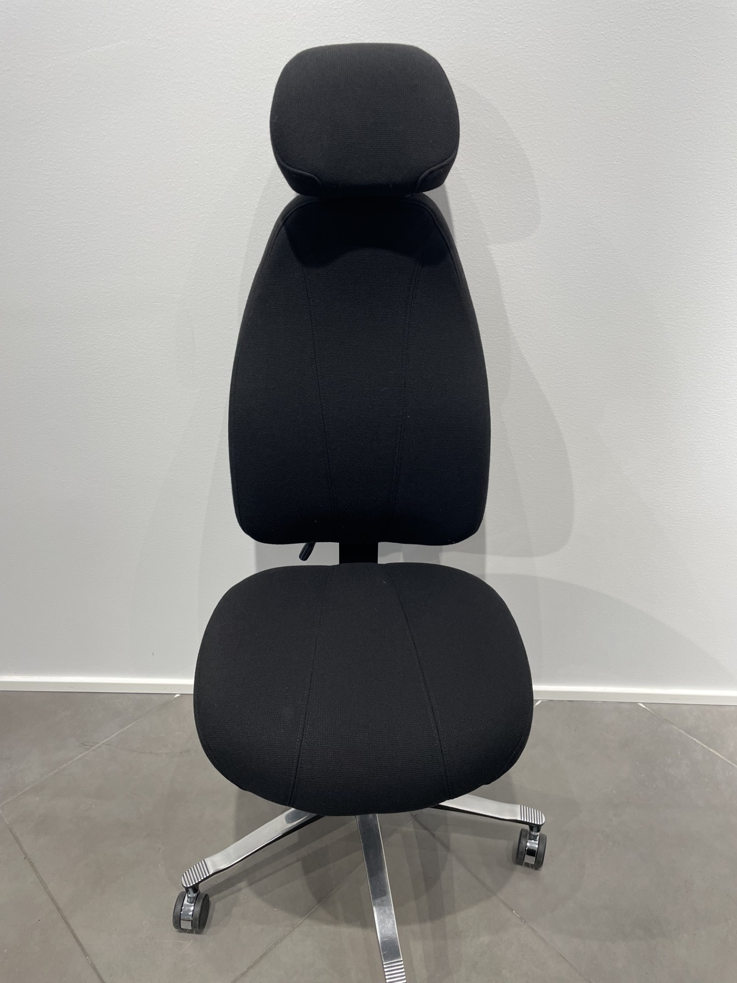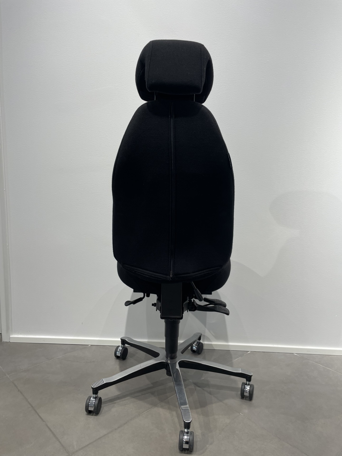 Seat and backrest in fabric (black). Star base in metal (silver). Adjustable height.