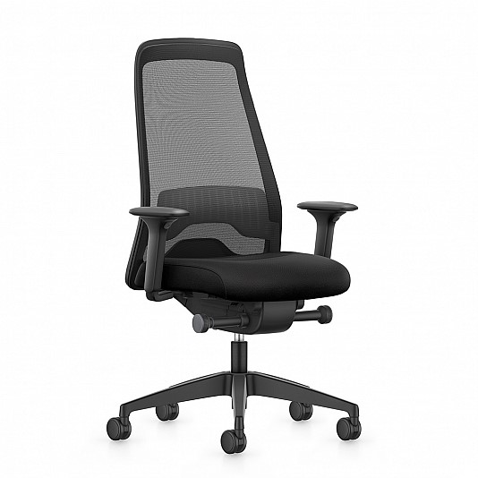 Seat in fabric (black). Backrest in mesh (black). Star base in plastic (black). Adjustable height.