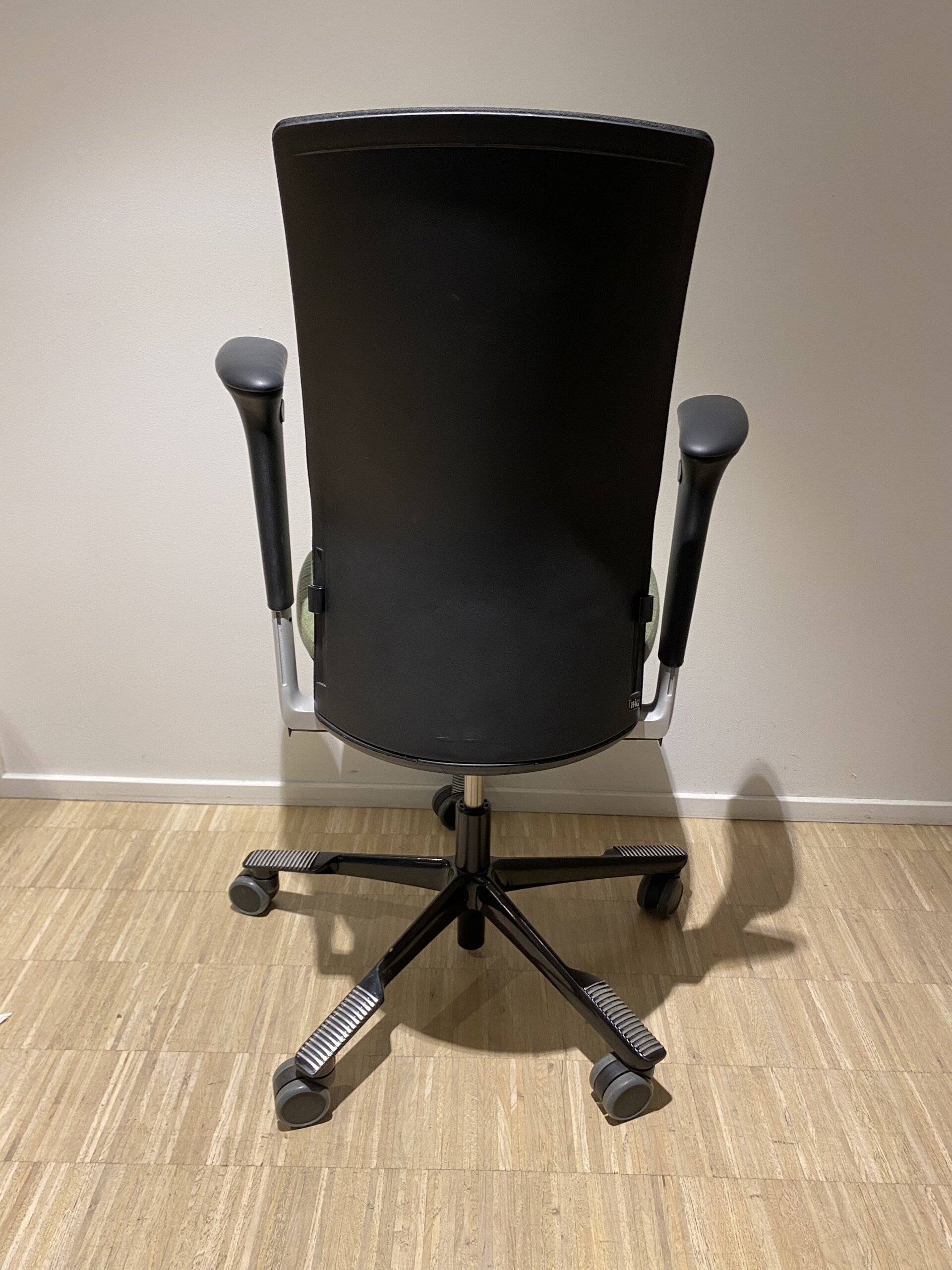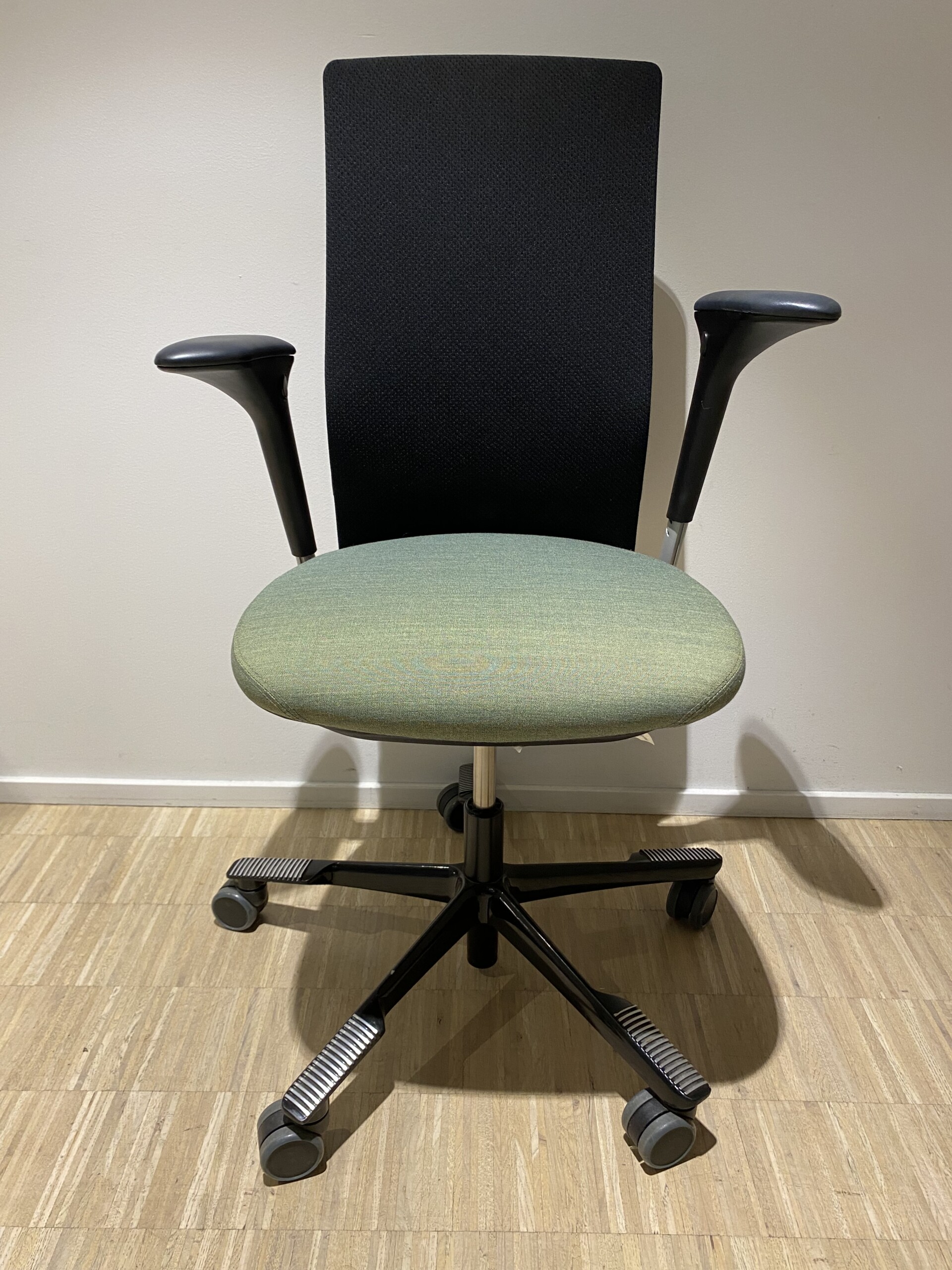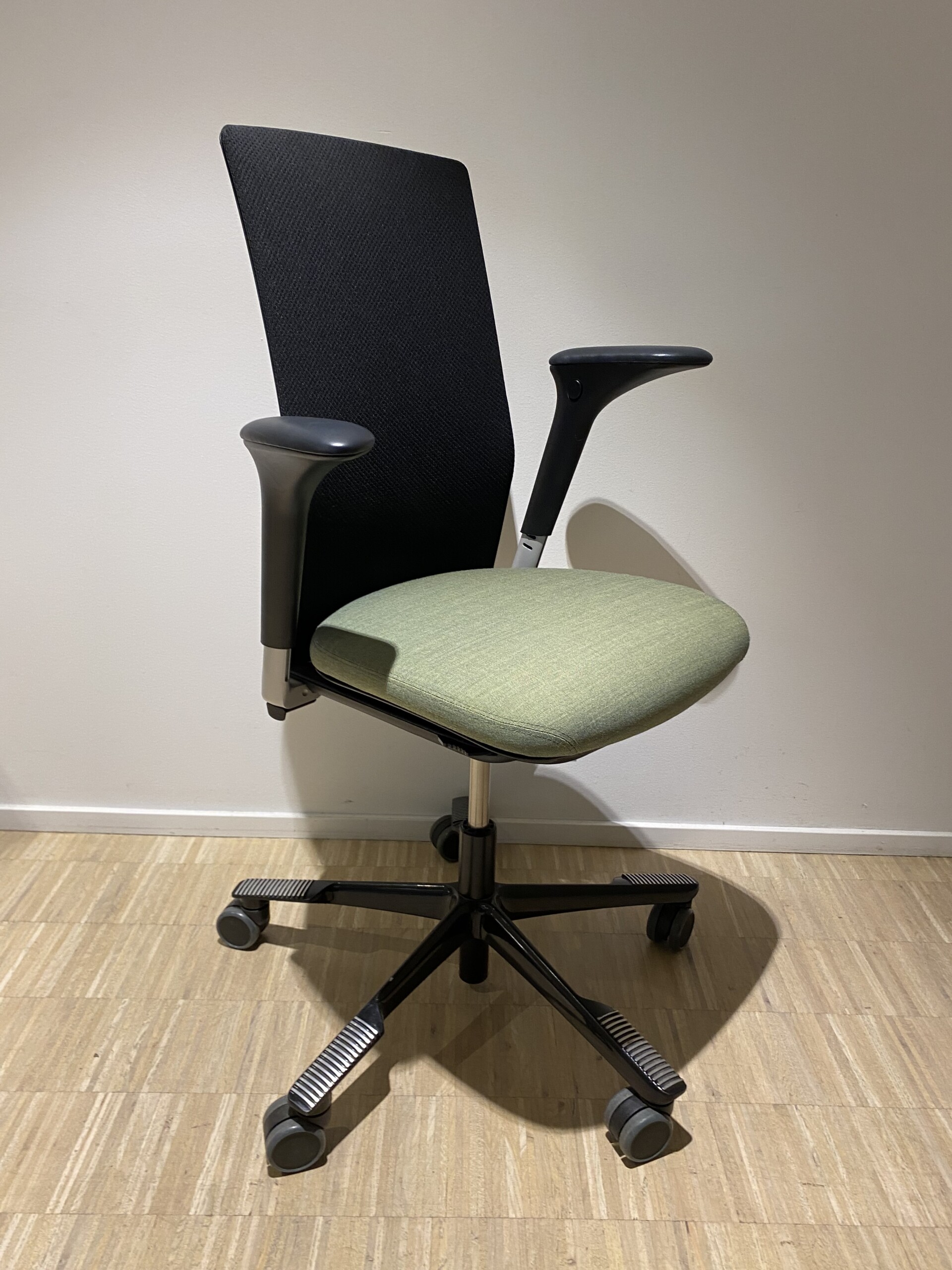 Seat in fabric (green). Backrest in mesh (black). Star base in metal (black). Adjustable height.