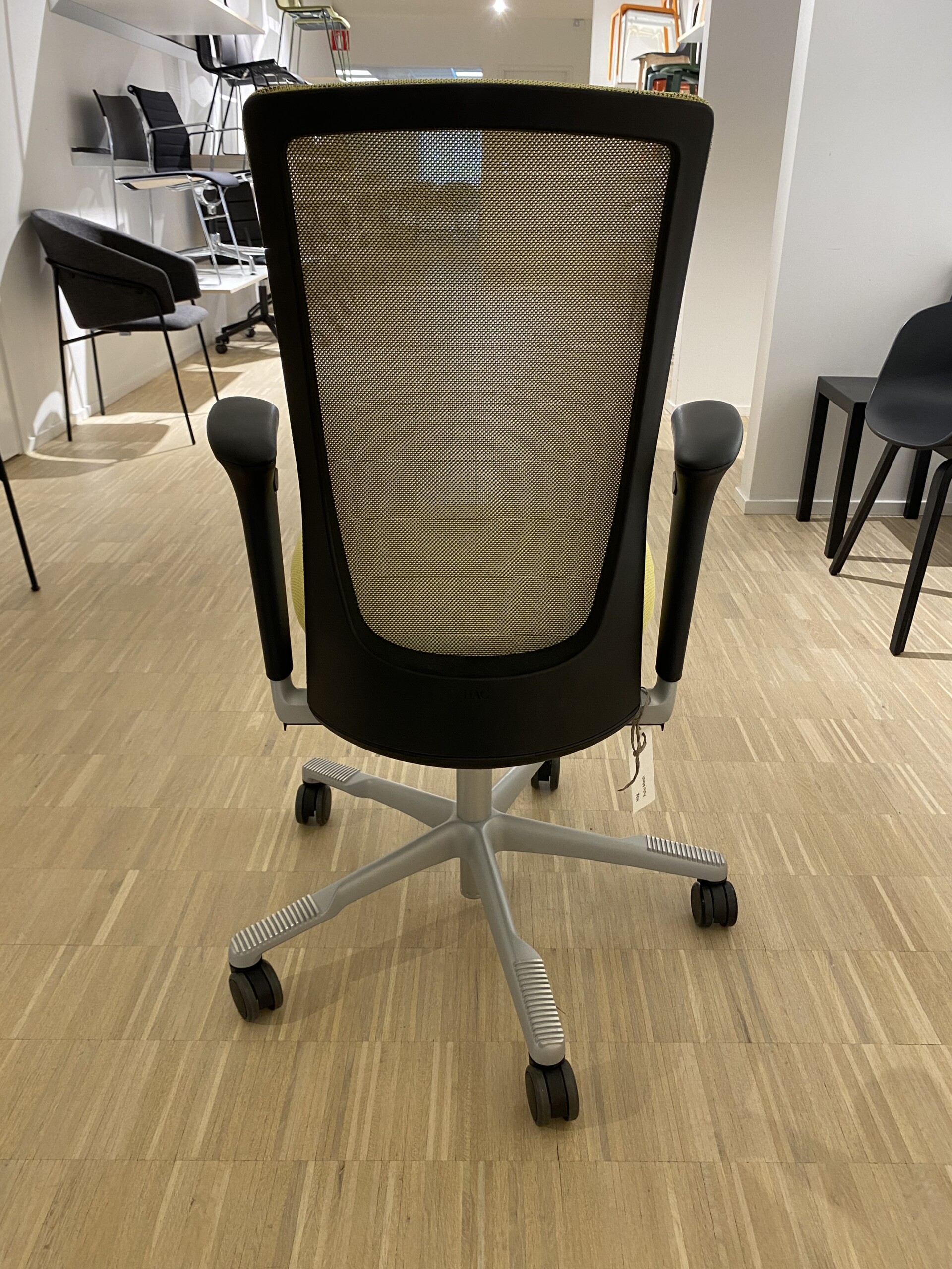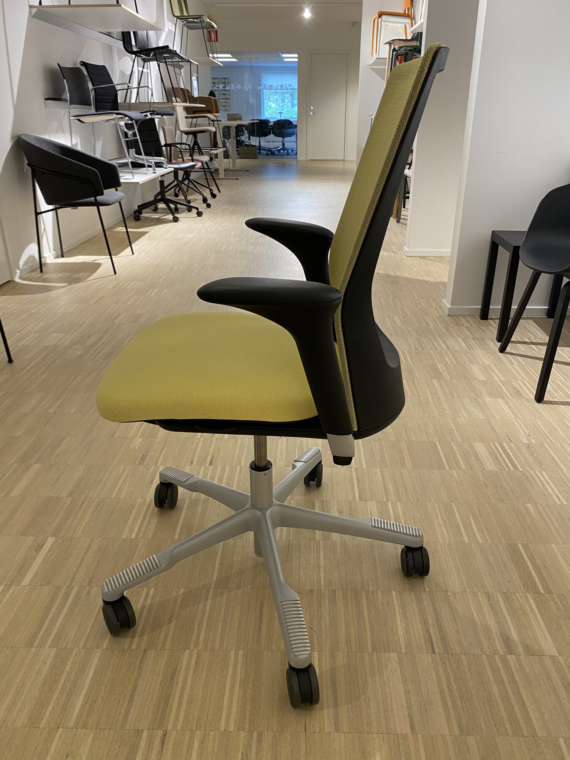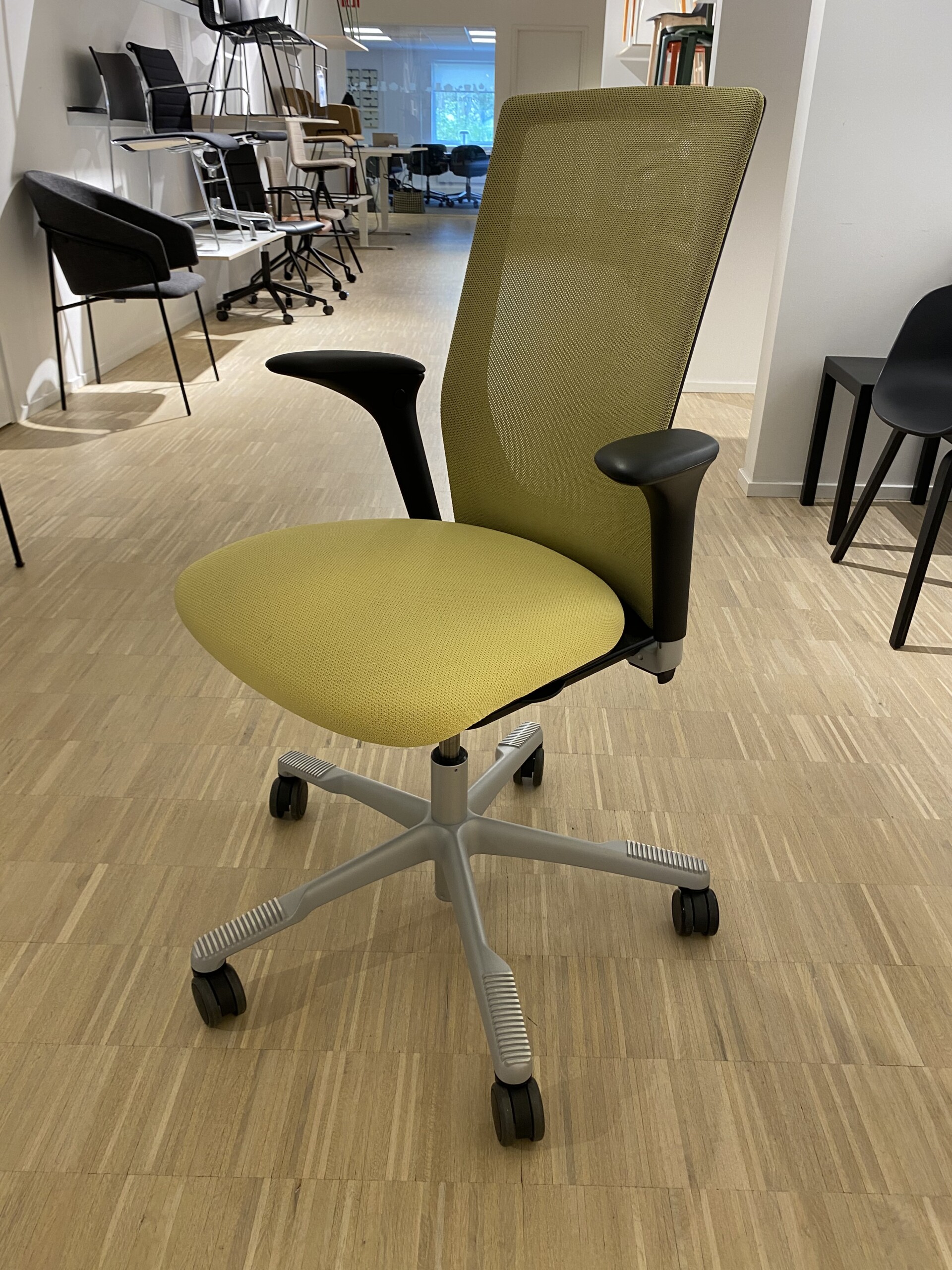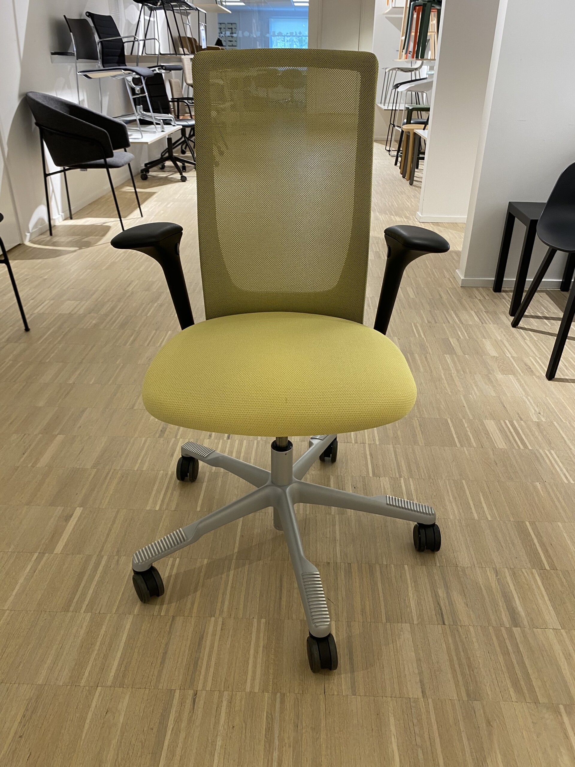 Seat in fabric (yellow). Backrest in mesh (yellow). Star base in metal (silver). Adjustable height.