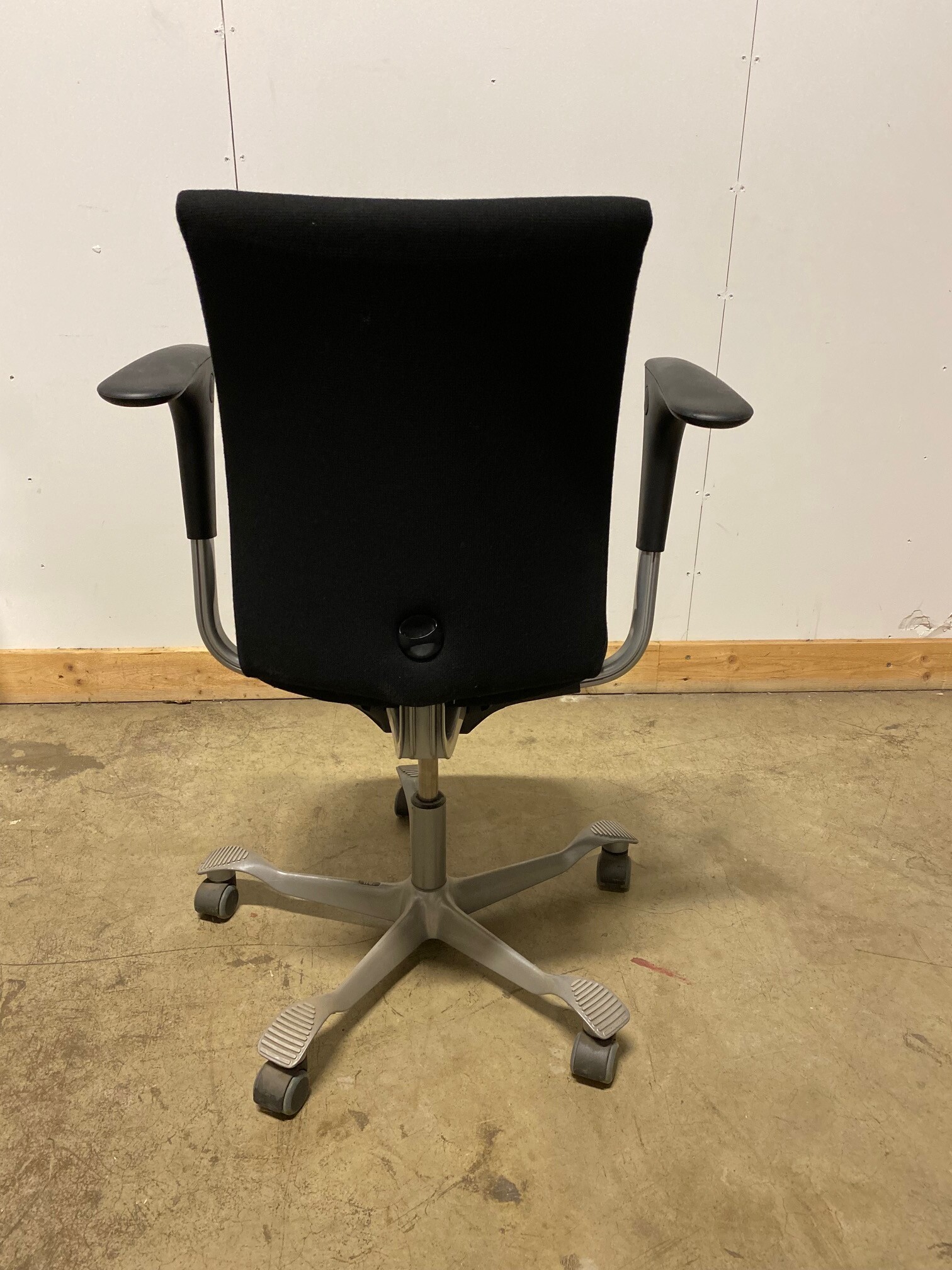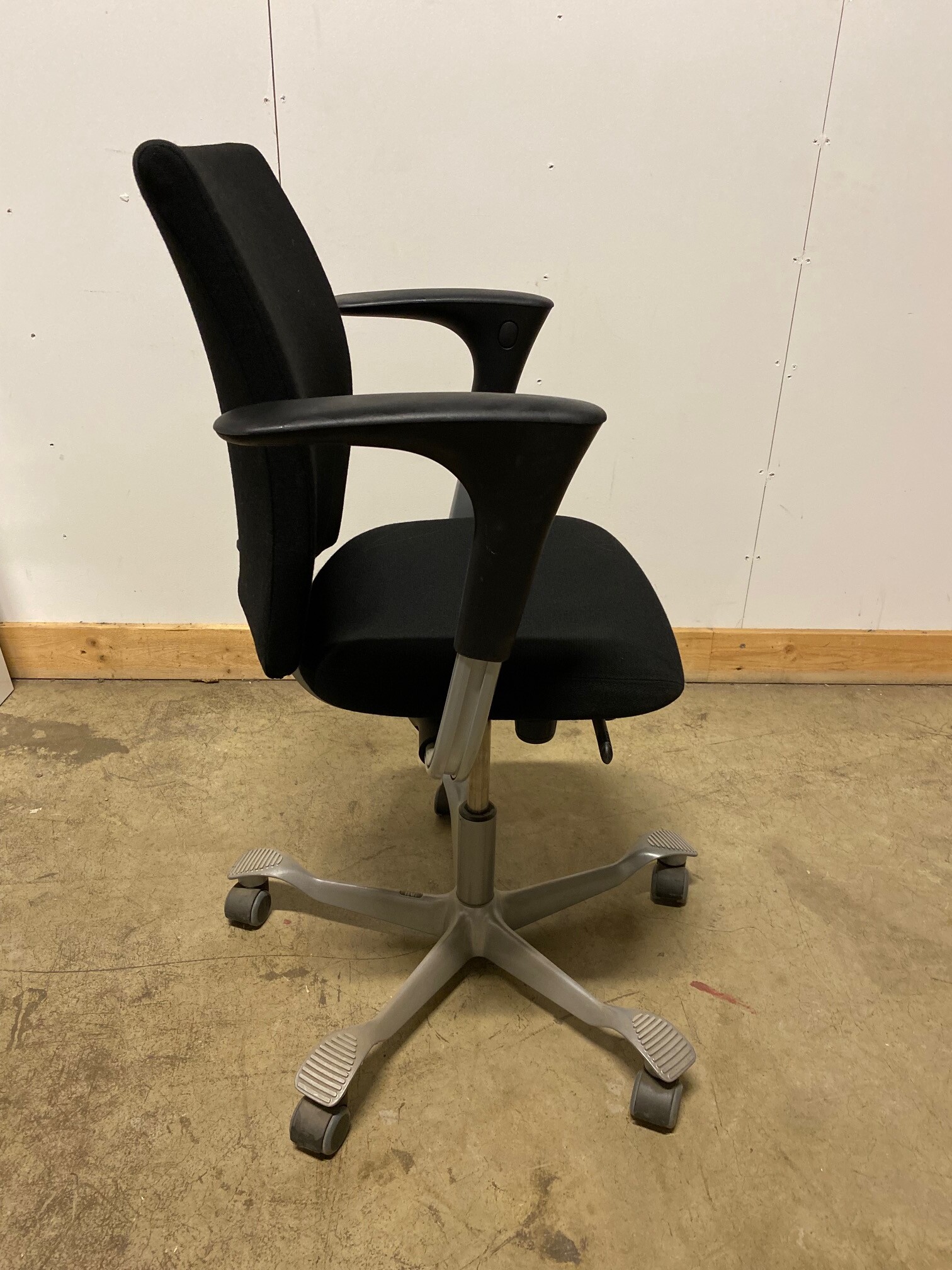 Seat and backrest in fabric (black). Star base in metal (grey). Adjustable height.