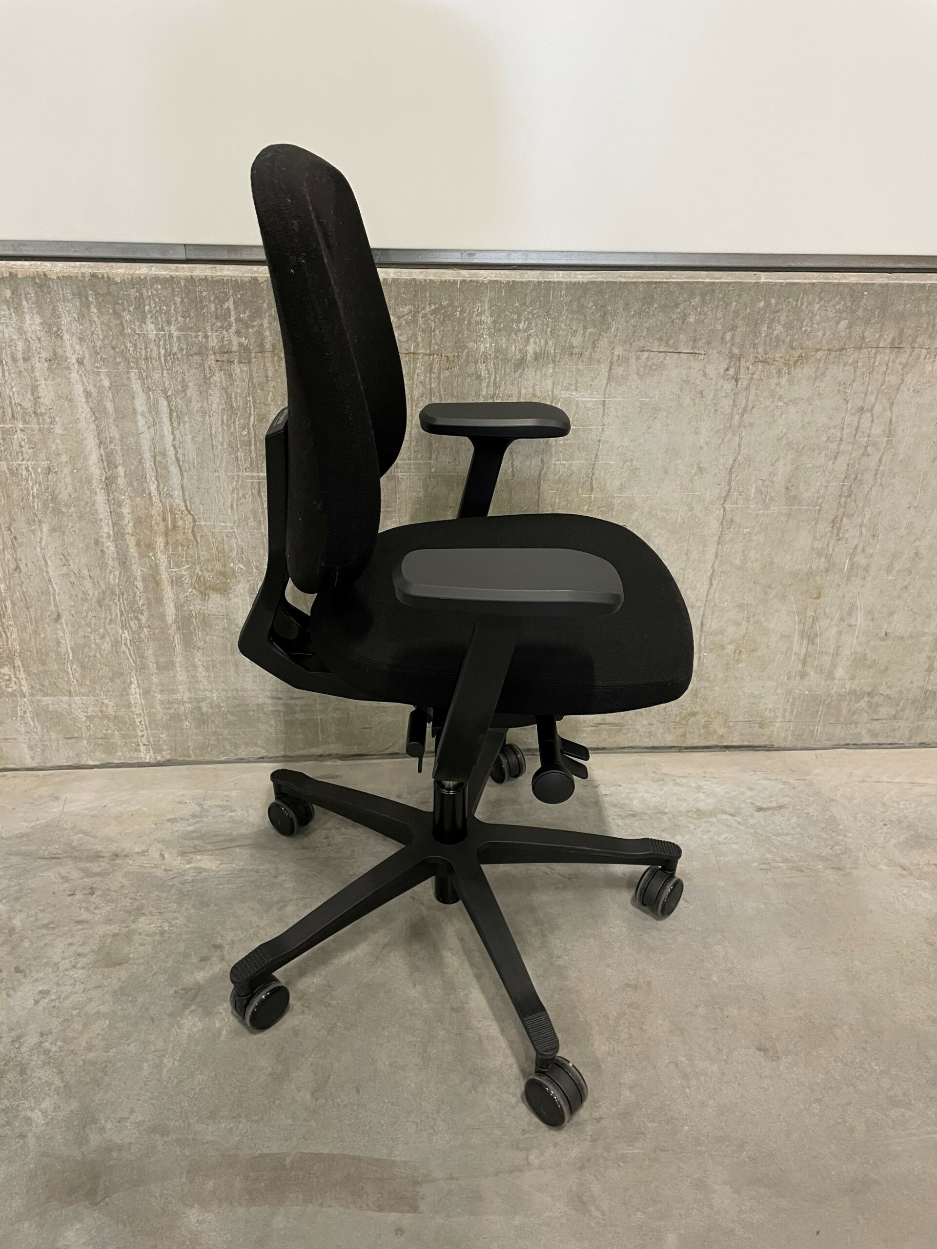 Seat and backrest in fabric (black). Star base in plastic (black). Adjustable height.
