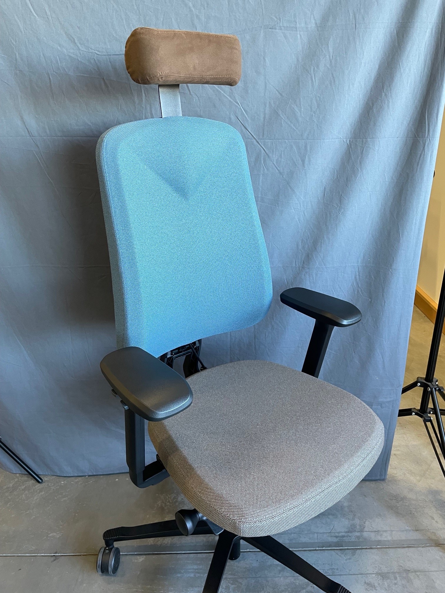 Seat in fabric (grey). Backrest in fabric (blue). Star base in metal (black). Adjustable height.