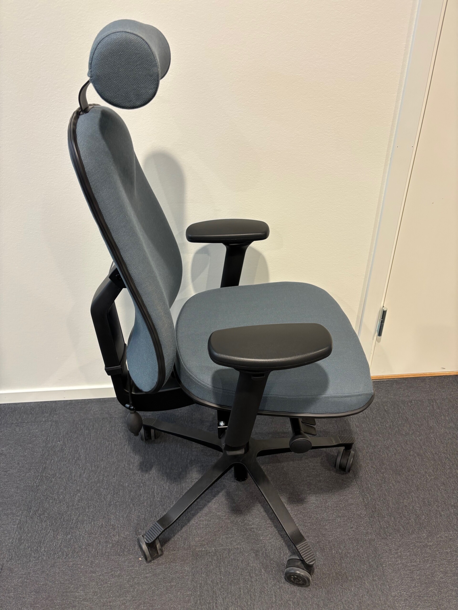 Seat and backrest in fabric (blue). Star base in metal (black). Adjustable height.
