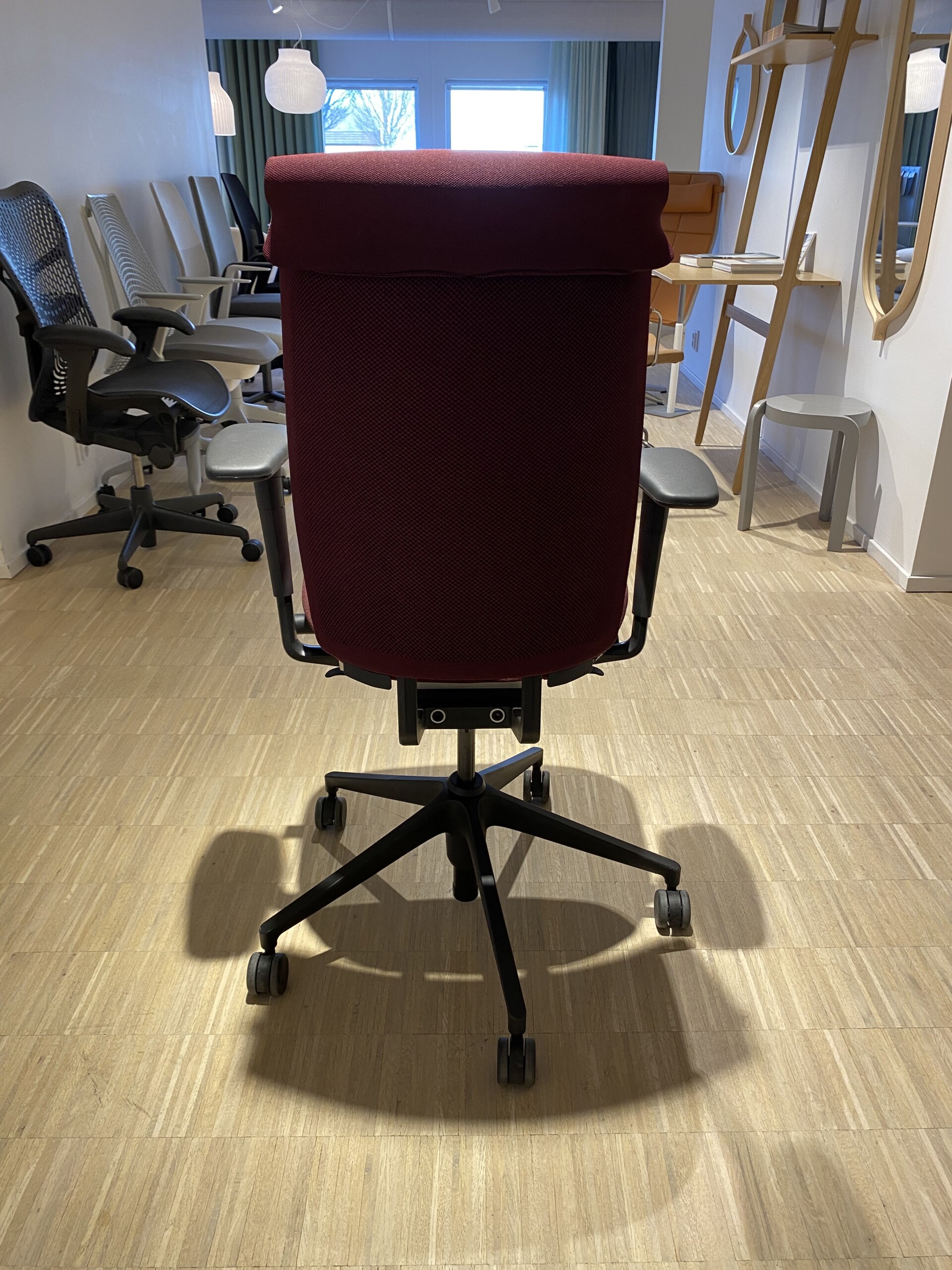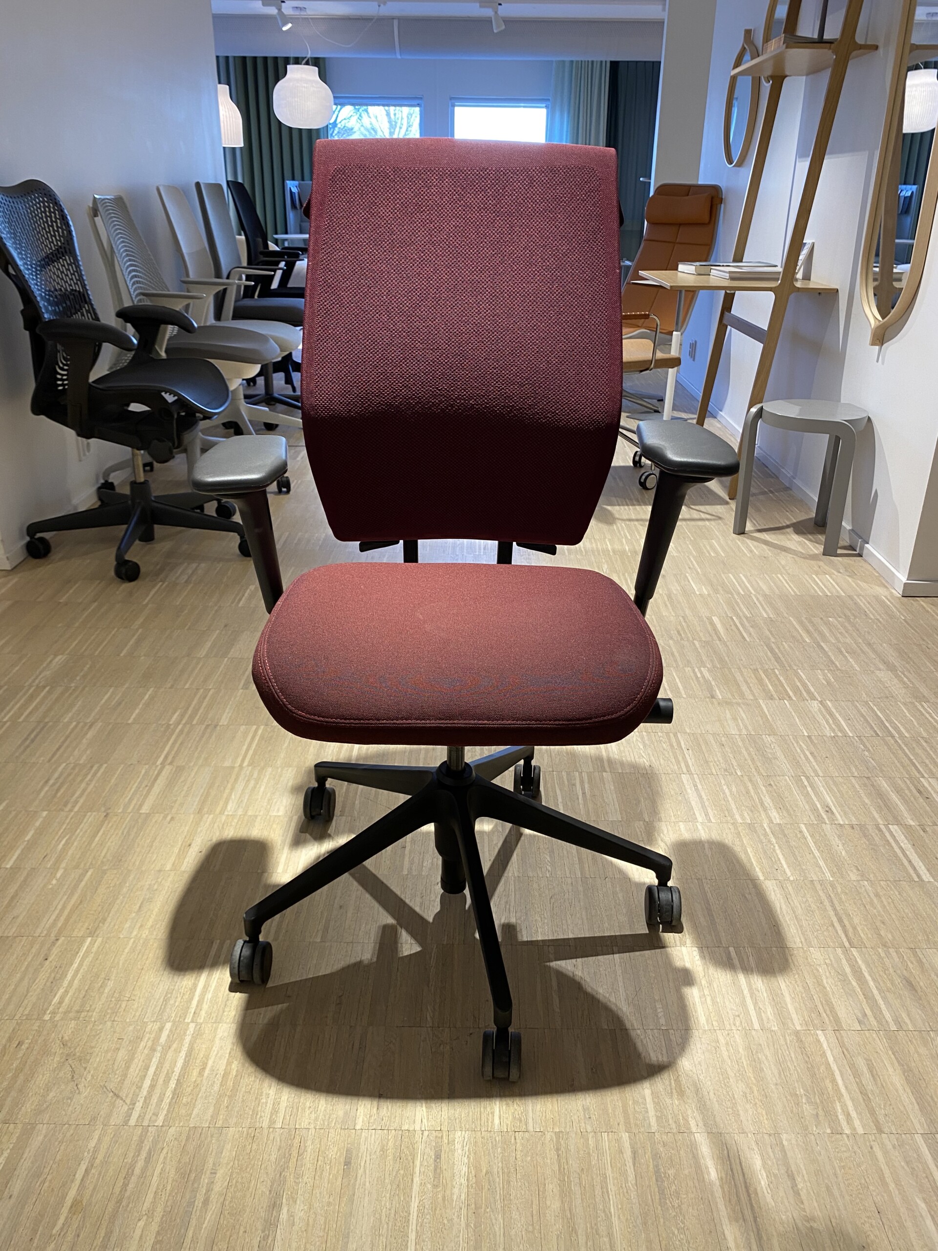 Seat in fabric (red). Backrest in mesh (red). Star base in plastic (black). Adjustable height.
