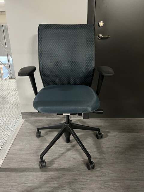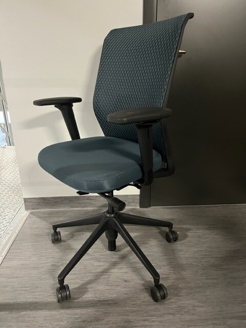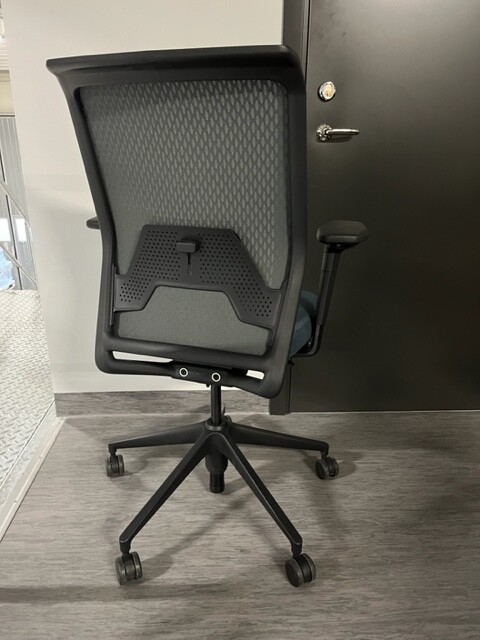 Seat in fabric (blue). Backrest in mesh (blue). Star base in metal (black). Adjustable height.