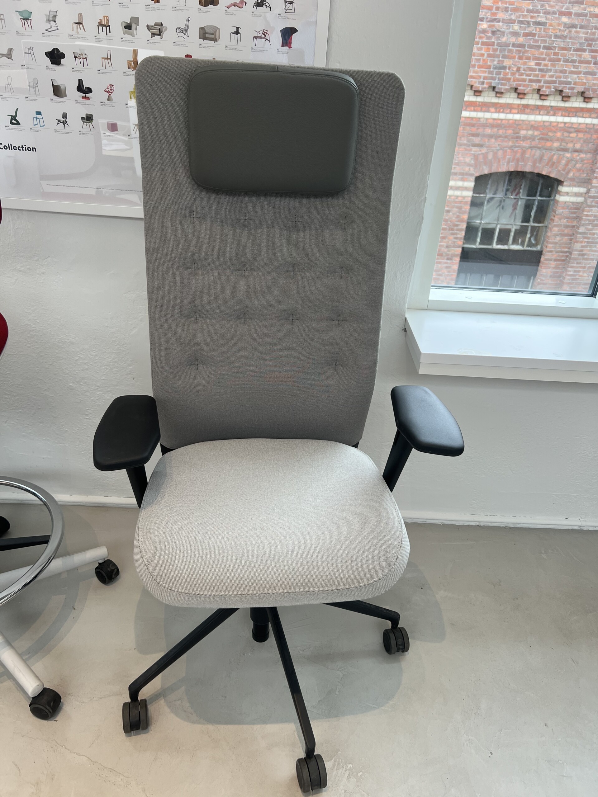 Seat and backrest in fabric (grey). Star base in metal (black). Adjustable height.