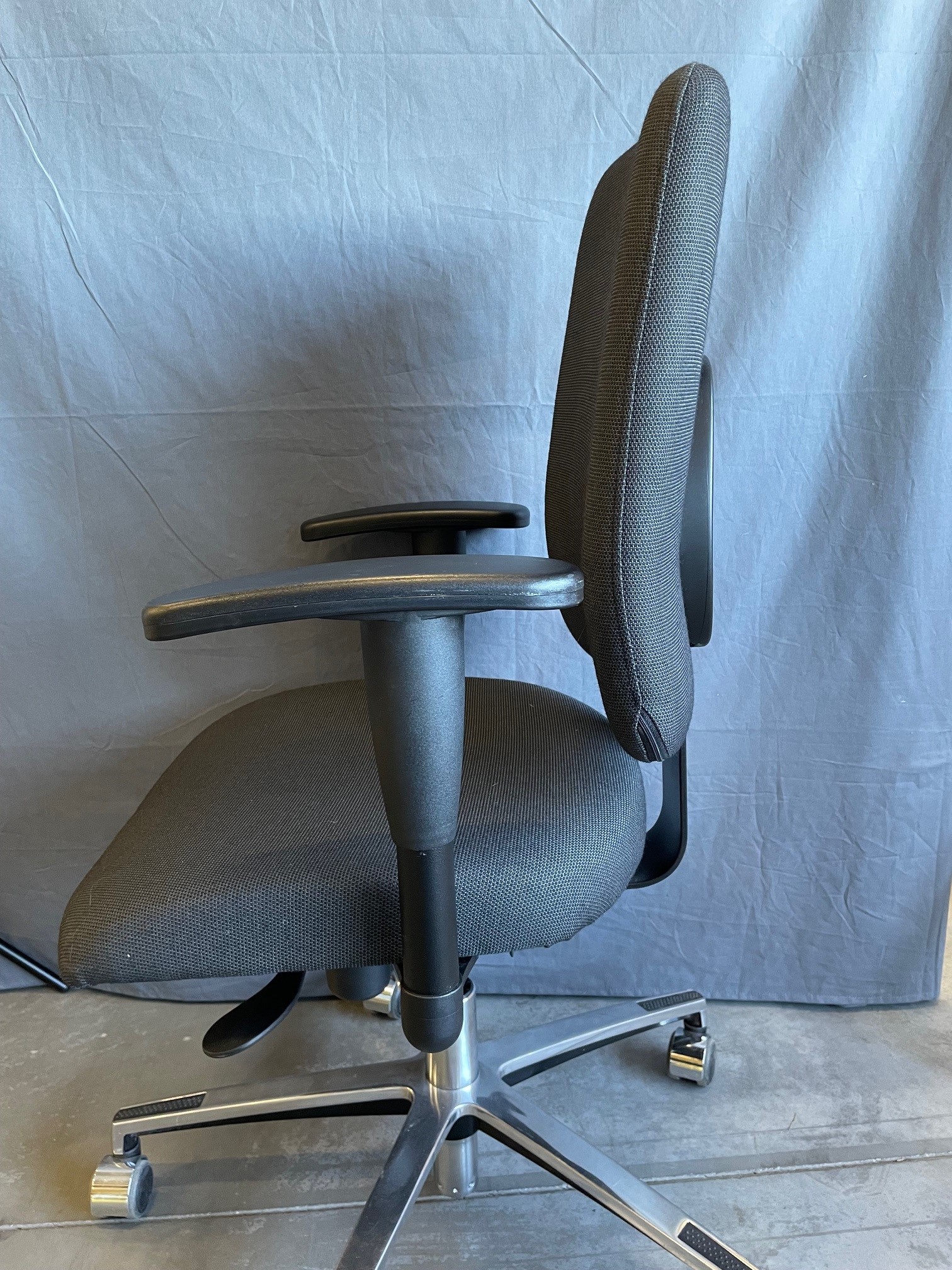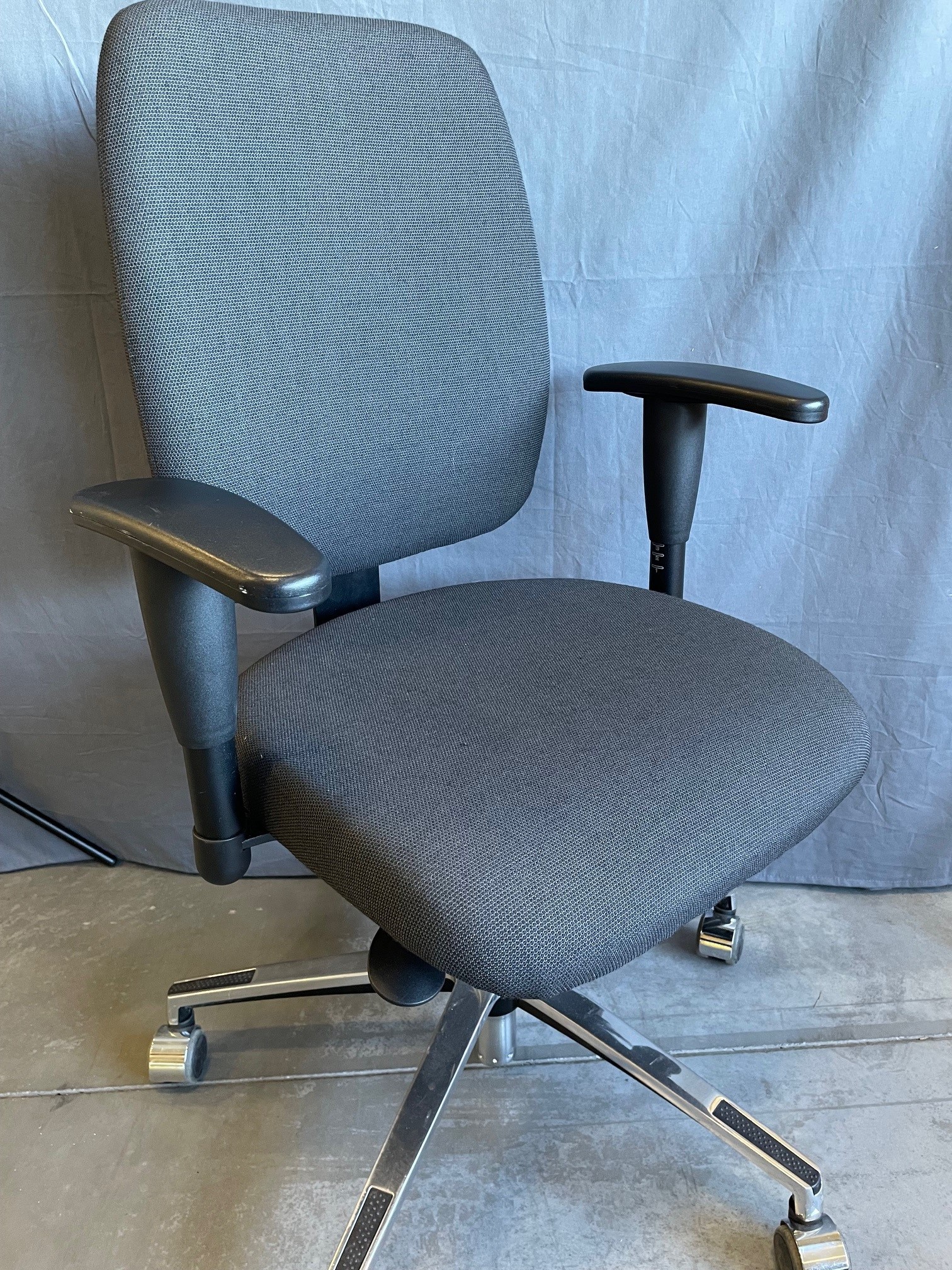 Seat and backrest in fabric (grey). Star base in metal (aluminium). Adjustable height.