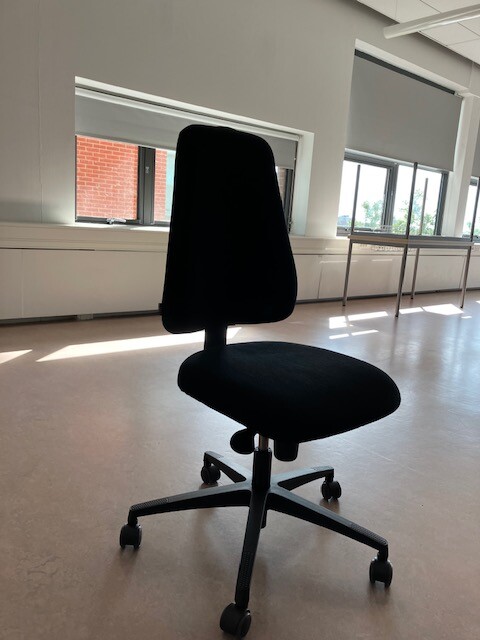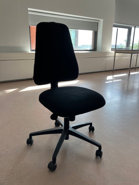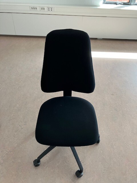 Seat and backrest in fabric (black). Star base in plastic (black). Adjustable height.