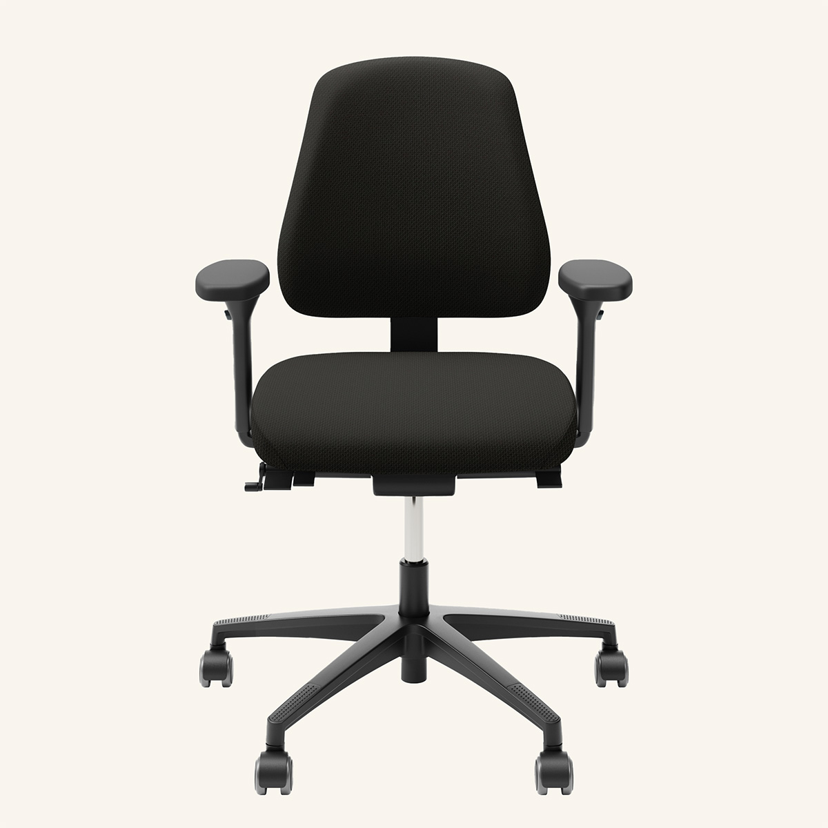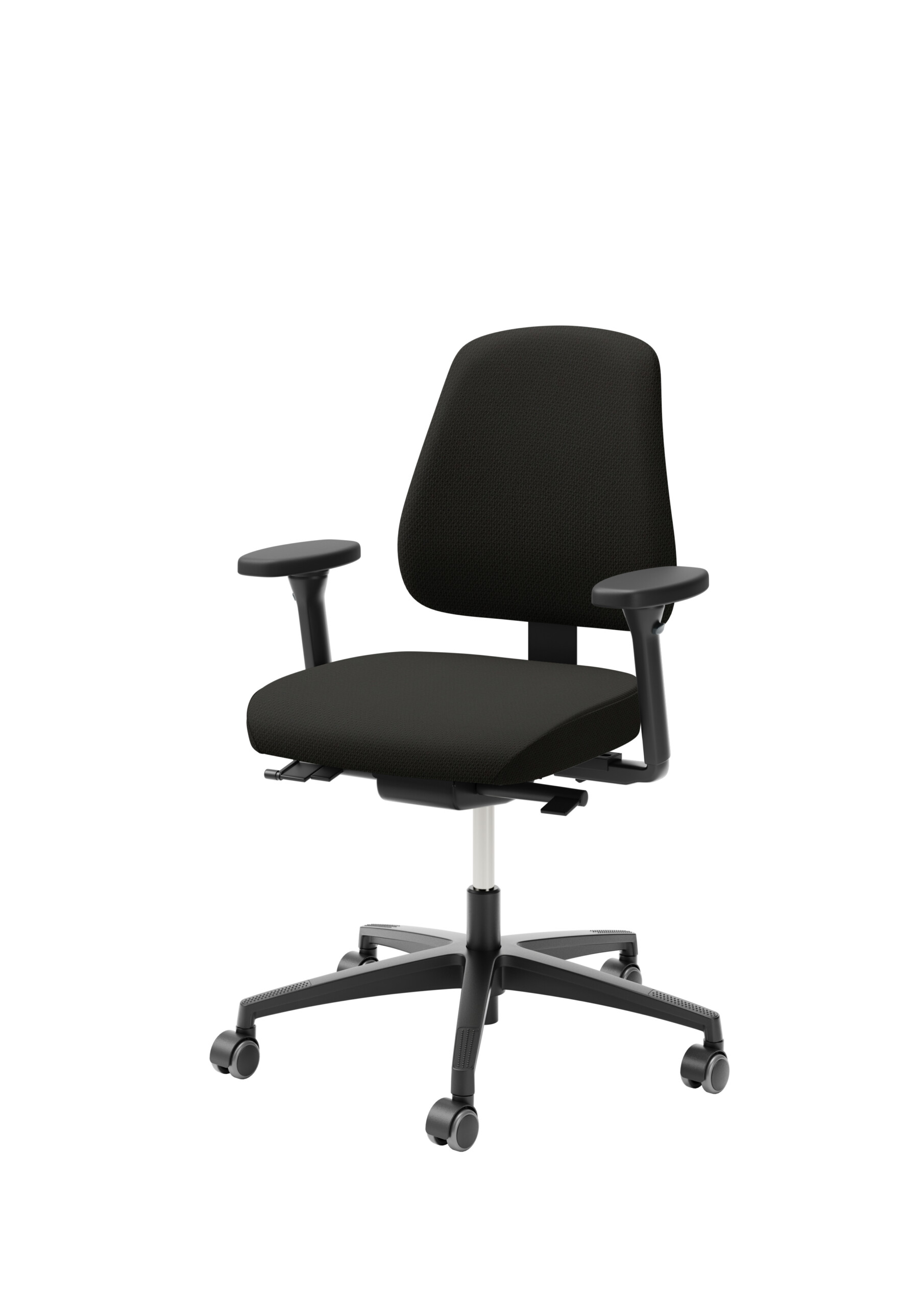 Seat and backrest in fabric (black). Star base in plastic (black). Adjustable height.