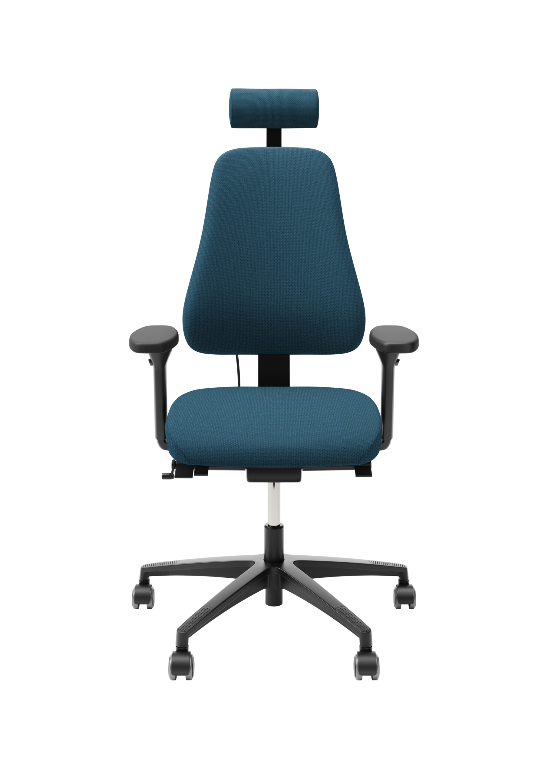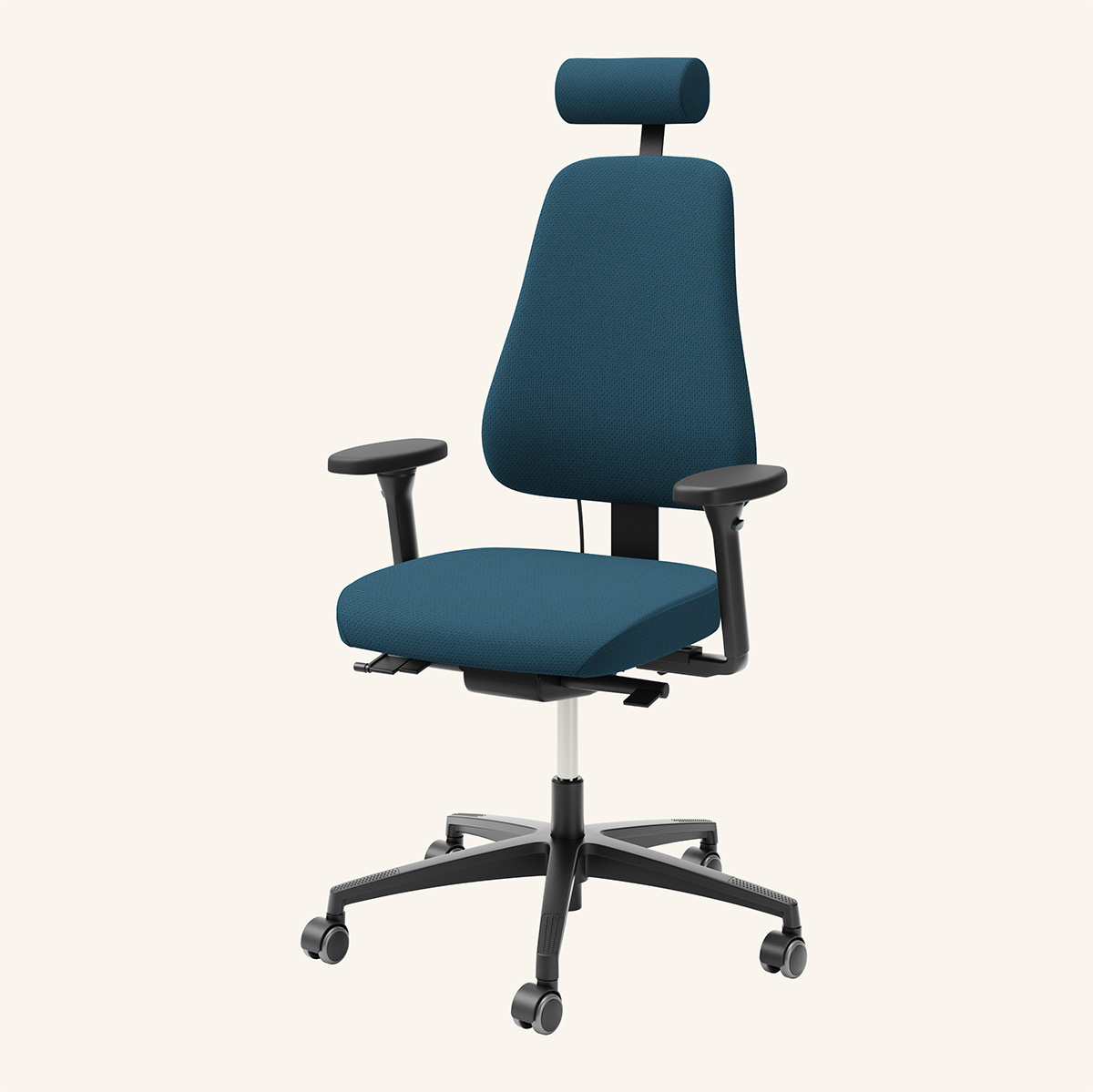 Seat and backrest in fabric (blue). Star base in plastic (black). Adjustable height.
