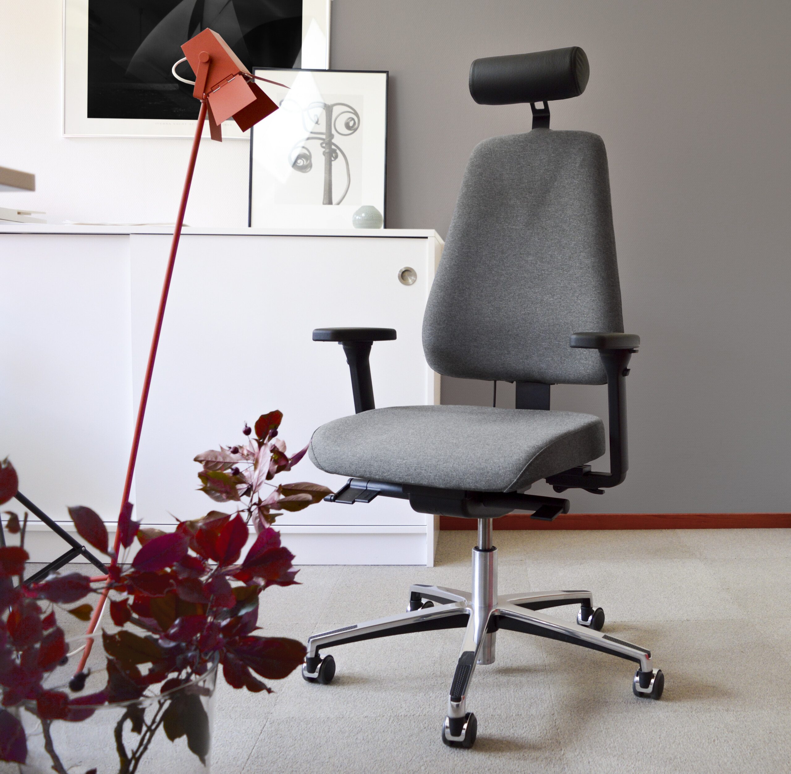 Seat and backrest in fabric (grey). Star base in metal (chrome). Adjustable height.