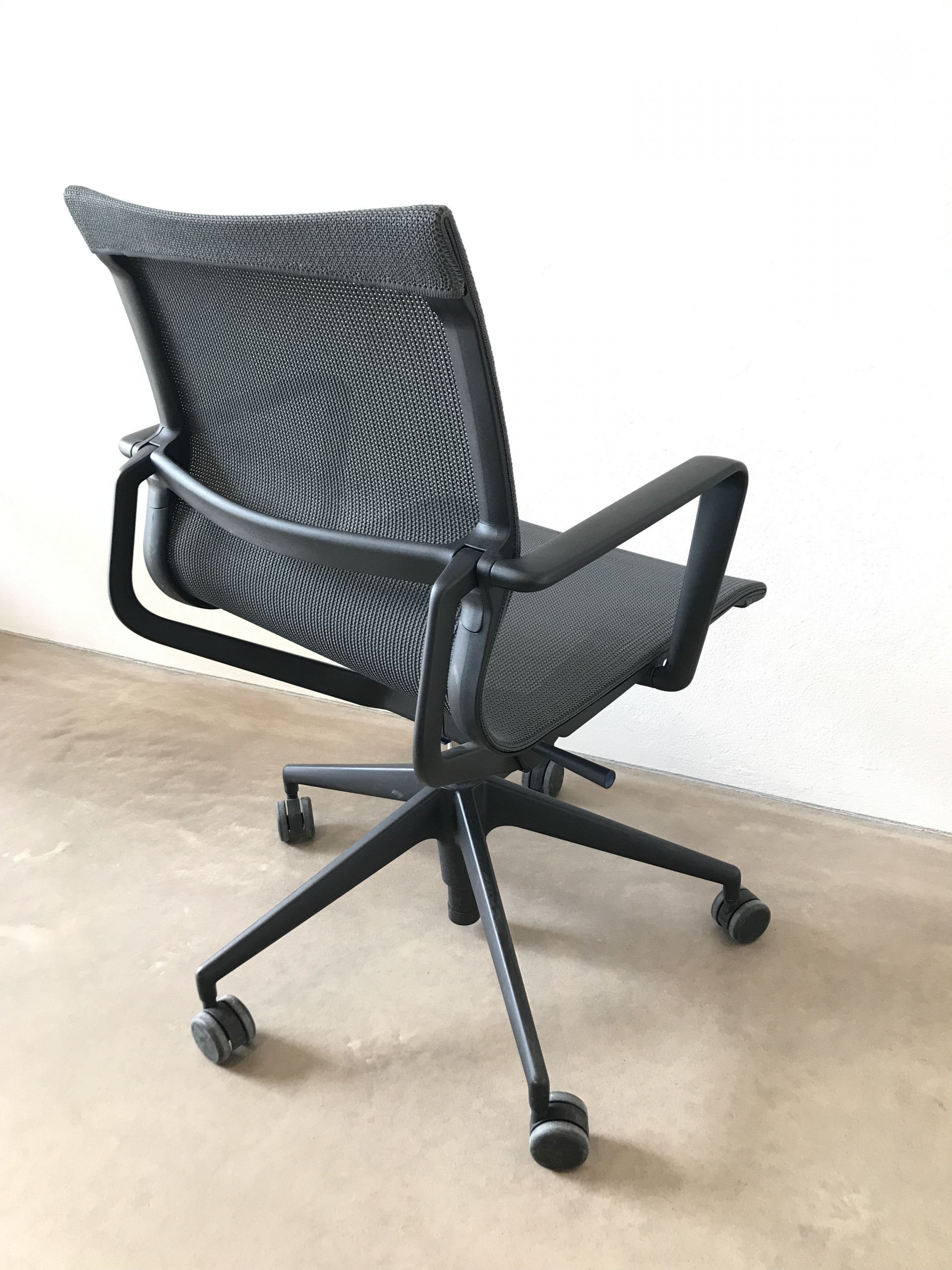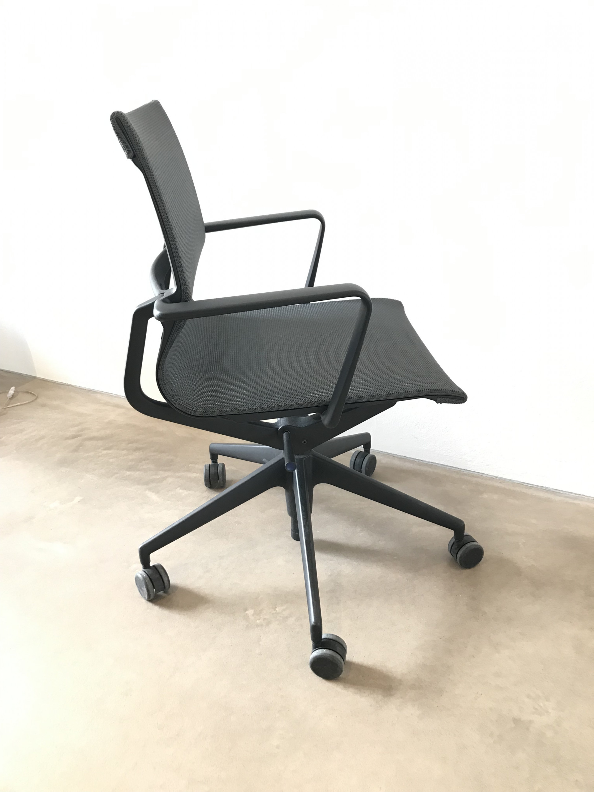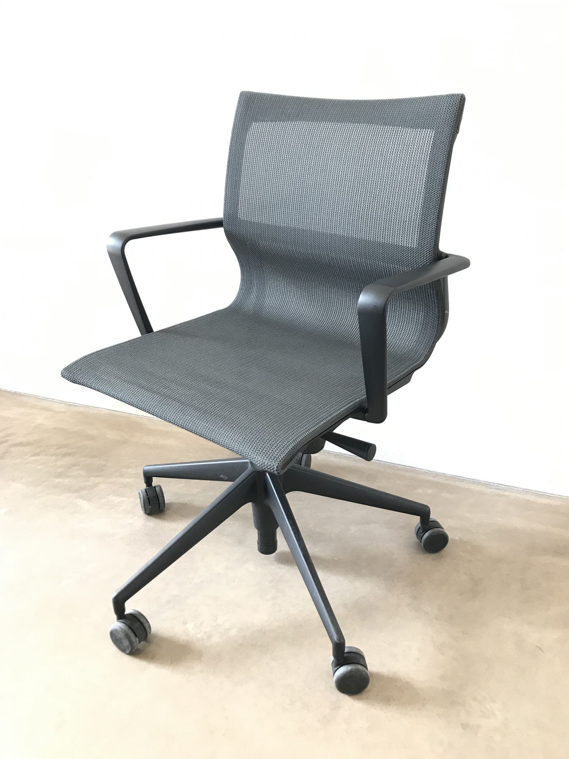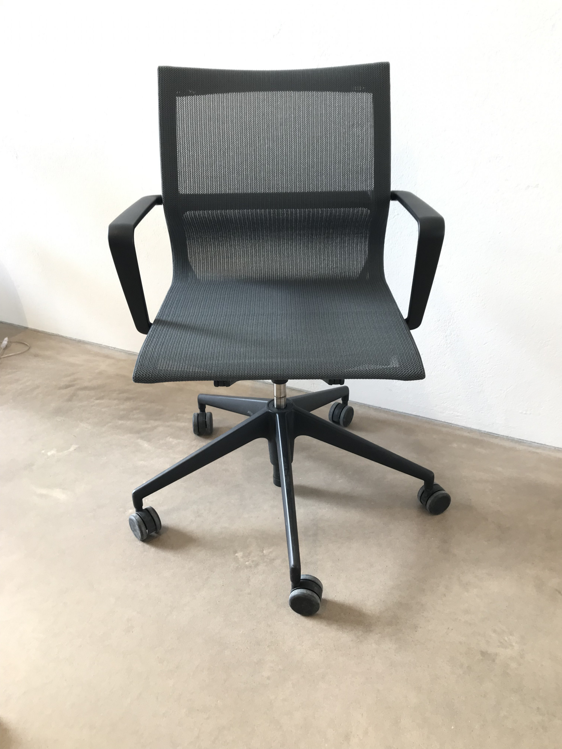 Seat and backrest in mesh (grey). Star base in plastic (black). Adjustable height.