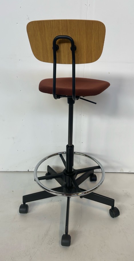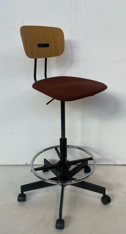 Seat in fabric (brown). Backrest in wood (oak). Star base in metal (black). Adjustable height.