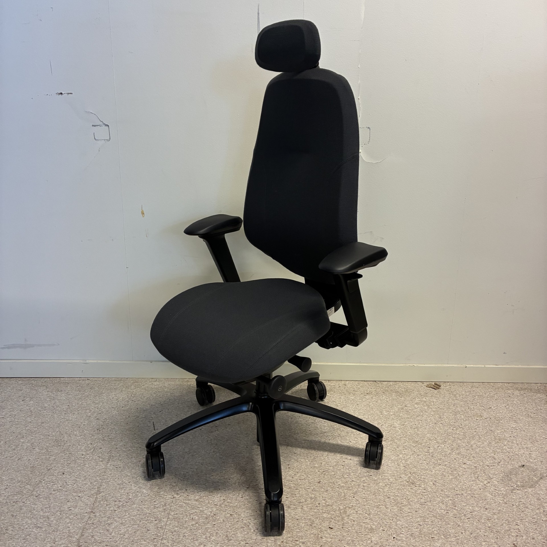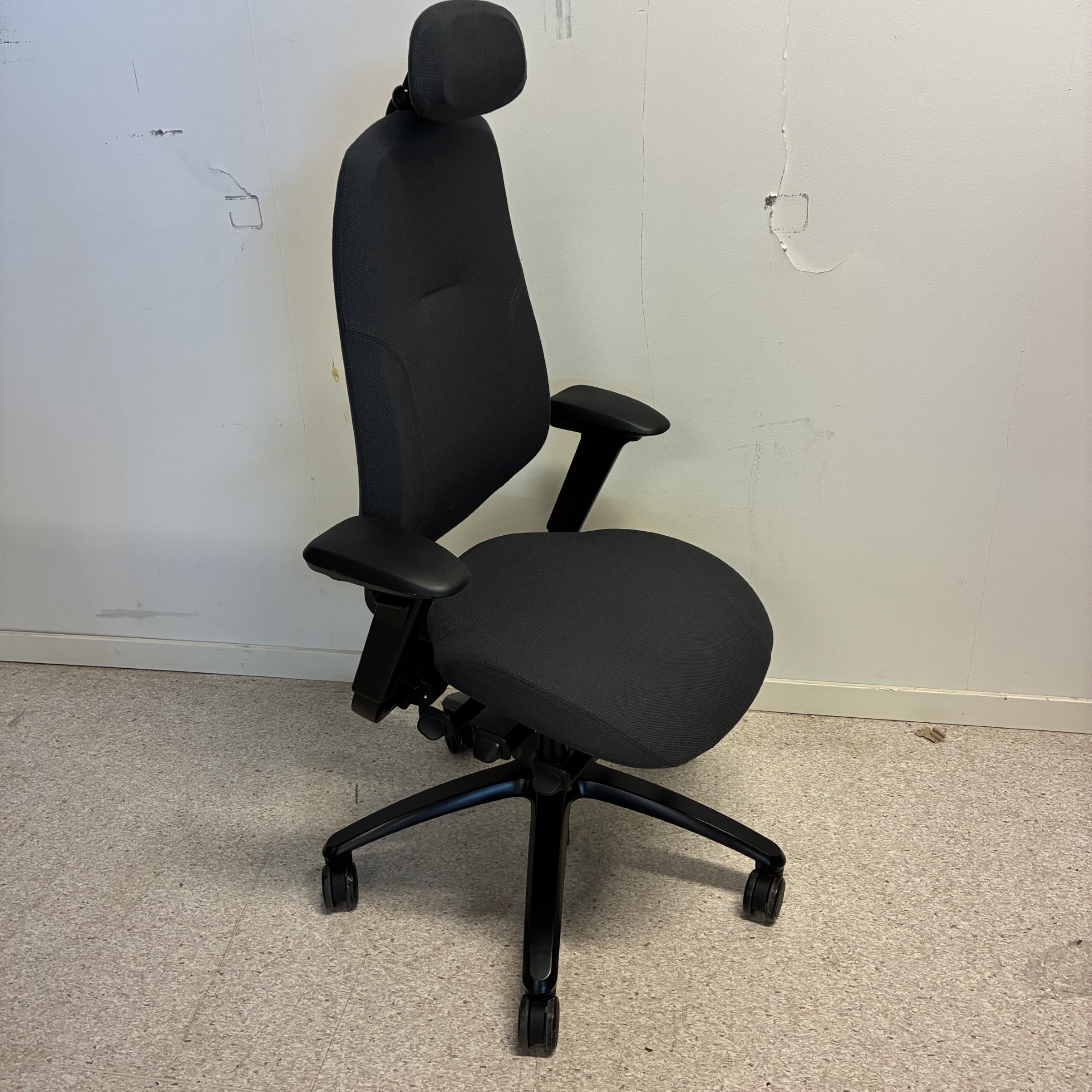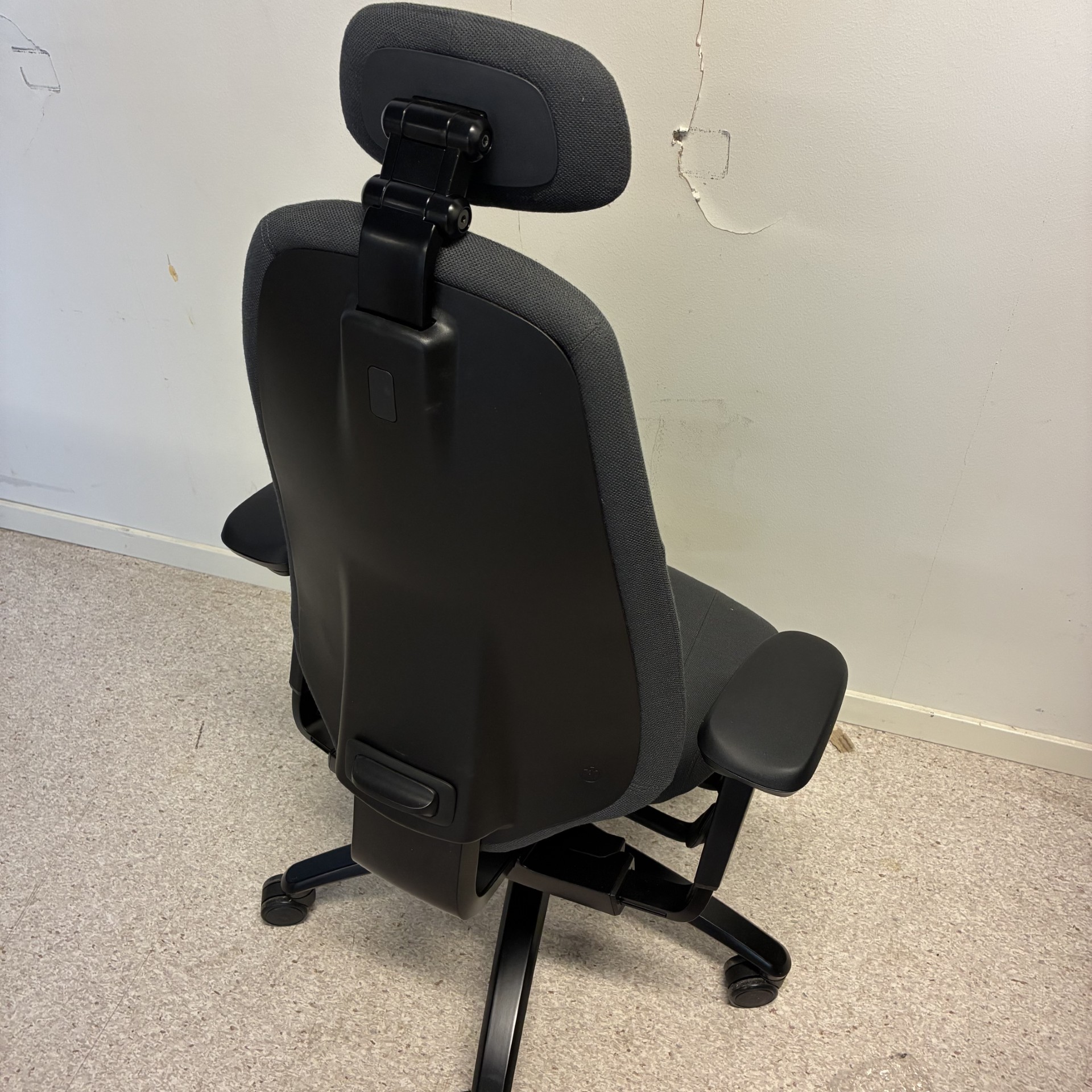 Seat and backrest in fabric (grey). Star base in metal (black). Adjustable height.