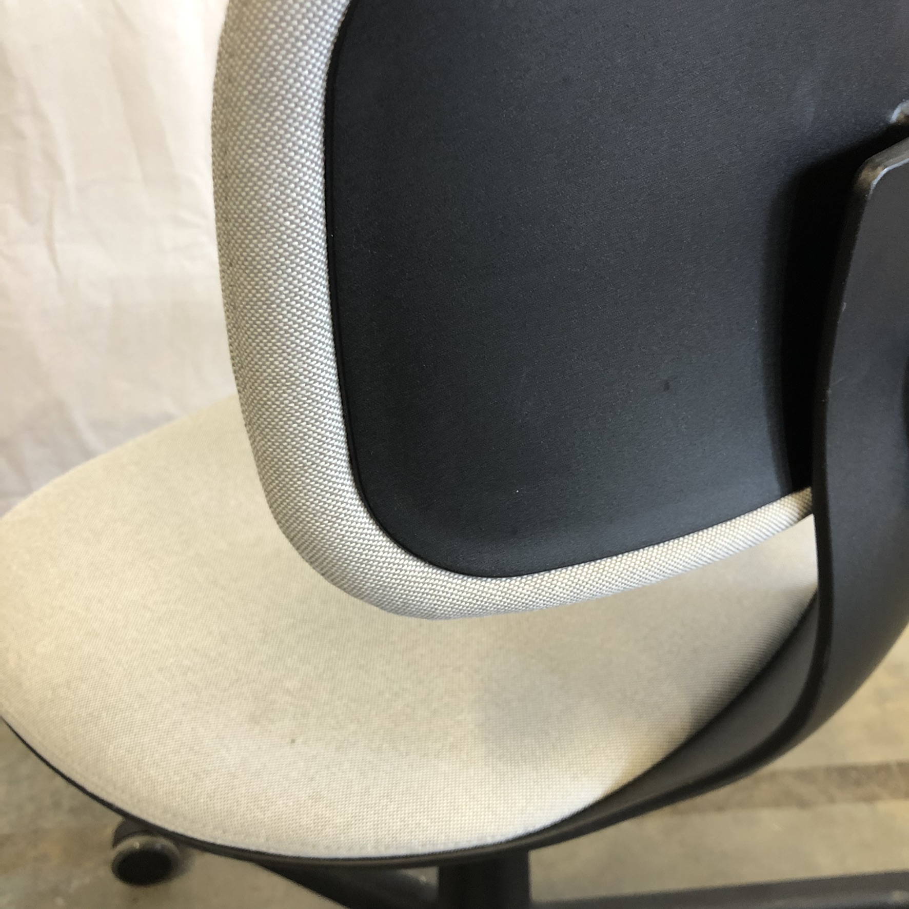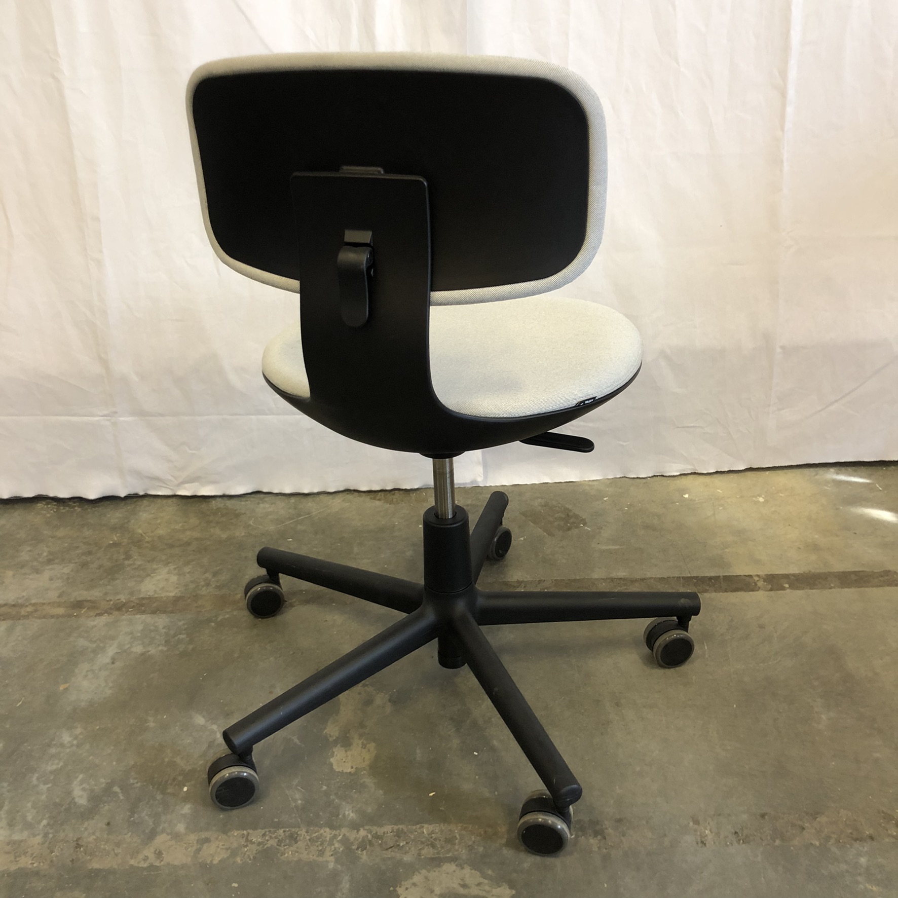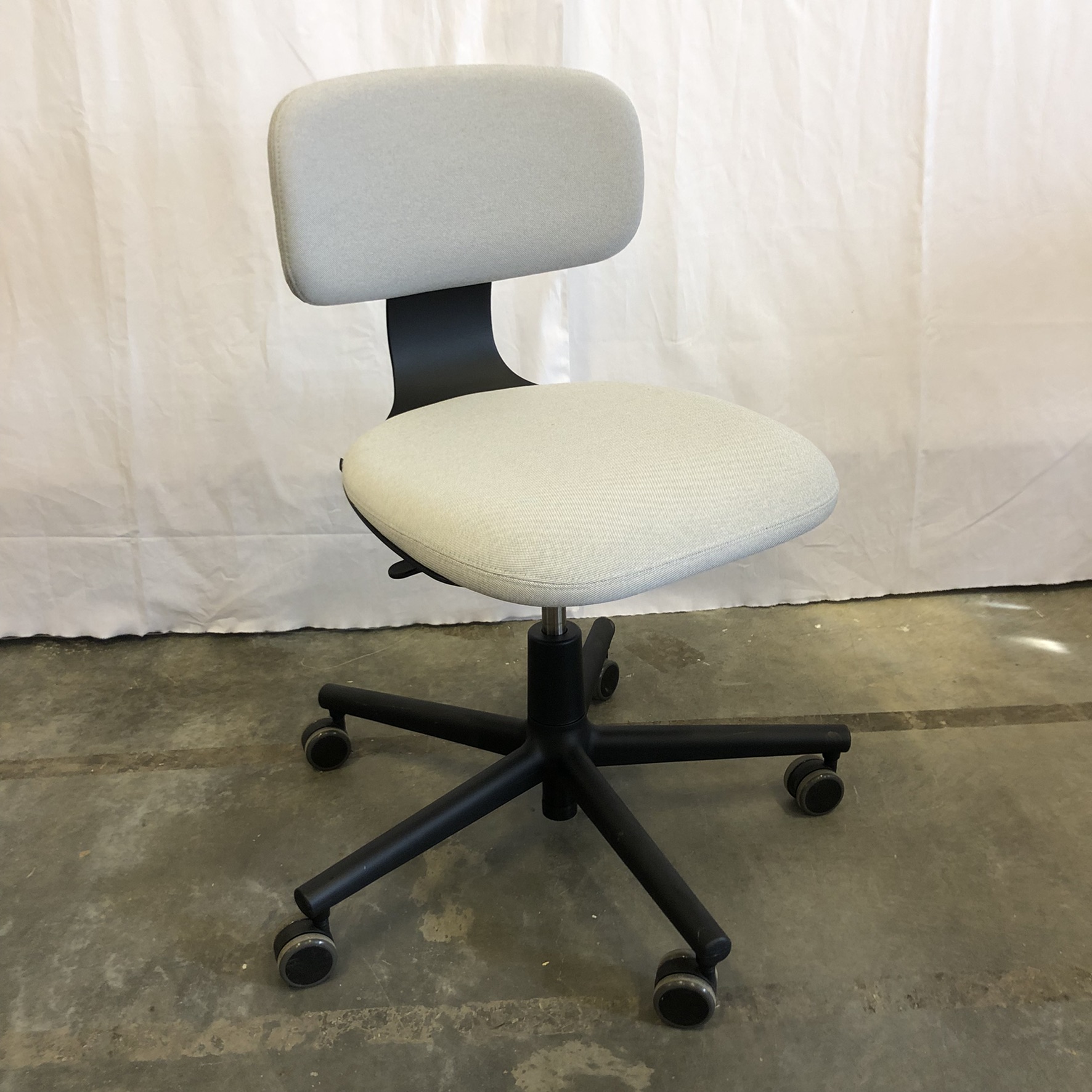 Seat and backrest in fabric (beige). Star base in plastic (black). Adjustable height.
